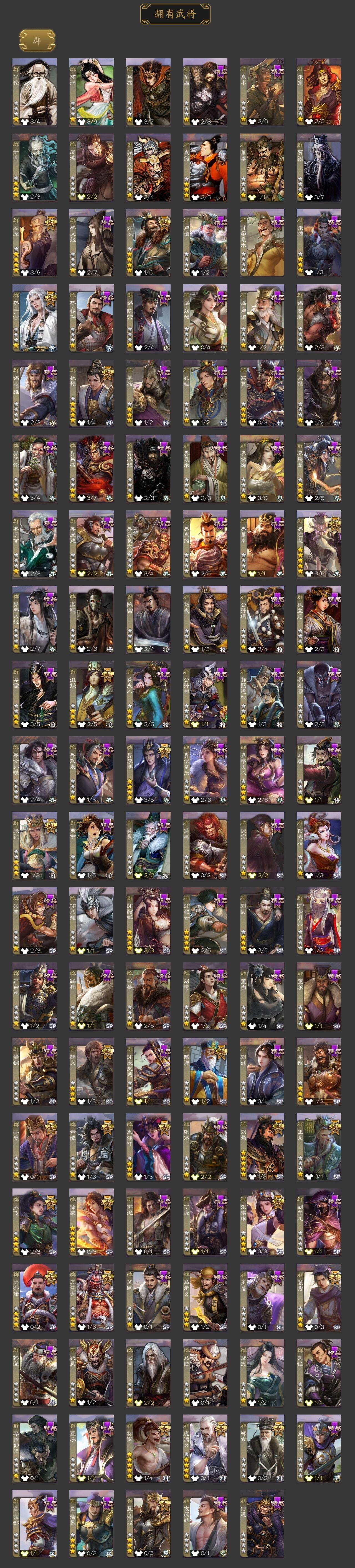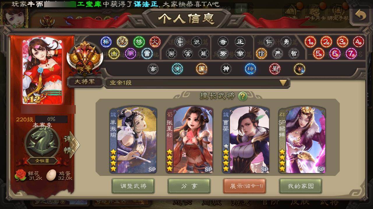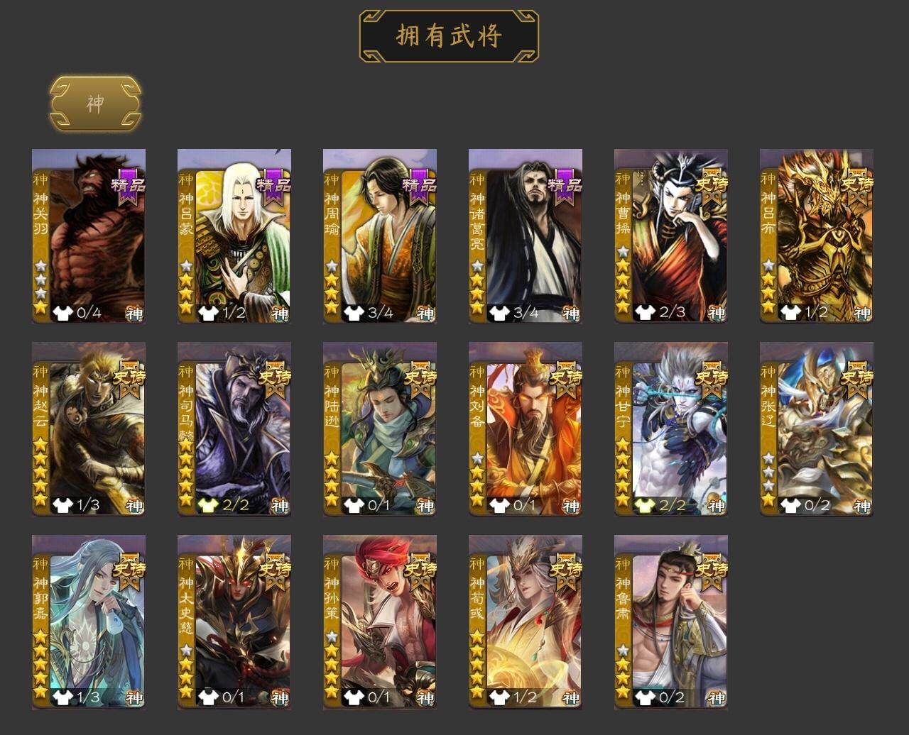 [15182093]【815】官阶:大将军;vip等级:vip12;史诗武将数量:80;动态皮肤数量:67;武将总数:463;史诗宝珠数量:37;将魂数量:13943;神将:17;魏国史诗武将:50;蜀国史诗武将:13;吴国史诗武将:9;群史诗武将:25 神曹操神吕布神赵云神司马懿神陆逊神刘备神甘宁神张辽神郭嘉神太史慈神孙策神荀彧神关羽神吕蒙神周瑜神诸葛亮神鲁肃sp司马昭王粲杨修羊徽瑜文鸯王元姬王凌马钧界钟会界于禁界曹真嵇康郝昭陈琳曹婴曹纯戏志才刘晔清河公主关索马云騄谋赵云谋马超诸葛瞻周群赵襄张星彩王平沙摩柯谯周界黄忠董允周处吴景孙皓骆统留赞界朱然界徐盛界步练师贺齐裴秀左慈郑玄张让张琪瑛徐荣星黄忠王允陶谦苏飞审配麹义庞德公祢衡刘焉沮授界左慈界李儒公孙康杜预卑弥呼张绣李傕许攸势于吉神郭嘉-虎年清明动态神荀彧-虎年清明动态神甘宁-战破无间神甘宁-万人辟易动态神诸葛亮-风舞魔鸟动态神吕蒙-兼资文武动态神周瑜-陵光引灵动态神周瑜-焰腾麒麟动态神诸葛亮-观星唤雨神诸葛亮-孟章诛邪动态神司马懿-徐图大略神曹操-天下归心神曹操-玄天通冥动态神吕布-监兵噬魅动态神赵云-战龙在野动态神司马懿-鉴往知来动态sp蔡文姬-兔年冬日动态司马懿-鹰视狼顾动态张辽-登峰陷阵动态郭嘉-十胜十败动态曹丕-猪年端午动态邓艾-神兵天降动态王基-独秉固志动态郝昭-死守陈仓动态王粲-笔翰如流动态界司马懿-鹰视狼顾动态界张辽-登峰陷阵动态界郭嘉-十胜十败动态界曹丕-猪年端午动态界邓艾-神兵天降动态张春华-牛年立冬动态张春华-宣穆夜袭动态王异-轻燕掠影动态曹真-虎年春节动态钟繇-稳定关右动态界王异-轻燕掠影动态辛宪英-鼠年春节动态戏志才-举棋若定动态曹婴-锋芒毕露动态羊徽瑜-牛年中秋动态清河公主-魅影萦心动态卧龙诸葛-龙跃凤鸣动态刘备-猪年圣诞动态刘备-明良千古动态关羽-啸风从龙动态马超-牛年春节动态马超-西凉