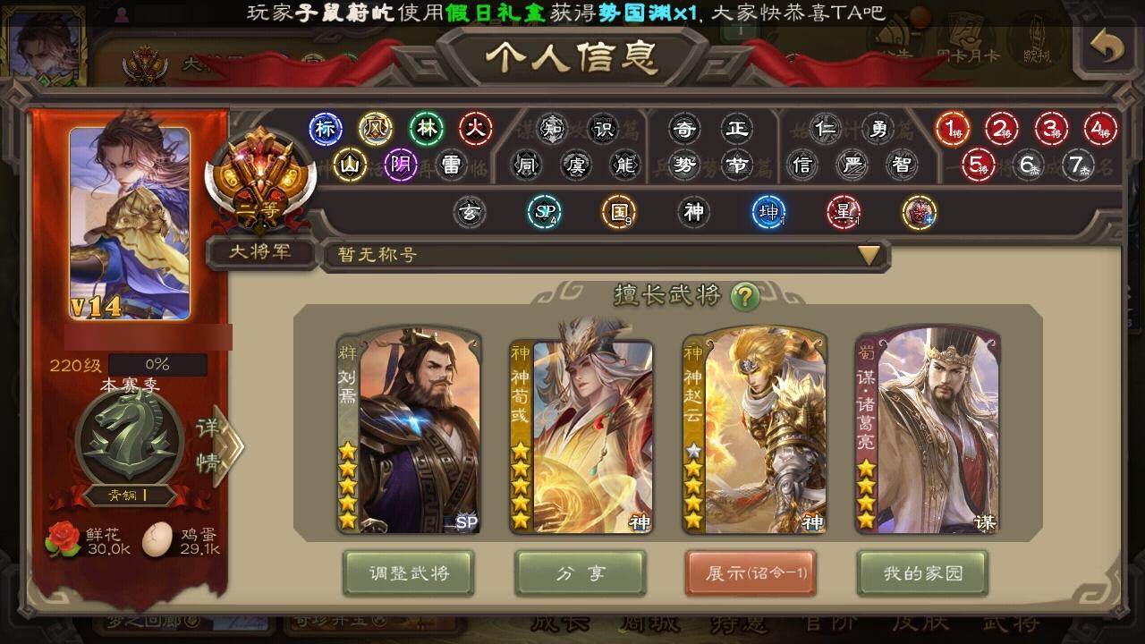 [15182125]【94】官阶:大将军;vip等级:vip14;史诗武将数量:65;动态皮肤数量:40;武将总数:422;史诗宝珠数量:0;将魂数量:1545;神将:14;魏国史诗武将:17;蜀国史诗武将:13;吴国史诗武将:8;群史诗武将:20 神吕布神赵云神陆逊神刘备神甘宁神张辽神郭嘉神太史慈神孙策神荀彧神关羽神吕蒙神周瑜神诸葛亮sp司马昭张昌蒲杨修文鸯王凌马钧界钟会界于禁界曹真郝昭陈琳曹纯戏志才关索谋诸葛亮马云騄谋黄忠谋赵云谋马超周群张星彩王平沙摩柯谯周界黄忠花鬘吴景孙寒华骆统留赞界朱然界徐盛界步练师贺齐皇甫嵩左慈杨彪徐荣星黄忠星甘宁陶谦苏飞麹义南华老仙祢衡刘璋刘焉沮授界左慈公孙康杜预张绣李傕许攸神孙策-霸王再世动态神荀彧-虎年清明动态神甘宁-万人辟易动态神陆逊-绽焰摧枯动态神吕布-冠绝天下动态神赵云-战龙在野动态曹丕-龙年中秋动态许褚-虎啸生风动态邓艾-神兵天降动态界许褚-虎啸生风动态于禁-威严毅重动态钟会-谋谟之勋动态界于禁-威严毅重动态界钟会-谋谟之勋动态戏志才-举棋若定动态关羽-明良千古动态马超-明良千古动态张飞-明良千古动态赵云-截江救主动态赵云-明亮千古动态黄月英-虎年中秋动态诸葛亮-虎年中秋动态诸葛亮-明良千古动态界赵云-截江救主动态界诸葛亮-明良千古动态夏侯氏-明良千古动态马云騄-明良千古动态张星彩-虎年端午动态关索-虎年七夕动态鲍三娘-虎年七夕动态诸葛果-虎年中秋动态胡金定-明良千古动态太史慈-涤荡江东动态陆逊-龙年七夕动态孙权-牛年七夕动态孙权-冠绝天下动态大乔-绝世之姿动态孙策-长沙桓王动态小乔-如花似朵动态周妃-笼中箜响动态界大乔-绝世之姿动态界孙权-牛年七夕动态界小乔-如花似朵动态界孙策-长沙恒王动态徐盛-破军杀将动态步练师-牛年七夕动态朱然-剑舞枫飞动态界步练师-牛年七夕动态孙鲁育-猪年春节动态孙茹-烟水悠悠动态刘赞-灵