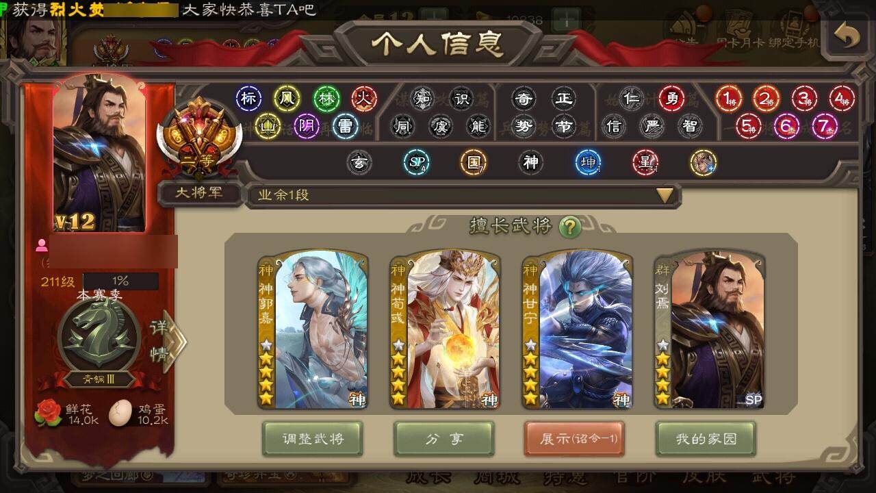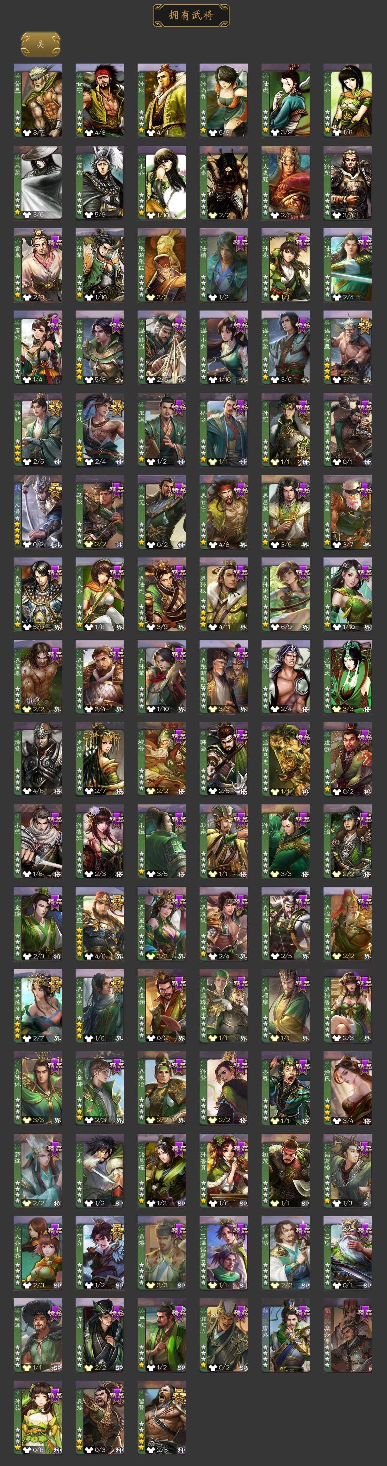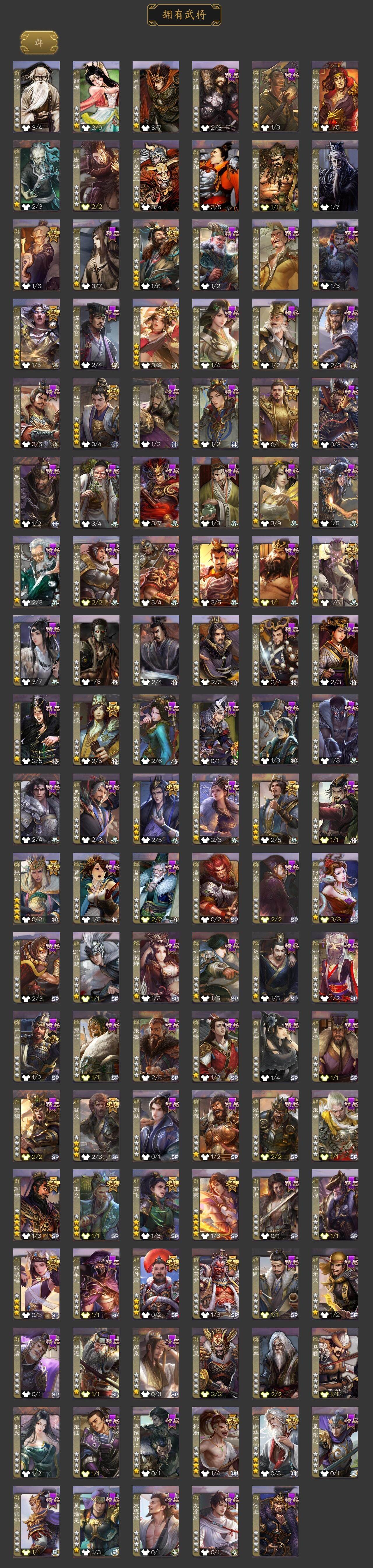 [15182166]【334】官阶:大将军;vip等级:vip12;史诗武将数量:72;动态皮肤数量:50;武将总数:441;史诗宝珠数量:43;将魂数量:9846;神将:12;魏国史诗武将:39;蜀国史诗武将:14;吴国史诗武将:8;群史诗武将:24 神吕布神赵云神陆逊神甘宁神张辽神郭嘉神太史慈神孙策神荀彧神吕蒙神周瑜神诸葛亮曹髦星周不疑王粲杨修羊徽瑜文鸯王元姬王凌王朗马钧界钟会界于禁界曹真嵇康郝昭曹婴曹纯戏志才刘晔关索马云騄谋夏侯氏谋赵云谋马超诸葛瞻周群赵襄张星彩王平沙摩柯谯周花鬘董允谋黄盖周处骆统留赞界朱然界徐盛界步练师贺齐谋貂蝉界沮授左慈张让张琪瑛徐荣王允苏飞麹义南华老仙祢衡刘璋刘焉沮授界左慈界李儒公孙康杜预谋张角张绣李傕阎象许攸友徐庶神郭嘉-虎年清明动态神荀彧-虎年清明动态神甘宁-万人辟易动态神诸葛亮-风舞魔鸟动态神曹操-天下归心神赵云-战龙在野动态星周不疑-才广志宏动态张昌蒲-龙年端午(动态)曹丕-气荡山河(动态)甄姬-明珠耀躯(动态)sp蔡文姬-兔年冬日动态许褚-虎啸生风动态司马懿-牛年立冬动态荀彧-驱虎吞狼动态邓艾-神兵天降动态界司马懿-牛年立冬动态界许褚-虎啸生风动态界邓艾-神兵天降动态钟会-谋谟之勋动态界钟会-谋谟之勋动态曹昂-竭战麟伤动态戏志才-举棋若定动态曹婴-兔年春节动态朱灵-以战破氐动态曹纯-虎年春节动态曹纯-长坂败备动态马钧-能工巧匠动态刘备-龙御天下动态卧龙诸葛-龙跃凤鸣动态费祎-安民护祚(动态)关羽-明良千古动态马超-牛年春节动态诸葛瞻-绵竹之殇动态界马超-牛年春节动态夏侯氏-明良千古动态关银屏-兔年春节动态马云騄-牛年春节动态赵襄-猪年春节动态鲍三娘-虎年七夕动态李丰-太仓聚粟动态胡金定-明良千古动态周处-义除三害动态吕蒙-剑起惊澜动态孙权-永开吴祚动态周瑜-兔年七夕动态孙权-猪年端午动态孙尚香-兔年春节动态周瑜-鼠年春节动态界周瑜-