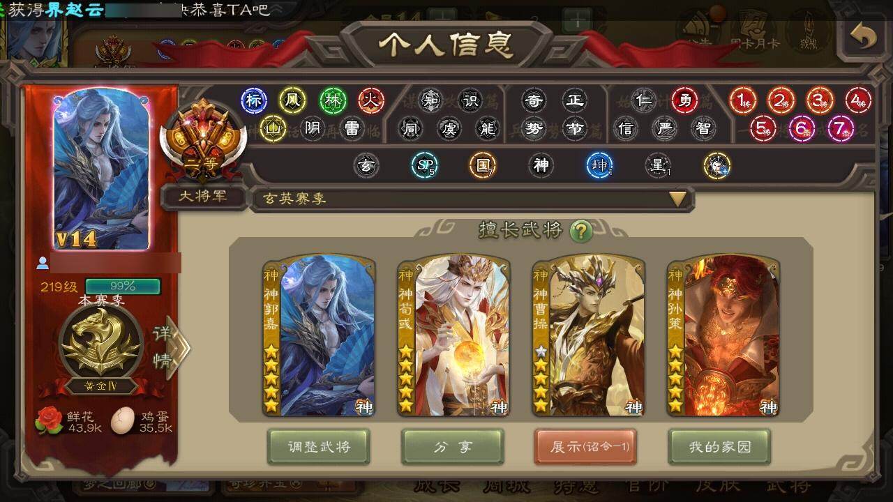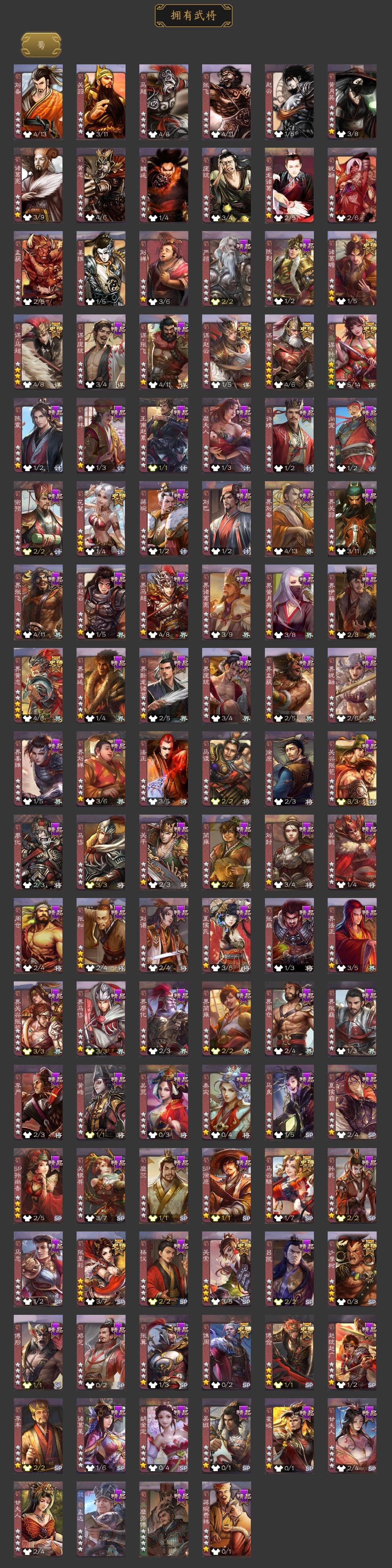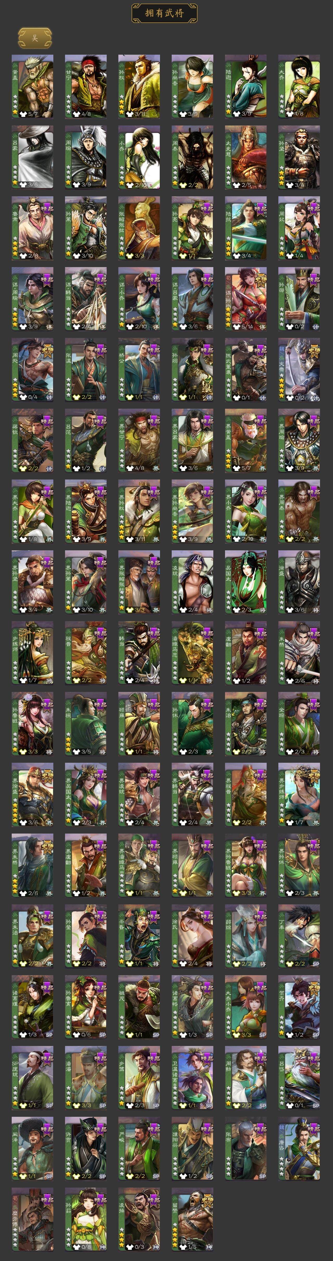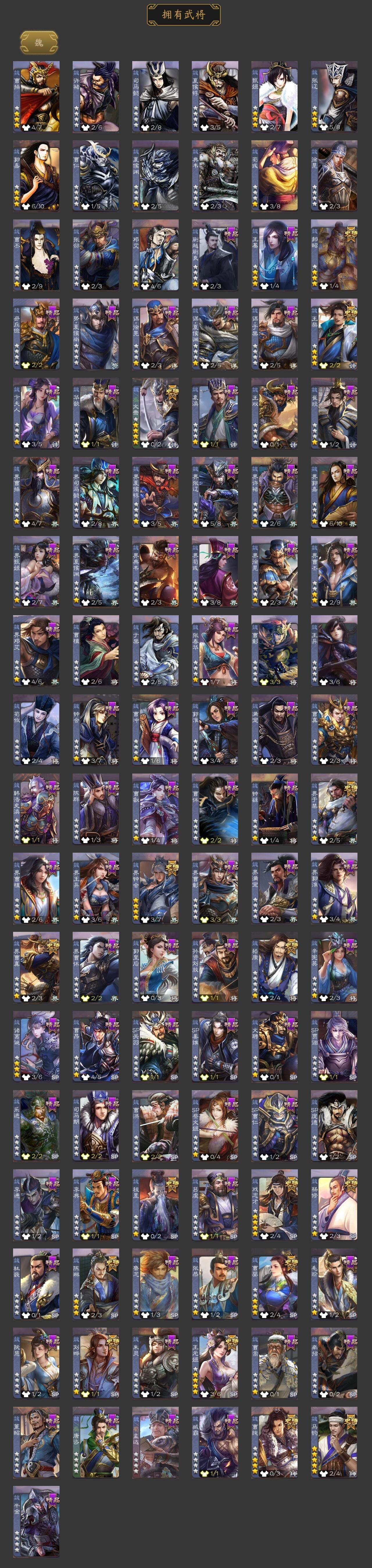 [15182183]【655】官阶:大将军;vip等级:vip14;史诗武将数量:62;动态皮肤数量:50;武将总数:436;史诗宝珠数量:0;将魂数量:1827;神将:14;魏国史诗武将:33;蜀国史诗武将:14;吴国史诗武将:6;群史诗武将:17 神曹操神吕布神赵云神刘备神甘宁神张辽神郭嘉神太史慈神孙策神荀彧神关羽神吕蒙神周瑜神诸葛亮王粲杨修文鸯王元姬马钧界钟会界于禁界曹真嵇康郝昭陈琳曹婴曹纯戏志才刘晔关索马云騄谋孙尚香谋黄忠谋赵云谋马超诸葛瞻张星彩沙摩柯谯周傅佥界黄忠花鬘周处留赞界朱然界徐盛界步练师贺齐界沮授左慈郑玄张让杨彪星甘宁陶谦苏飞麹义祢衡刘焉沮授界左慈界李儒杜预李傕许攸神郭嘉-虎年清明动态神郭嘉-倚星折月动态神孙策-霸王再世动态神荀彧-虎年清明动态神甘宁-万人辟易动态神吕蒙-兼资文武动态神周瑜-陵光引灵动态神诸葛亮-剑祭通天动态神曹操-玄天通冥动态神吕布-监兵噬魅动态神赵云-战龙在野动态sp司马昭-鼠年冬至(动态)张昌蒲-龙年端午(动态)钟会-龙年端午(动态)钟繇-安民护祚(动态)荀彧-驱虎吞狼动态邓艾-神兵天降动态王粲-笔翰如流动态界邓艾-神兵天降动态钟会-谋谟之勋动态界钟会-谋谟之勋动态辛宪英-鼠年春节动态曹昂-竭战麟伤动态戏志才-举棋若定动态曹婴-兔年春节动态曹婴-锋芒毕露动态朱灵-以战破氐动态马钧-能工巧匠动态王元姬-鼠年冬至动态卧龙诸葛-龙跃凤鸣动态关索-依心缱绻动态刘备-龙骧麟振动态马超-西凉雄狮动态马超-虎年冬至动态黄月英-鼠年春节动态黄忠-明良千古动态界刘备-龙骧麟振动态界马超-西凉雄狮动态界黄月英-鼠年春节动态sp孙尚香-明良千古动态关银屏-兔年春节动态张星彩-临军对阵动态关索-鼠年中秋动态李丰-太仓聚粟动态诸葛果-虎年中秋动态孙策-兔年清明动态周瑜-运筹帷幄动态黄盖-兔年端午动态小乔-猪年大雪动态界小乔-猪年大雪动态徐盛-破军杀将动态孙鲁