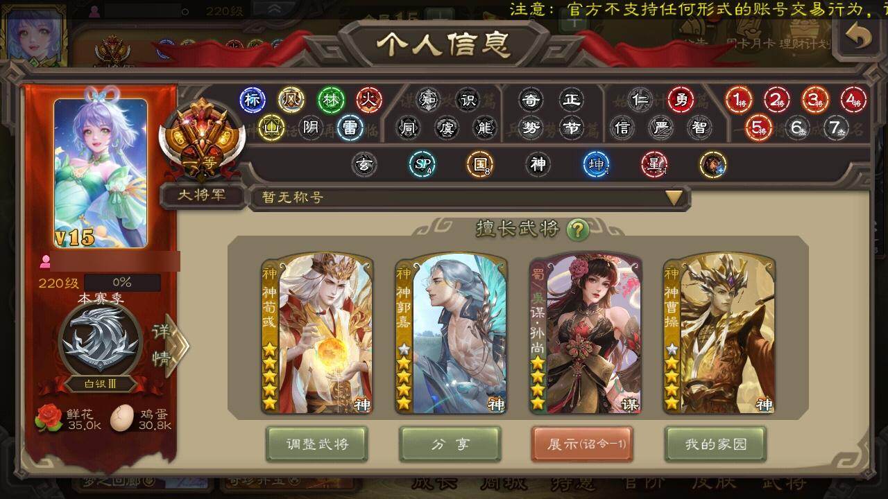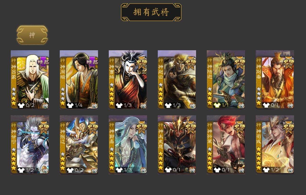 [15182333]【925】官阶:大将军;vip等级:vip15;史诗武将数量:71;动态皮肤数量:39;武将总数:437;史诗宝珠数量:0;将魂数量:1602;神将:12;魏国史诗武将:33;蜀国史诗武将:18;吴国史诗武将:9;群史诗武将:19 神曹操神赵云神陆逊神刘备神甘宁神张辽神郭嘉神太史慈神孙策神荀彧神吕蒙神周瑜张昌蒲王粲杨修文鸯王元姬王凌马钧界钟会界于禁界曹真嵇康郝昭陈琳曹婴曹纯戏志才马云騄谋孙尚香谋黄忠谋夏侯氏谋赵云谋马超诸葛瞻周群赵襄王平沙摩柯谯周傅佥界黄忠花鬘鲍三娘谋关羽周处孙皓孙寒华骆统留赞界朱然界徐盛界步练师贺齐皇甫嵩左慈郑玄张琪瑛杨彪星黄忠王允陶谦麹义南华老仙刘焉沮授界左慈界李儒公孙康杜预张绣李傕许攸神郭嘉-虎年清明动态神荀彧-虎年清明动态神甘宁-万人辟易动态神陆逊-绽焰摧枯动态神曹操-玄天通冥动态神吕布-监兵噬魅动态神赵云-战龙在野动态sp司马昭-鼠年冬至(动态)曹植-龙年中秋动态荀彧-驱虎吞狼动态王粲-笔翰如流动态张春华-雪中舞刃动态钟会-谋谟之勋动态曹真-虎年春节动态界钟会-谋谟之勋动态戏志才-举棋若定动态曹婴-兔年春节动态曹婴-锋芒毕露动态朱灵-以战破氐动态曹纯-虎年春节动态马钧-能工巧匠动态王元姬-鼠年冬至动态羊徽瑜-牛年中秋动态司马师-牛年中秋动态刘备-猪年圣诞动态关羽-明良千古动态马超-虎年冬至动态张飞-明良千古动态赵云-明亮千古动态黄月英-虎年中秋动态黄月英-明良千古动态诸葛亮-虎年中秋动态诸葛亮-明良千古动态黄忠-明良千古动态魏延-麒麟生角动态界刘备-猪年圣诞动态界诸葛亮-明良千古动态界黄月英-明良千古动态界魏延-麒麟生角动态夏侯氏-明良千古动态sp孙尚香-猪年圣诞动态sp孙尚香-明良千古动态马云騄-明良千古动态关索-虎年七夕动态鲍三娘-虎年七夕动态鲍三娘-柳娇桃艳动态鲍三娘-嫣然一笑动态诸葛果-虎年中秋动态胡金定-明