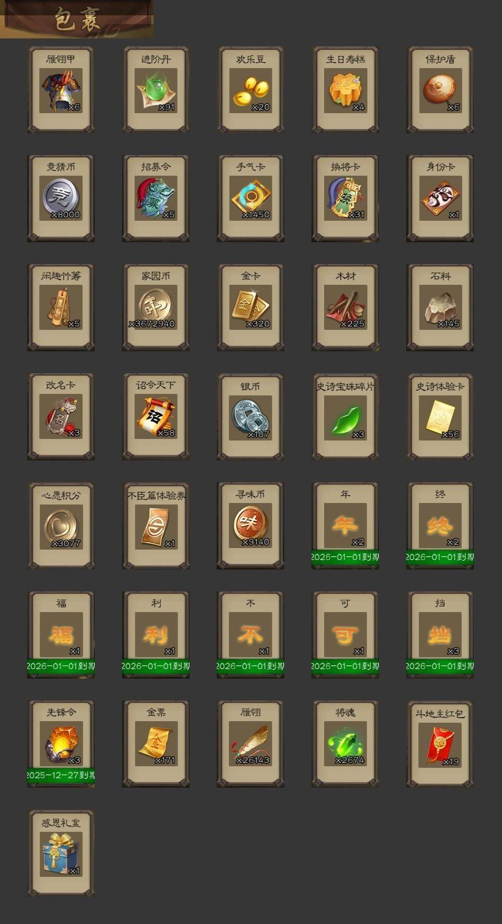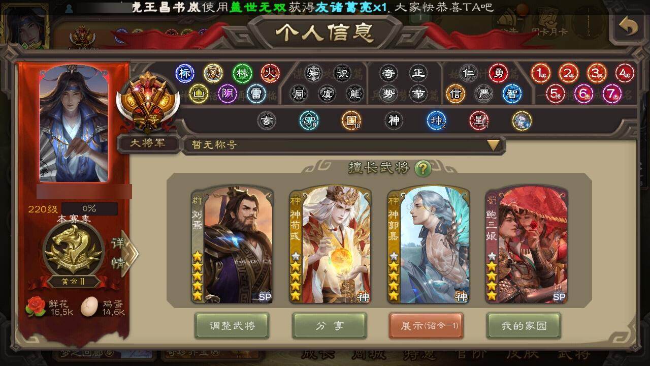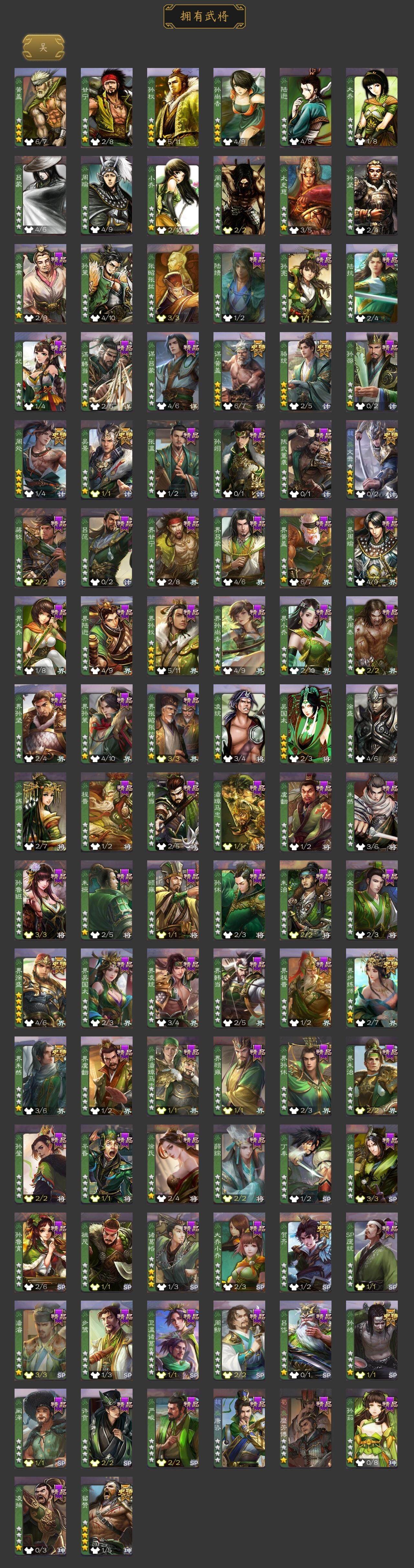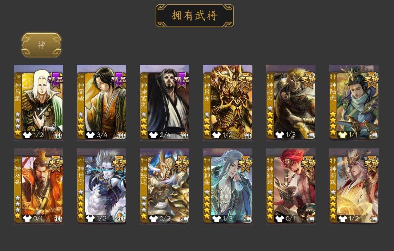 [15182426]【24】官阶:大将军;vip等级:vip13;史诗武将数量:81;动态皮肤数量:68;武将总数:459;史诗宝珠数量:0;将魂数量:2674;神将:12;魏国史诗武将:43;蜀国史诗武将:16;吴国史诗武将:10;群史诗武将:26 神吕布神赵云神陆逊神刘备神甘宁神张辽神郭嘉神孙策神荀彧神吕蒙神周瑜神诸葛亮sp司马昭星周不疑王粲杨修文鸯王元姬王凌马钧界钟会界于禁界曹真嵇康郝昭陈琳曹婴曹纯戏志才刘晔谋曹丕关索马云騄谋黄忠谋赵云谋马超诸葛瞻周群赵襄张星彩王平沙摩柯谯周界黄忠花鬘董允鲍三娘谋黄盖周处吴景孙皓骆统留赞界朱然界徐盛界步练师贺齐裴秀左慈张让张琪瑛杨彪星黄忠星甘宁王允陶谦苏飞司马徽审配麹义庞德公南华老仙祢衡刘焉沮授界左慈界李儒公孙康杜预卑弥呼张绣李傕许攸神郭嘉-虎年清明动态神荀彧-虎年清明动态神甘宁-万人辟易动态神陆逊-绽焰摧枯动态神诸葛亮-风舞魔鸟动态神关羽-血海罗刹动态神吕蒙-兼资文武动态神周瑜-陵光引灵动态神周瑜-焰腾麒麟动态神诸葛亮-孟章诛邪动态神曹操-天下归心神吕布-冠绝天下动态神赵云-战龙在野动态曹丕-气荡山河(动态)星周不疑-龙年清明动态曹叡-睥睨天下动态sp蔡文姬-兔年冬日动态甄姬-牛年清明动态张辽-登峰陷阵动态荀彧-驱虎吞狼动态邓艾-神兵天降动态王粲-笔翰如流动态界张辽-登峰陷阵动态界甄姬-牛年清明动态界邓艾-神兵天降动态钟会-谋谟之勋动态曹真-虎年春节动态钟繇-稳定关右动态界钟会-谋谟之勋动态辛宪英-鼠年春节动态曹昂-竭战麟伤动态戏志才-举棋若定动态曹婴-锋芒毕露动态朱灵-以战破氐动态曹纯-长坂败备动态王元姬-鼠年冬至动态刘备-龙御天下动态费祎-安民护祚(动态)刘备-龙骧麟振动态刘备-明良千古动态关羽-明良千古动态马超-牛年春节动态马超-虎年冬至动态赵云-截江救主动态黄月英-鼠年春节动态黄忠-明良千古动态诸葛瞻-绵竹之殇
