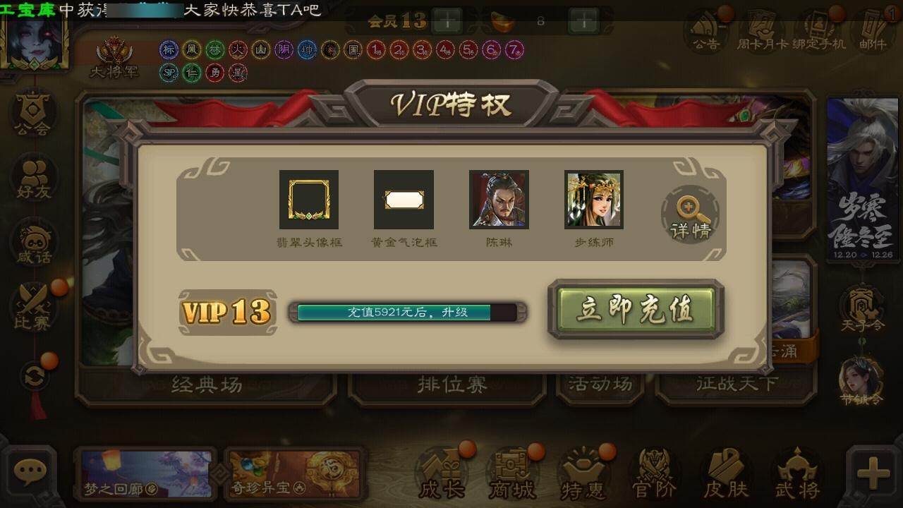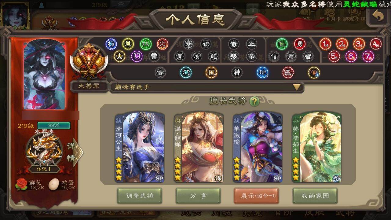 [15182454]【149】官阶:大将军;vip等级:vip13;史诗武将数量:78;动态皮肤数量:62;武将总数:468;史诗宝珠数量:0;将魂数量:87;神将:11;魏国史诗武将:32;蜀国史诗武将:12;吴国史诗武将:13;群史诗武将:30 神吕布神赵云神司马懿神陆逊神甘宁神张辽神荀彧神关羽神吕蒙神周瑜神诸葛亮曹髦星周不疑王粲杨修羊徽瑜文鸯王元姬王朗魏-司马昭界钟会界于禁嵇康郝昭陈琳曹纯戏志才刘晔清河公主势辛宪英关索马云騄谋赵云谋马超诸葛瞻赵襄张星彩王平沙摩柯谯周花鬘董允张奋谋黄盖周处吴景孙皓骆统留赞界朱然界徐盛界步练师贺齐势陆郁生势太史慈谋黄月英谋公孙瓒谋貂蝉裴秀界沮授左慈郑玄张仲景张让杨彪星黄忠王允陶谦麹义南华老仙祢衡刘璋刘焉沮授界李儒公孙康杜预卑弥呼鲍信谋张角张绣李傕阎象许攸星董卓神荀彧-匡汉延祚动态神甘宁-万人辟易动态神司马懿-徐图大略神吕布-冠绝天下动态神赵云-神龙天降神司马懿-鉴往知来动态王元姬-婆娑起舞(动态)羊徽瑜-月耀华裳(动态)星周不疑-才广志宏动态张昌蒲-龙年端午(动态)钟会-潜蛟觊天动态曹丕-气荡山河(动态)甄姬-明珠耀躯(动态)曹丕-龙年中秋动态sp蔡文姬-兔年冬日动态邓艾-神兵天降动态界邓艾-神兵天降动态张春华-牛年立冬动态戏志才-举棋若定动态曹纯-虎年春节动态羊徽瑜-牛年中秋动态司马昭-昭威淮南(动态)清河公主-魅影萦心动态刘备-龙御天下动态诸葛亮-龙年限定动态星黄忠-长沙阻敌动态卧龙诸葛-龙跃凤鸣动态黄忠-烈箭贯云动态)刘备-龙骧麟振动态关羽-明良千古动态黄月英-虎年中秋动态界刘备-龙骧麟振动态秦宓-冠绝天下动态张星彩-猪年中秋动态关索-虎年七夕动态诸葛果-蛇年限定动态小乔-兔年七夕动态孙茹-龙年七夕动态周处-义除三害动态吕蒙-剑起惊澜动态陆逊-龙年七夕动态孙权-永开吴祚动态周瑜-兔年七夕动态孙策-虎踞江东动态黄盖-鏖战赤壁动态孙权-牛年七夕动
