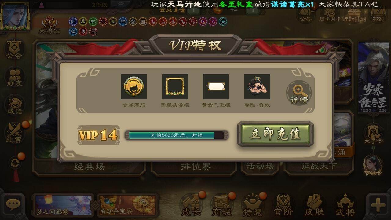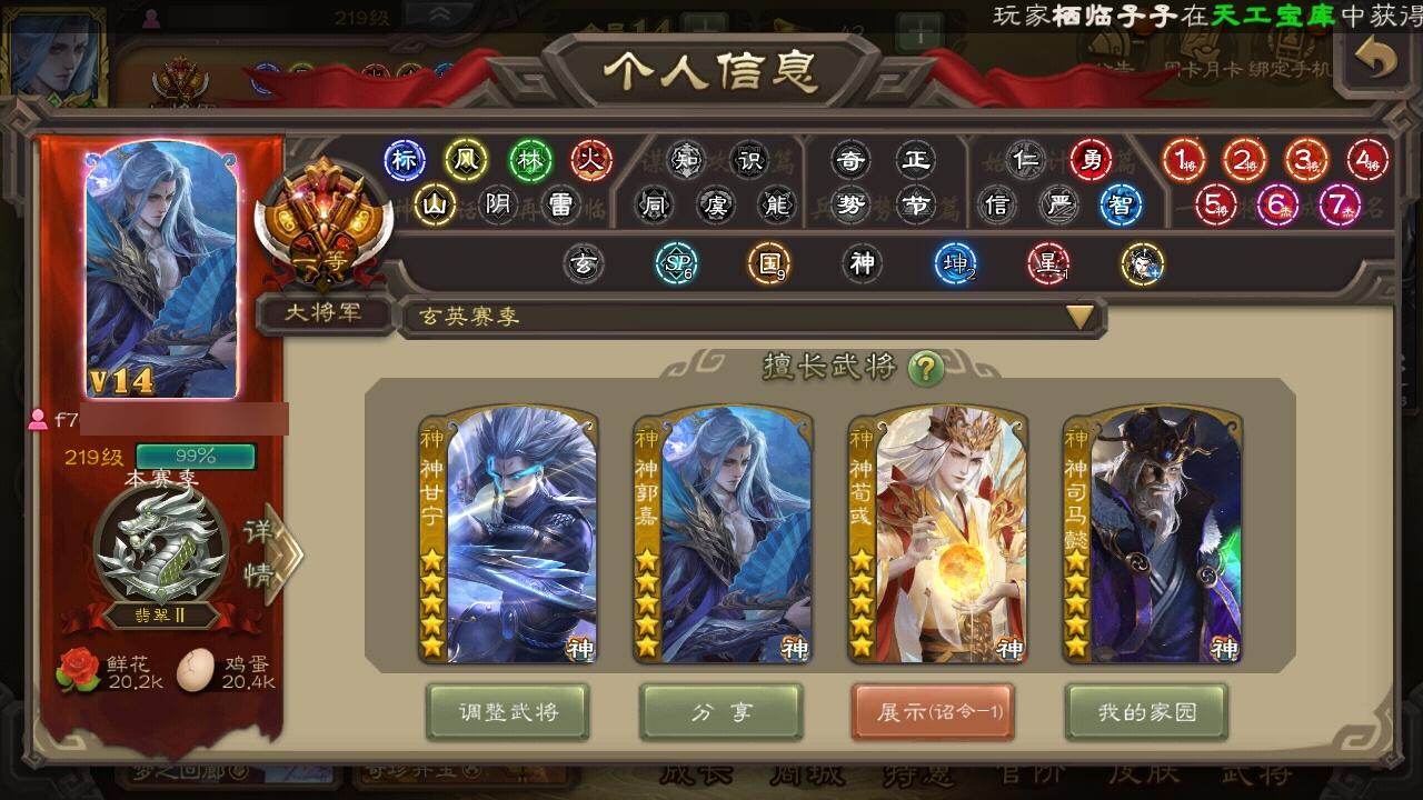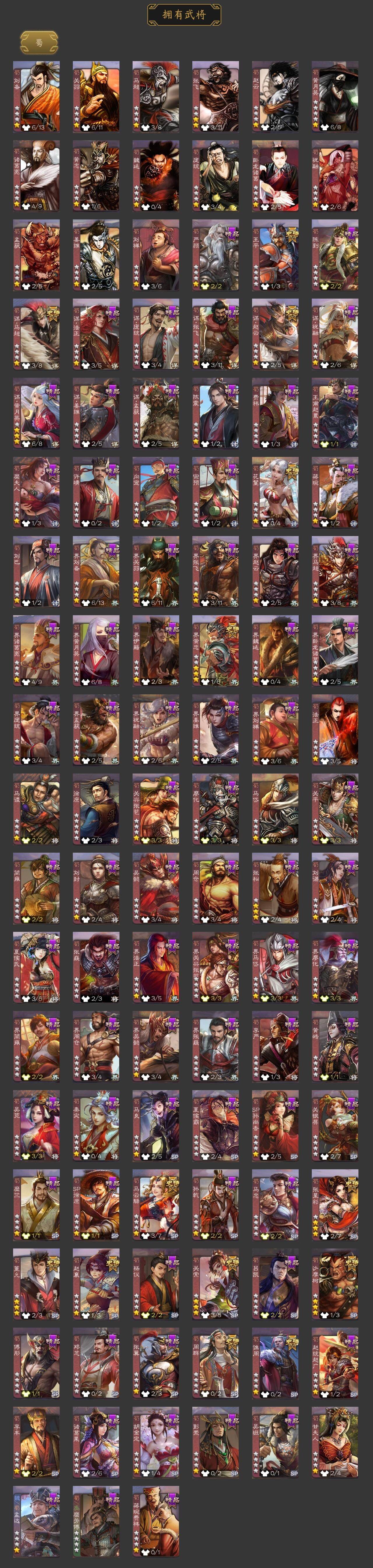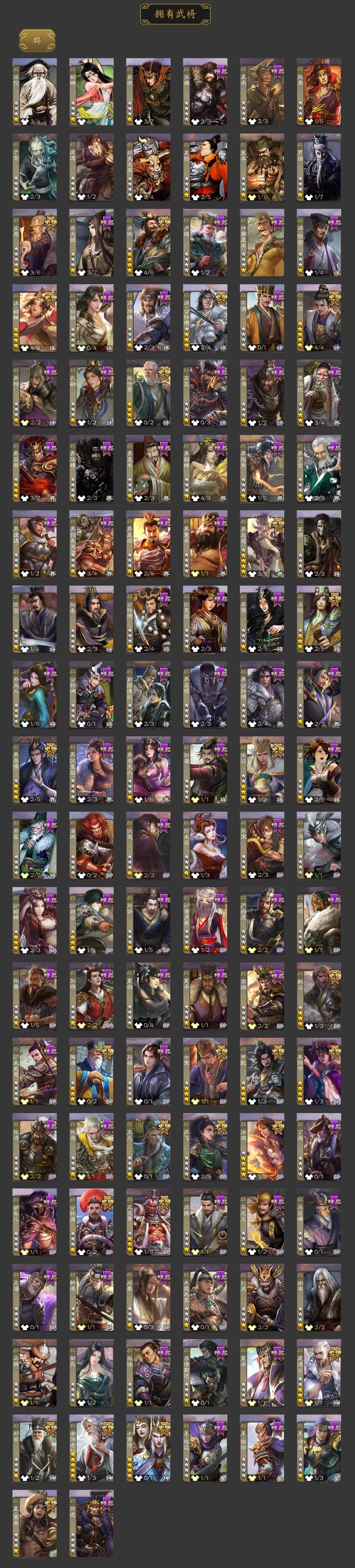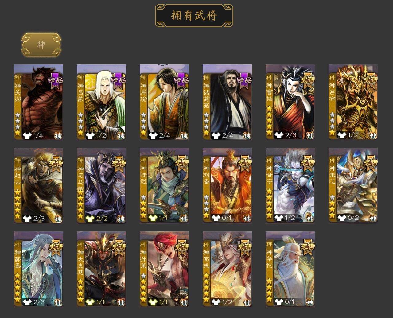 [15182500]【738】官阶:大将军;vip等级:vip14;史诗武将数量:83;动态皮肤数量:69;武将总数:461;史诗宝珠数量:0;将魂数量:4710;神将:17;魏国史诗武将:42;蜀国史诗武将:13;吴国史诗武将:11;群史诗武将:25 神曹操神吕布神赵云神司马懿神陆逊神刘备神甘宁神张辽神郭嘉神太史慈神孙策神荀彧神华佗神关羽神吕蒙神周瑜神诸葛亮sp司马昭星周不疑谋曹仁王粲杨修文鸯王元姬王凌王朗马钧界钟会界于禁界曹真嵇康郝昭陈琳曹婴曹纯戏志才刘晔关索马云騄谋赵云谋马超周群赵襄张星彩王平沙摩柯谯周界黄忠花鬘董允谋孙策周处吴景孙皓孙寒华骆统留赞界朱然界徐盛界步练师贺齐谋黄月英谋公孙瓒十常侍谋貂蝉左慈郑玄张仲景张让徐荣王允陶谦苏飞审配麹义庞德公南华老仙沮授界左慈界李儒公孙康杜预卑弥呼阎象许攸星董卓神关羽-链狱鬼神神郭嘉-虎年清明动态神郭嘉-倚星折月动态神太史慈-勇撼日月动态神孙策-霸王再世动态神荀彧-虎年清明动态神甘宁-万人辟易动态神陆逊-绽焰摧枯动态神吕蒙-兼资文武动态神周瑜-陵光引灵动态神诸葛亮-观星唤雨神诸葛亮-孟章诛邪动态神司马懿-徐图大略神曹操-天下归心神曹操-玄天通冥动态神吕布-监兵噬魅动态神赵云-战龙在野动态神赵云-神龙天降神司马懿-鉴往知来动态郭嘉-以身证道(动态)曹丕-气荡山河(动态)sp蔡文姬-兔年冬日动态许褚-兔年端午动态许褚-虎啸生风动态甄姬-牛年清明动态张辽-登峰陷阵动态荀彧-驱虎吞狼动态曹丕-牛年清明动态邓艾-神兵天降动态界张辽-登峰陷阵动态界许褚-虎啸生风动态界甄姬-牛年清明动态界曹丕-牛年清明动态界邓艾-神兵天降动态曹真-虎年春节动态辛宪英-鼠年春节动态戏志才-举棋若定动态曹婴-锋芒毕露动态朱灵-以战破氐动态曹纯-虎年春节动态马钧-能工巧匠动态王元姬-鼠年冬至动态羊徽瑜-牛年中秋动态刘备-龙御天下动态卧龙诸葛-龙跃凤鸣动态关羽-以身证道(