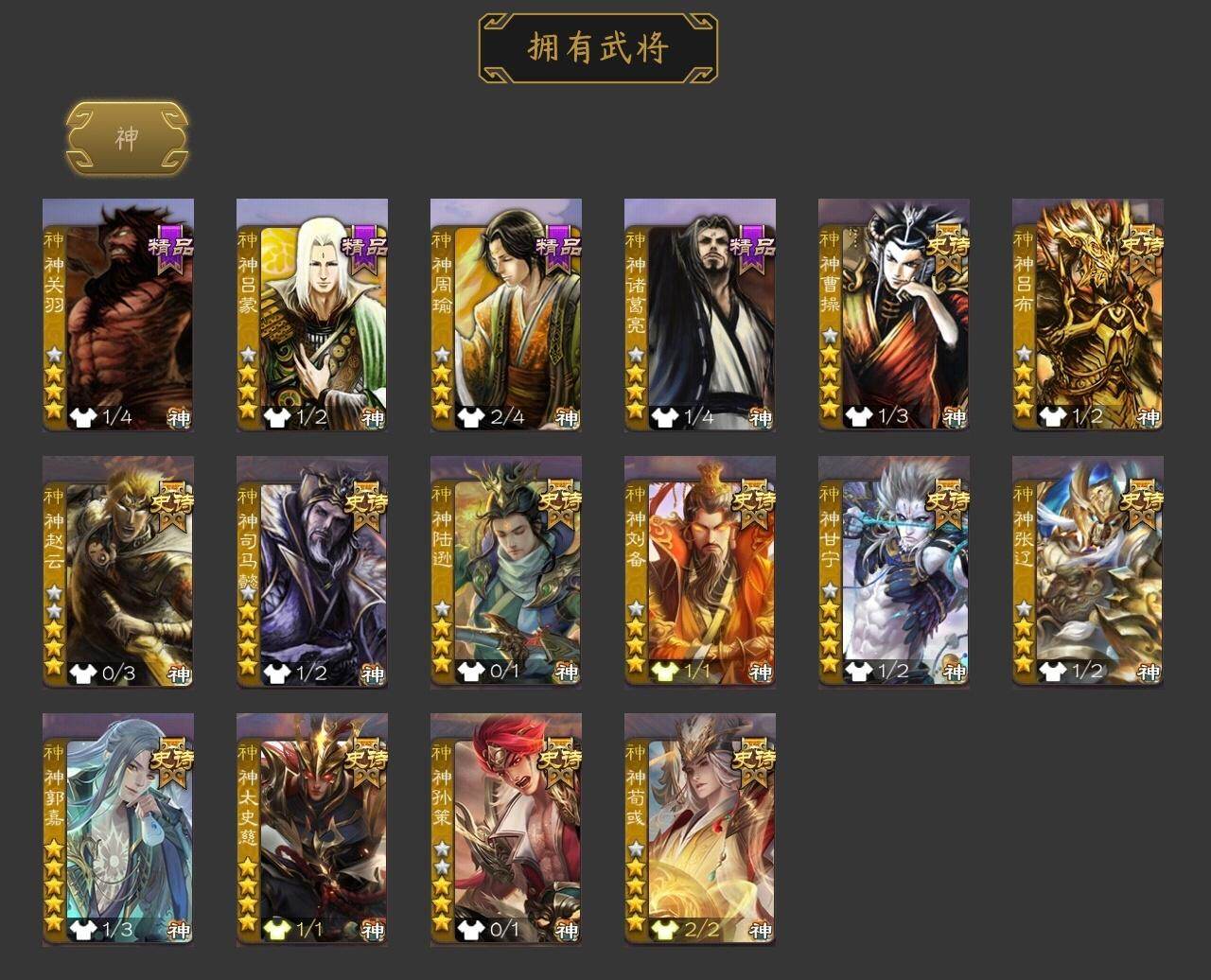 [15182520]【432】官阶:大将军;vip等级:vip13;史诗武将数量:77;动态皮肤数量:54;武将总数:458;史诗宝珠数量:0;将魂数量:2216;神将:16;魏国史诗武将:27;蜀国史诗武将:14;吴国史诗武将:9;群史诗武将:24 神曹操神吕布神赵云神司马懿神陆逊神刘备神甘宁神张辽神郭嘉神太史慈神孙策神荀彧神关羽神吕蒙神周瑜神诸葛亮sp司马昭曹髦王粲杨修文鸯王元姬王凌马钧界钟会界于禁界曹真嵇康郝昭陈琳曹婴曹纯戏志才关索马云騄谋赵云谋马超诸葛瞻周群赵襄张星彩王平沙摩柯谯周界黄忠花鬘董允周处吴景孙寒华骆统留赞界朱然界徐盛界步练师贺齐十常侍界沮授左慈张让星黄忠陶谦苏飞司马徽审配麹义庞德公南华老仙祢衡刘焉沮授界左慈界李儒公孙康杜预卑弥呼张绣李傕许攸谋吕布神张辽-威震江东神郭嘉-虎年清明动态神太史慈-勇撼日月动态神荀彧-虎年清明动态神荀彧-匡汉延祚动态神刘备-龙兴海内神甘宁-万人辟易动态神关羽-佑子伐吴神吕蒙-兼资文武动态神周瑜-焰腾麒麟动态神诸葛亮-观星唤雨神司马懿-徐图大略神曹操-玄天通冥动态神吕布-冠绝天下动态曹丕-龙年中秋动态郭嘉-十胜十败动态界郭嘉-十胜十败动态于禁-威严毅重动态钟会-谋谟之勋动态界于禁-威严毅重动态界钟会-谋谟之勋动态戏志才-举棋若定动态曹婴-锋芒毕露动态朱灵-以战破氐动态王元姬-鼠年冬至动态羊徽瑜-牛年中秋动态司马师-牛年中秋动态司马昭-昭威淮南(动态)卧龙诸葛-龙跃凤鸣动态刘备-龙骧麟振动态马超-牛年春节动态张飞-猪年中秋动态黄月英-鼠年春节动态界刘备-龙骧麟振动态界张飞-猪年中秋动态界马超-牛年春节动态界黄月英-鼠年春节动态夏侯氏-猪年中秋动态关银屏-鼠年中秋动态关银屏-虎年端午动态张星彩-猪年中秋动态关索-鼠年中秋动态诸葛果-虎年中秋动态胡金定-明良千古动态太史慈-涤荡江东动态周瑜-免年清明动态黄盖-鏖战赤壁动态孙权-吴王六剑