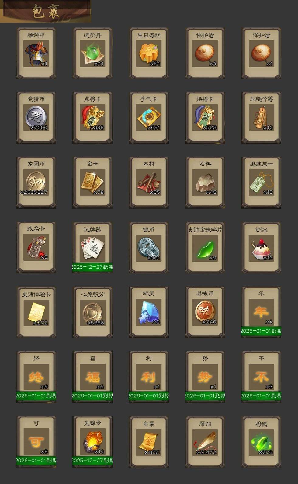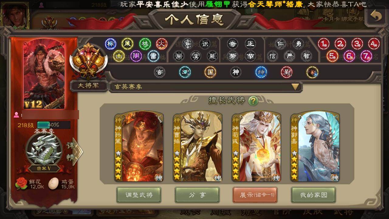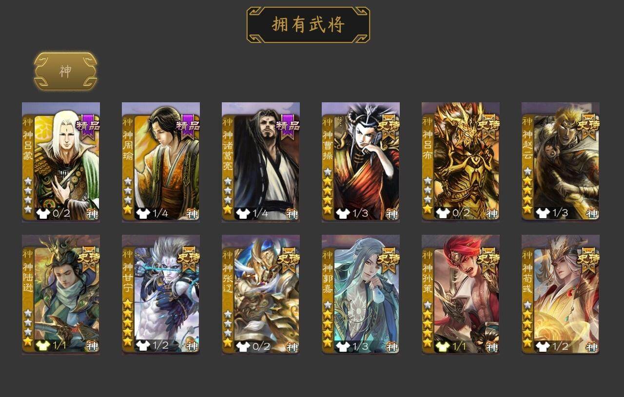 [15182566]【258】官阶:大将军;vip等级:vip12;史诗武将数量:65;动态皮肤数量:57;武将总数:421;史诗宝珠数量:0;将魂数量:270;神将:12;魏国史诗武将:29;蜀国史诗武将:14;吴国史诗武将:5;群史诗武将:21 神曹操神吕布神赵云神陆逊神甘宁神张辽神郭嘉神孙策神荀彧神吕蒙神周瑜神诸葛亮曹髦星周不疑王粲杨修文鸯王元姬王凌马钧界钟会界曹真嵇康郝昭陈琳曹婴曹纯戏志才关索谋诸葛亮谋黄忠谋夏侯氏谋赵云谋马超诸葛瞻张星彩王平沙摩柯谯周花鬘董允谋关羽谋黄盖吴景骆统留赞界徐盛十常侍界沮授左慈张让张琪瑛杨彪徐荣星黄忠苏飞麹义庞德公南华老仙刘焉沮授界左慈界李儒杜预卑弥呼张绣李傕许攸神郭嘉-虎年清明动态神太史慈-勇撼日月动态神孙策-霸王再世动态神荀彧-虎年清明动态神甘宁-万人辟易动态神陆逊-绽焰摧枯动态神诸葛亮-孟章诛邪动态神曹操-玄天通冥动态神赵云-战龙在野动态星周不疑-才广志宏动态钟会-龙年端午(动态)曹丕-气荡山河(动态)星周不疑-龙年清明动态甄姬-明珠耀躯(动态)sp蔡文姬-兔年冬日动态荀彧-驱虎吞狼动态邓艾-神兵天降动态界邓艾-神兵天降动态钟会-谋谟之勋动态界钟会-谋谟之勋动态曹昂-竭战麟伤动态戏志才-举棋若定动态朱灵-以战破氐动态曹纯-虎年春节动态清河公主-魅影萦心动态花鬘-依心缱绻动态刘备-龙御天下动态诸葛亮-龙年限定动态卧龙诸葛-龙跃凤鸣动态关羽-以身证道(动态)黄忠-烈箭贯云动态)关索-依心缱绻动态关羽-明良千古动态黄忠-明良千古动态夏侯氏-猪年中秋动态sp孙尚香-猪年圣诞动态张星彩-虎年端午动态关索-虎年七夕动态李丰-太仓聚粟动态孙策-兔年中秋动态周处-义除三害动态吕蒙-剑起惊澜动态黄盖-以身证道动态孙权-永开吴祚动态周瑜-兔年七夕动态孙策-虎踞江东动态孙权-牛年七夕动态孙尚香-星流霆击动态界孙权-牛年七夕动态界孙尚香-星流霆击动态徐盛-