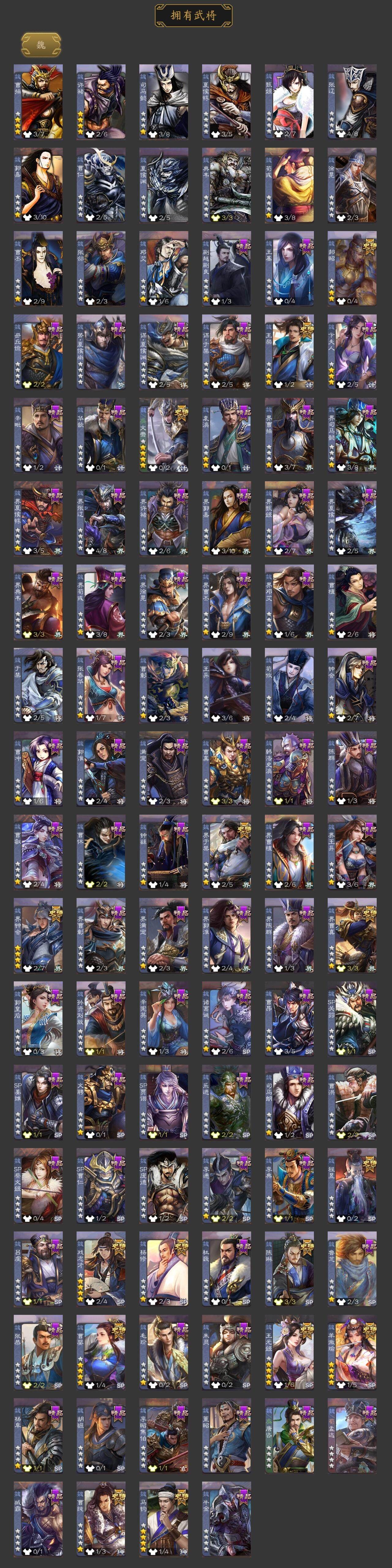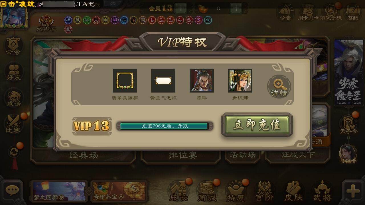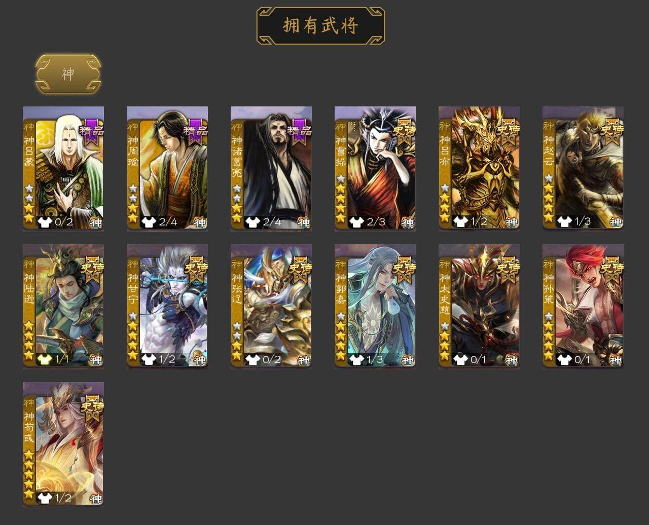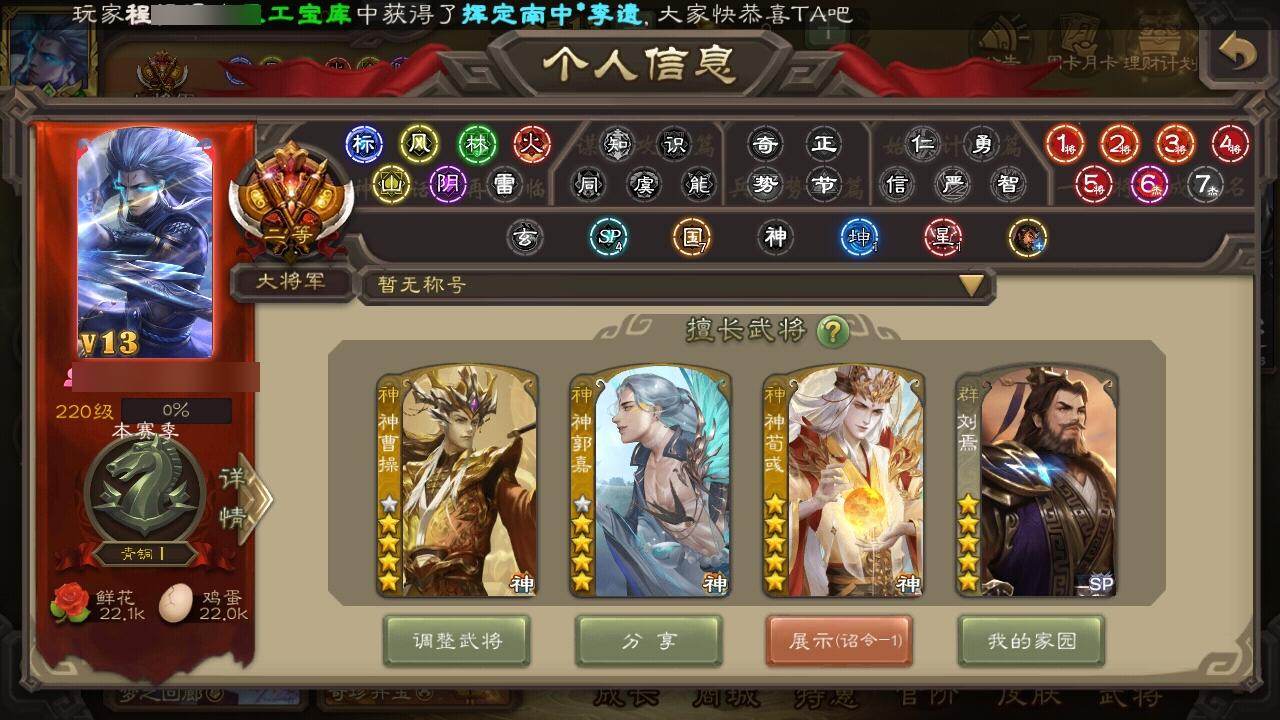 [15182578]【674】官阶:大将军;vip等级:vip13;史诗武将数量:65;动态皮肤数量:45;武将总数:430;史诗宝珠数量:0;将魂数量:464;神将:13;魏国史诗武将:20;蜀国史诗武将:11;吴国史诗武将:9;群史诗武将:20 神曹操神吕布神赵云神陆逊神甘宁神张辽神郭嘉神太史慈神孙策神荀彧神吕蒙神周瑜神诸葛亮王粲杨修羊徽瑜文鸯王元姬马钧界钟会界于禁界曹真郝昭陈琳曹婴曹纯戏志才关索马云騄谋赵云诸葛瞻周群赵襄张星彩王平沙摩柯花鬘鲍三娘周处吴景孙寒华骆统留赞界朱然界徐盛界步练师贺齐谋公孙瓒左慈张让杨彪徐荣陶谦苏飞司马徽麹义南华老仙祢衡刘焉沮授界左慈界李儒公孙康杜预卑弥呼李傕许攸神郭嘉-虎年清明动态神荀彧-虎年清明动态神甘宁-万人辟易动态神陆逊-绽焰摧枯动态神诸葛亮-风舞魔鸟动态神周瑜-陵光引灵动态神诸葛亮-孟章诛邪动态神曹操-天下归心神曹操-玄天通冥动态神吕布-监兵噬魅动态神赵云-战龙在野动态鲍三娘-情定缘起钟会-谋谟之勋动态曹真-虎年春节动态界曹植-鼠年端午动态界钟会-谋谟之勋动态戏志才-举棋若定动态曹婴-锋芒毕露动态曹纯-虎年春节动态马钧-能工巧匠动态王元姬-鼠年冬至动态羊徽瑜-牛年中秋动态费祎-安民护祚(动态)关羽-明良千古动态夏侯氏-猪年中秋动态关银屏-兔年春节动态关索-虎年七夕动态鲍三娘-虎年七夕动态鲍三娘-柳娇桃艳动态诸葛果-虎年中秋动态诸葛果-仙池起舞动态胡金定-明良千古动态吕蒙-剑起惊澜动态孙权-吴王六剑动态孙尚香-兔年春节动态小乔-采莲江南动态周妃-笼中箜响动态界孙权-吴王六剑动态界小乔-采莲江南动态徐氏-琪花瑶草动态孙鲁育-牛年端午动态孙茹-鱼游濠水动态孙茹-烟水悠悠动态刘赞-灵魂歌王动态左慈-役使鬼神动态许攸-盛气凌人动态李儒-鸠杀少帝动态界李儒-鸠杀少帝动态卑弥呼-鬼渊蝶引动态刘焉-雄踞益州动态徐荣-烬灭神骸动态张琪瑛-虎年