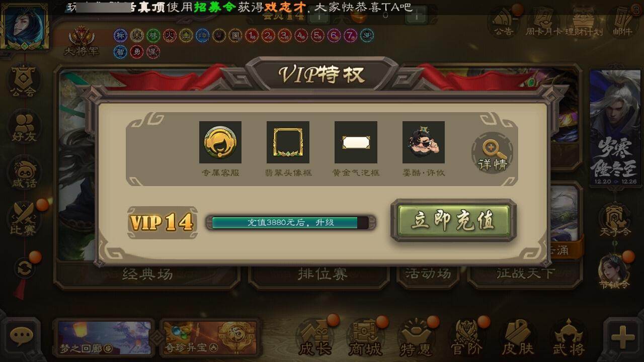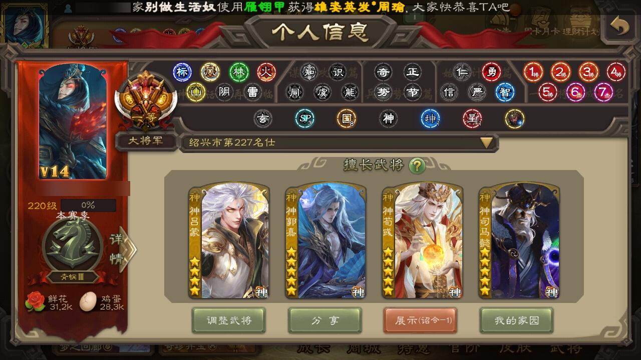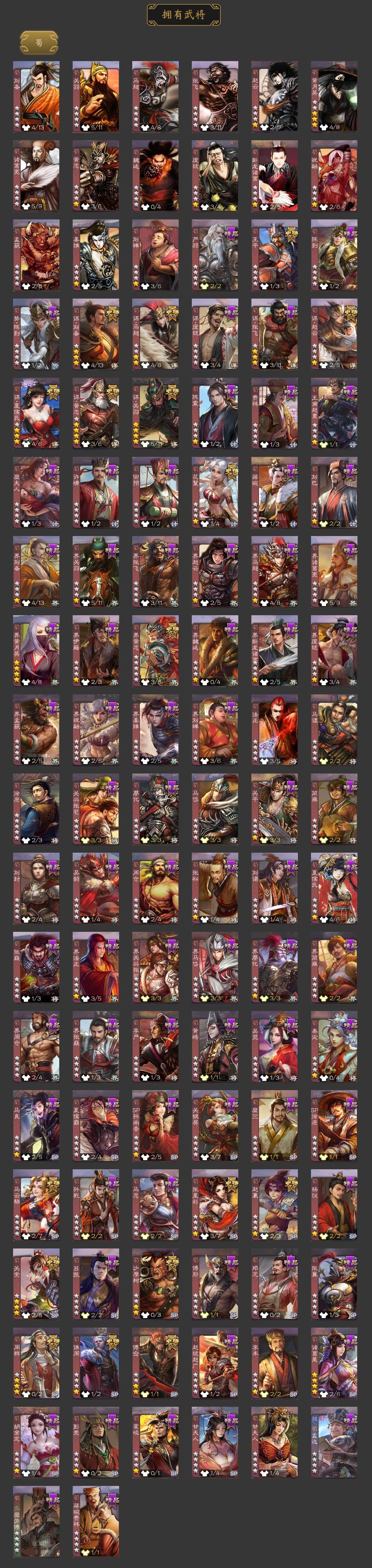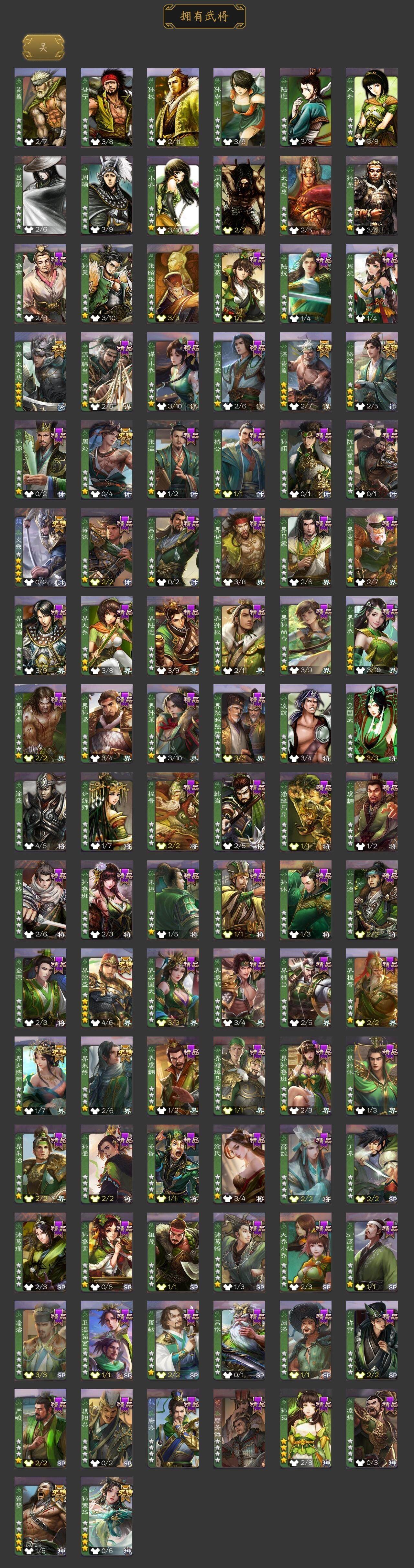 [15182718]【73】官阶:大将军;vip等级:vip14;史诗武将数量:75;动态皮肤数量:53;武将总数:448;史诗宝珠数量:0;将魂数量:996;神将:15;魏国史诗武将:30;蜀国史诗武将:17;吴国史诗武将:9;群史诗武将:20 神吕布神赵云神司马懿神陆逊神刘备神甘宁神张辽神郭嘉神太史慈神孙策神荀彧神关羽神吕蒙神周瑜神诸葛亮张昌蒲王粲杨修羊徽瑜文鸯王元姬王凌马钧界钟会界于禁界曹真嵇康郝昭陈琳曹婴曹纯戏志才关索谋刘备马云騄谋黄忠谋夏侯氏谋赵云谋马超周群赵襄张星彩王平沙摩柯谯周傅佥界黄忠花鬘谋关羽谋黄盖周处孙寒华骆统留赞界朱然界徐盛界步练师势太史慈左慈张让杨彪徐荣星黄忠星甘宁陶谦苏飞司马徽麹义南华老仙祢衡刘焉沮授界左慈界李儒公孙康杜预李傕许攸神关羽-链狱鬼神神郭嘉-虎年清明动态神郭嘉-倚星折月动态神荀彧-虎年清明动态神甘宁-万人辟易动态神陆逊-绽焰摧枯动态神诸葛亮-风舞魔鸟动态神吕蒙-兼资文武动态神曹操-玄天通冥动态神赵云-战龙在野动态神司马懿-鉴往知来动态甄姬-牛年清明动态荀彧-驱虎吞狼动态曹丕-牛年清明动态邓艾-神兵天降动态王粲-笔翰如流动态界甄姬-牛年清明动态界曹丕-牛年清明动态界邓艾-神兵天降动态张春华-雪中舞刃动态曹真-虎年春节动态戏志才-举棋若定动态曹婴-锋芒毕露动态曹纯-虎年春节动态马钧-能工巧匠动态王元姬-鼠年冬至动态羊徽瑜-牛年中秋动态卧龙诸葛-龙跃凤鸣动态刘备-猪年圣诞动态关羽-明良千古动态马超-虎年冬至动态张飞-明良千古动态赵云-牛年春节动态黄月英-虎年中秋动态黄月英-明良千古动态诸葛亮-虎年中秋动态诸葛亮-明良千古动态黄忠-明良千古动态界刘备-猪年圣诞动态界赵云-牛年春节动态界诸葛亮-明良千古动态界黄月英-明良千古动态夏侯氏-明良千古动态sp孙尚香-猪年圣诞动态关银屏-虎年端午动态马云騄-牛年春节动态张星彩-虎年端午动态