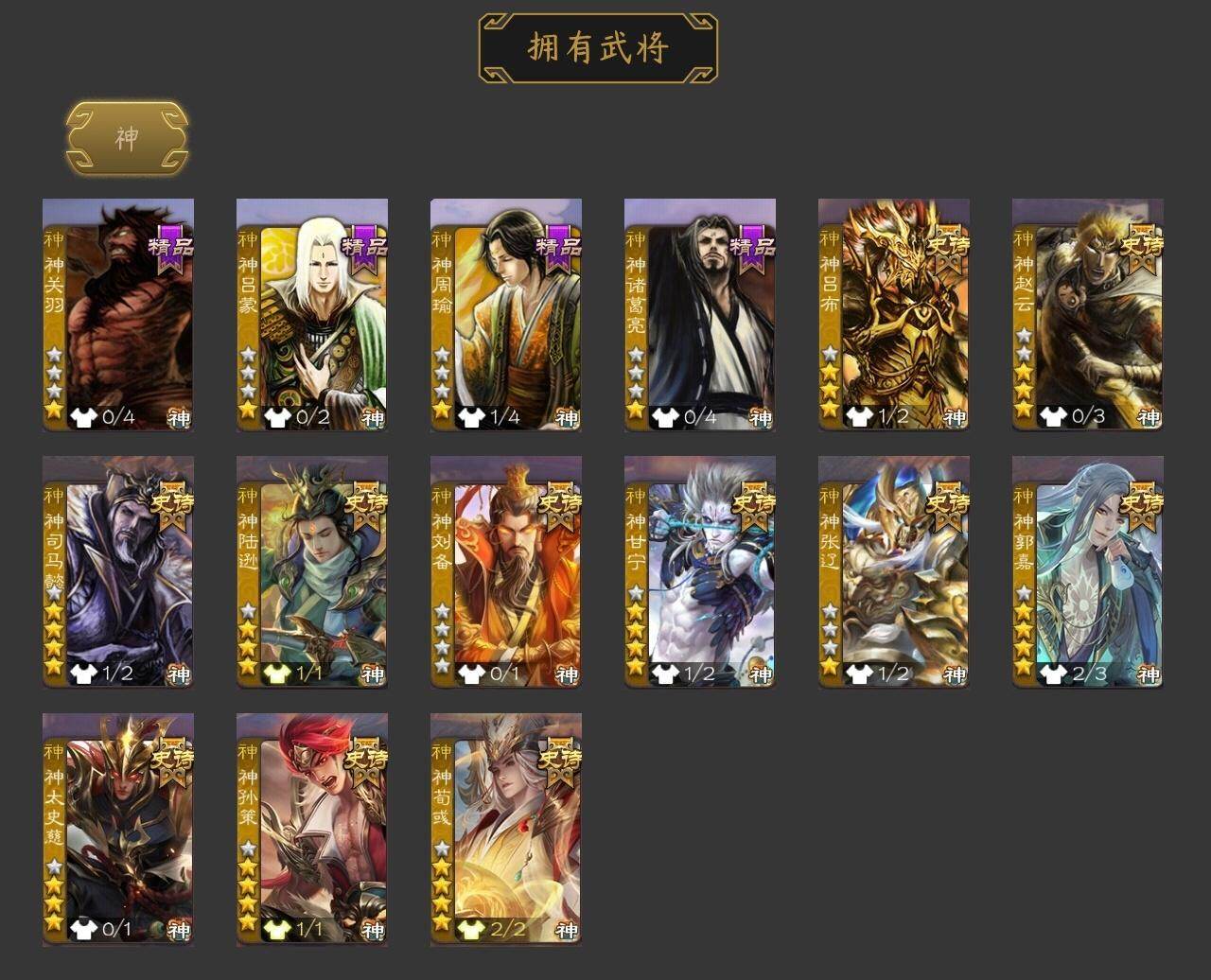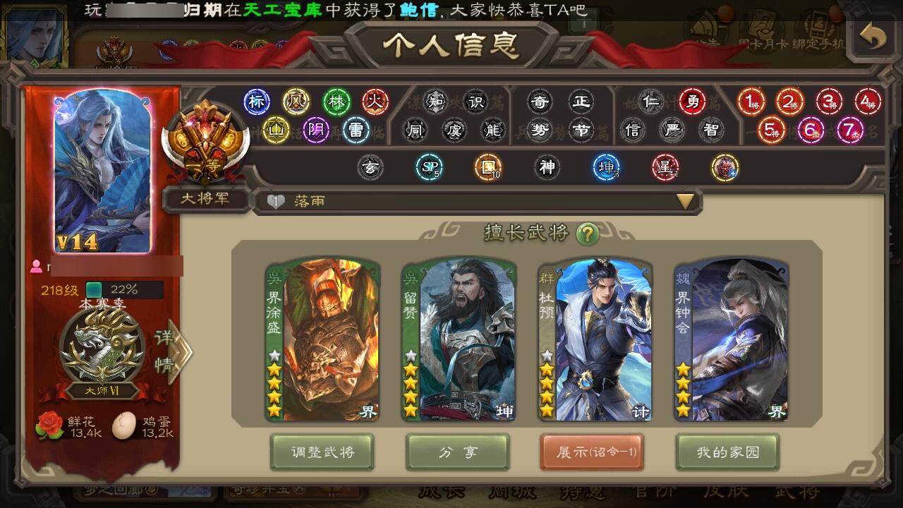 [15182820]【520】官阶:大将军;vip等级:vip14;史诗武将数量:83;动态皮肤数量:63;武将总数:472;史诗宝珠数量:0;将魂数量:3926;神将:15;魏国史诗武将:43;蜀国史诗武将:14;吴国史诗武将:12;群史诗武将:28 神吕布神赵云神司马懿神陆逊神刘备神甘宁神张辽神郭嘉神太史慈神孙策神荀彧神关羽神吕蒙神周瑜神诸葛亮sp司马昭星周不疑张昌蒲王粲杨修文鸯王元姬王凌魏-司马昭司马师马钧界钟会界于禁界曹真嵇康郝昭陈琳曹婴曹纯戏志才关索马云騄谋黄忠谋夏侯氏谋赵云谋马超诸葛瞻周群张星彩王平沙摩柯谯周界黄忠花鬘张奋谋陆逊谋黄盖吴景孙皓孙寒华骆统留赞界朱然界徐盛界步练师贺齐谋郭嘉谋荀彧十常侍谋貂蝉裴秀界沮授左慈张让星黄忠陶谦苏飞麹义庞德公南华老仙祢衡刘焉沮授界左慈界李儒公孙康杜预卑弥呼谋张角张绣李傕阎象许攸星董卓神郭嘉-虎年清明动态神郭嘉-倚星折月动态神孙策-霸王再世动态神荀彧-虎年清明动态神荀彧-匡汉延祚动态神张辽-散敌擒孙神甘宁-万人辟易动态神陆逊-绽焰摧枯动态神司马懿-徐图大略神曹操-天下归心神曹操-玄天通冥动态神曹操-四方归心动态神吕布-冠绝天下动态星周不疑-才广志宏动态钟会-潜蛟觊天动态曹丕-气荡山河(动态)星周不疑-龙年清明动态sp蔡文姬-兔年冬日动态司马懿-牛年立冬动态荀彧-驱虎吞狼动态曹丕-牛年清明动态王粲-笔翰如流动态界司马懿-牛年立冬动态界曹丕-牛年清明动态钟会-谋谟之勋动态界曹植-鼠年端午动态界钟会-谋谟之勋动态曹婴-兔年春节动态朱灵-以战破氐动态曹纯-虎年春节动态马钧-能工巧匠动态王元姬-鼠年冬至动态司马师-牛年中秋动态司马昭-昭威淮南(动态)星徐晃-斧引霹雳动态花鬘-依心缱绻动态刘备-龙御天下动态关羽-明良千古动态马超-明良千古动态黄月英-鼠年春节动态诸葛亮-虎年中秋动态诸葛亮-明良千古动态黄忠-明良千古动态界诸葛亮-明良千古动态