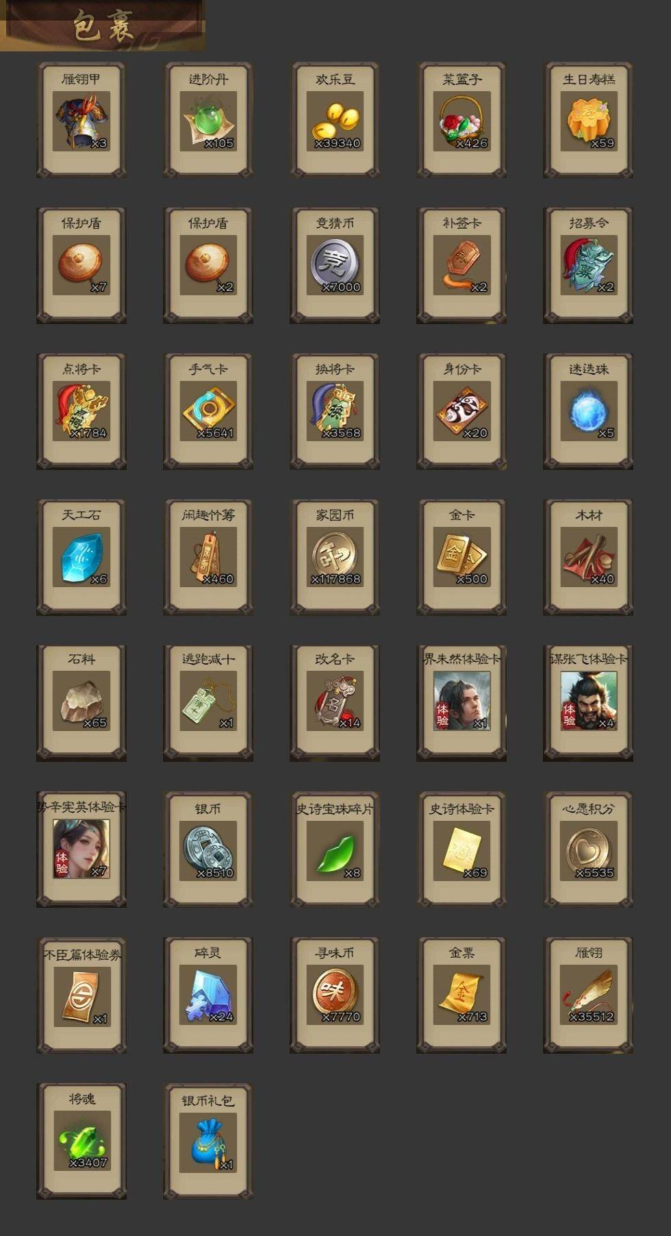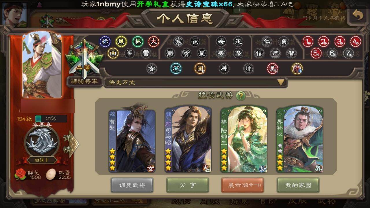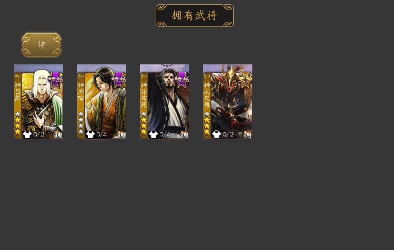 [15208821]【1033】官阶:骠骑将军;vip等级:vip8;史诗武将数量:20;动态皮肤数量:19;武将总数:315;史诗宝珠数量:0;将魂数量:3407;神将:2;魏国史诗武将:2;蜀国史诗武将:4;吴国史诗武将:4;群史诗武将:6 神太史慈神诸葛亮曹髦界于禁陈琳曹纯戏志才程昱马云騄谋马超沙摩柯谯周谋黄盖界朱然贺齐势陆郁生左慈沮授星董卓兀突骨司马昭神吕蒙神周瑜势夏侯尚sp关羽sp曹仁sp蔡文姬乐进曹昂诸葛诞朱灵文聘sp姜维张春华钟会曹冲郭淮满宠界王异界曹操界司马懿界夏侯惇界张辽界许褚界郭嘉李典曹真韩浩史涣陈群曹叡曹休钟繇司马朗王基李通孙资刘放界甄姬吕虔鲁芝界荀彧界徐晃杜畿界邓艾界曹植界满宠界郭淮卞夫人辛毗界陈群华歆蔡贞姬袁涣王双崔琰毛玠杨阜阮慧谋徐晃谋于禁司马伷谋夏侯渊牛金臧霸唐咨势陈到sp孙尚香夏侯霸马良关兴张苞廖化界马岱关平简雍刘封界法正界关兴张苞界刘备界关羽界张飞界赵云界马超sp徐庶吴懿周仓张松刘谌夏侯氏糜竺李严黄皓界黄月英界诸葛亮界伊籍吕凯张翼杨仪界廖化邓芝陈震费祎界周仓彭羕谋庞统界张嶷吴班霍峻诸葛果界魏延糜芳傅士仁甘夫人鲁肃孙茹凌操大乔小乔诸葛恪诸葛瑾孙鲁育程普韩当潘璋马忠虞翻朱然界甘宁界吕蒙界黄盖界周瑜界大乔界陆逊孙鲁班朱桓顾雍孙休朱治全琮孙登界孙权界孙尚香潘濬严畯界孙坚吕岱陆抗界吴国太界韩当界程普孙邵陈武董袭蒋钦吕范濮阳兴谋吕蒙谋周瑜界朱治谋小乔张布界小乔孟达蔡文姬伏完刘协界袁术sp赵云sp貂蝉张宝伏皇后李儒界张角华雄袁术界华佗界吕布公孙瓒蔡夫人公孙渊郭图逢纪张鲁蹋顿sp黄月英曹节蔡邕卢植李傕界庞德界颜良文丑张济樊稠界董卓张绣界蔡文姬星张辽星徐晃星张郃胡车儿韩遂荀谌孔融高览朱儁阎圃谋刘赪谋卢植谋华雄何进李傕郭汜势田丰仲帝袁术神郭嘉-虎年清明动态曹纯-虎年春节动态马超-牛年春节动态诸葛亮-龙年限定