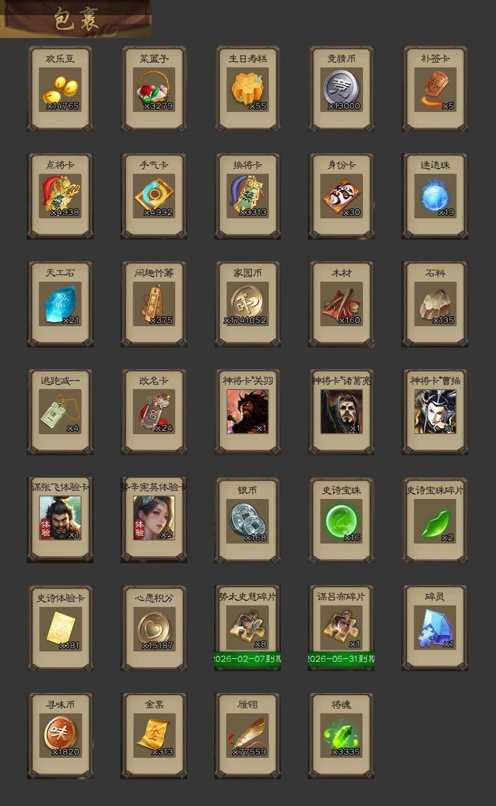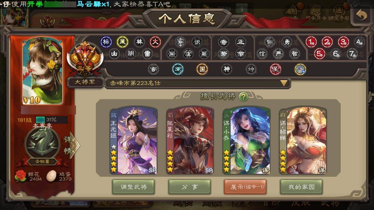 [15209035]【1035】官阶:大将军;vip等级:vip10;史诗武将数量:43;动态皮肤数量:32;武将总数:346;史诗宝珠数量:16;将魂数量:3335;神将:5;魏国史诗武将:19;蜀国史诗武将:6;吴国史诗武将:8;群史诗武将:15 神吕布神赵云神郭嘉神孙策神鲁肃曹髦王粲王元姬界钟会界于禁界曹真郝昭曹婴曹纯戏志才程昱谋赵云谋马超诸葛瞻张星彩谯周董允周处孙皓骆统界朱然界徐盛界步练师文鸯谋貂蝉郑玄张让张琪瑛星黄忠苏飞麹义界李儒谋张角许攸星董卓sp甄姬兀突骨司马昭神吕蒙神周瑜sp关羽乐进曹昂诸葛诞朱灵文聘sp姜维张春华钟会曹冲郭淮满宠界王异界曹操界司马懿界夏侯惇界张辽界许褚界郭嘉李典曹真韩浩史涣陈群曹叡曹休钟繇司马朗王基李通郭皇后孙资刘放辛宪英吕虔鲁芝界荀彧杜畿界曹植界满宠界郭淮卞夫人蔡贞姬袁涣王双崔琰毛玠杨阜谋徐晃谋于禁牵招胡班牛金臧霸唐咨sp孙尚香关银屏夏侯霸马良关兴张苞廖化界马岱关平简雍刘封界法正界关兴张苞界刘备界关羽界张飞界赵云界马超sp徐庶吴懿周仓张松刘谌夏侯氏糜竺马忠黄皓吴苋秦宓界黄月英严颜界伊籍界庞统吕凯张翼邓芝陈震糜夫人界周仓蒋琬刘巴谋庞统界张嶷谋姜维李遗霍峻诸葛果蒋琬费祎糜芳傅士仁甘夫人孙茹凌操大乔小乔诸葛恪诸葛瑾孙鲁育程普韩当潘璋马忠虞翻朱然界甘宁界吕蒙界黄盖界周瑜界大乔界陆逊孙鲁班朱桓顾雍孙休朱治全琮孙登徐氏薛综界孙权界孙尚香潘濬孙亮严畯吕岱周鲂陆抗卫温诸葛直界程普界潘璋马忠孙邵桥公蒋钦吕范界顾雍界孙鲁班濮阳兴谋吕蒙谋周瑜界孙休界全琮界朱治谋小乔张布孟达友庞统伏完刘协界袁术sp赵云张宝伏皇后李儒华雄袁术界华佗界吕布公孙瓒蔡夫人公孙渊郭图逢纪张鲁蹋顿严白虎sp黄月英刘虞曹节蔡邕界貂蝉sp太史慈刘琦李傕界庞德界颜良文丑樊稠刘繇张绣界蔡文姬界刘表星张辽星徐晃星张郃界公孙瓒丁原胡车儿韩遂