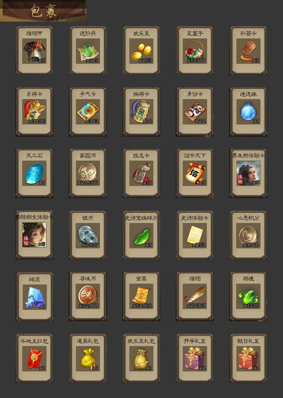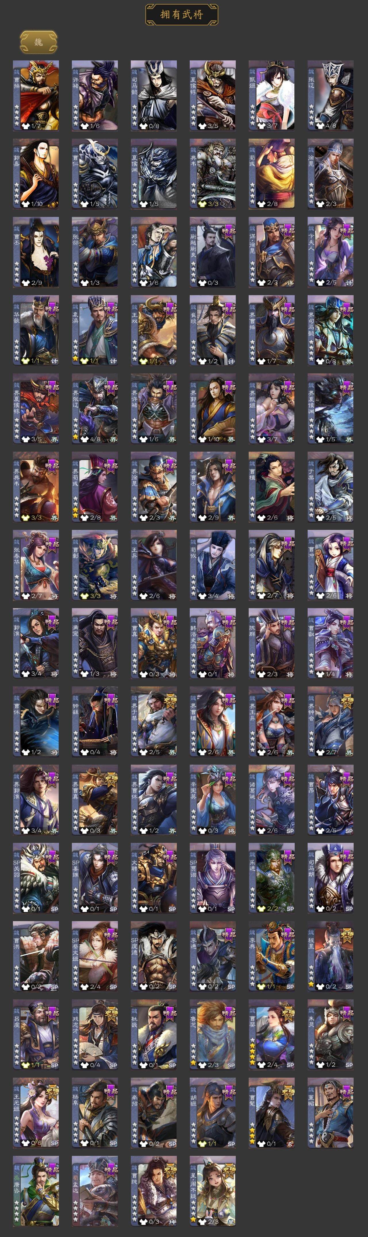 [15240572]【136】官阶:骠骑将军;vip等级:vip10;史诗武将数量:32;动态皮肤数量:26;武将总数:319;史诗宝珠数量:0;将魂数量:1335;神将:5;魏国史诗武将:22;蜀国史诗武将:6;吴国史诗武将:4;群史诗武将:9 神吕布神赵云神孙策神关羽神周瑜曹髦星周不疑王元姬界钟会界于禁界曹真曹婴曹纯戏志才关索谋赵云赵襄沙摩柯谯周花鬘谋孙策周处留赞界徐盛十常侍左慈星黄忠南华老仙沮授界左慈界李儒鲍信阎象神赵云-战龙在野动态星周不疑-才广志宏动态曹丕-气荡山河(动态)星周不疑-龙年清明动态甄姬-明珠耀躯(动态)sp蔡文姬-兔年冬日动态荀攸-妙策助军动态张春华-雪中舞刃动态钟会-谋谟之勋动态界钟会-谋谟之勋动态曹婴-兔年春节动态曹婴-锋芒毕露动态诸葛亮-龙年限定动态卧龙诸葛-龙跃凤鸣动态孙策-兔年中秋动态周处-义除三害动态吕蒙-剑起惊澜动态陆逊-龙年七夕动态孙权-永开吴祚动态孙寒华-莲华熠熠动态孙尚香-兔年春节动态徐盛-破军杀将动态孙鲁育-牛年端午动态刘赞-灵魂歌王动态灵雎-霜刃绚练动态袁绍-声震寰宇动态李儒-鸠杀少帝动态界李儒-鸠杀少帝动态sp赵云-单骑救主动态
