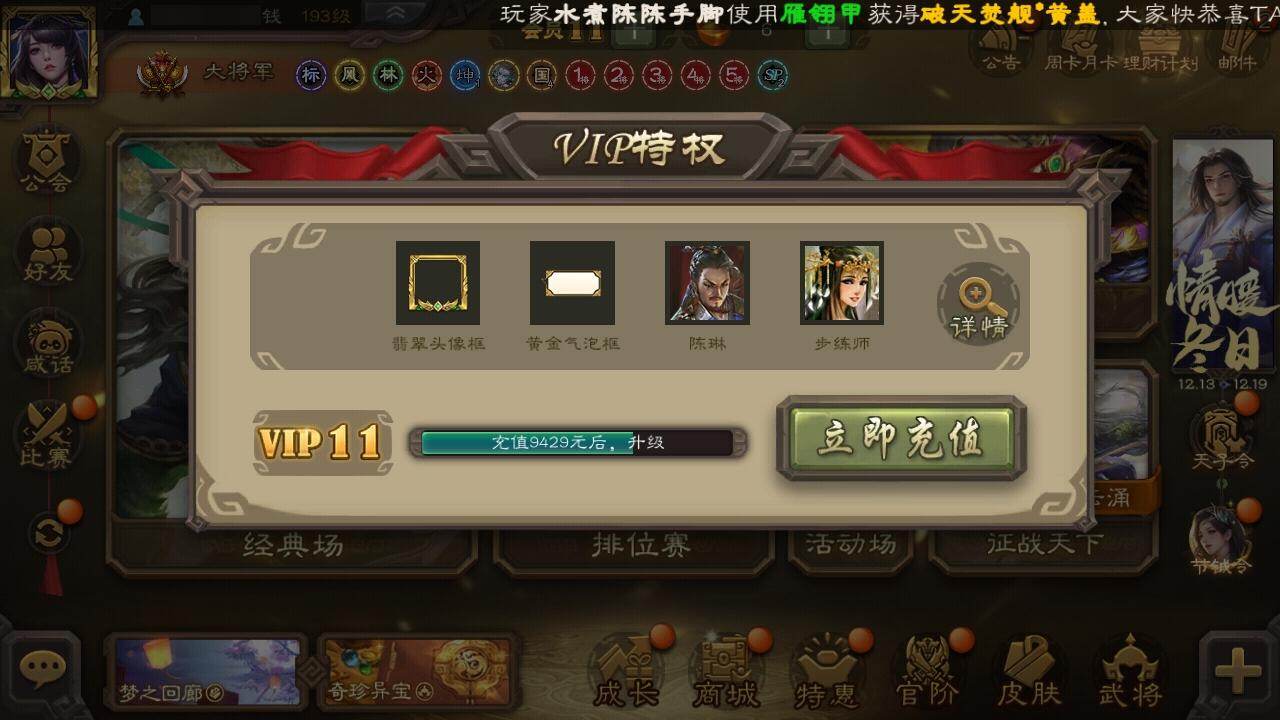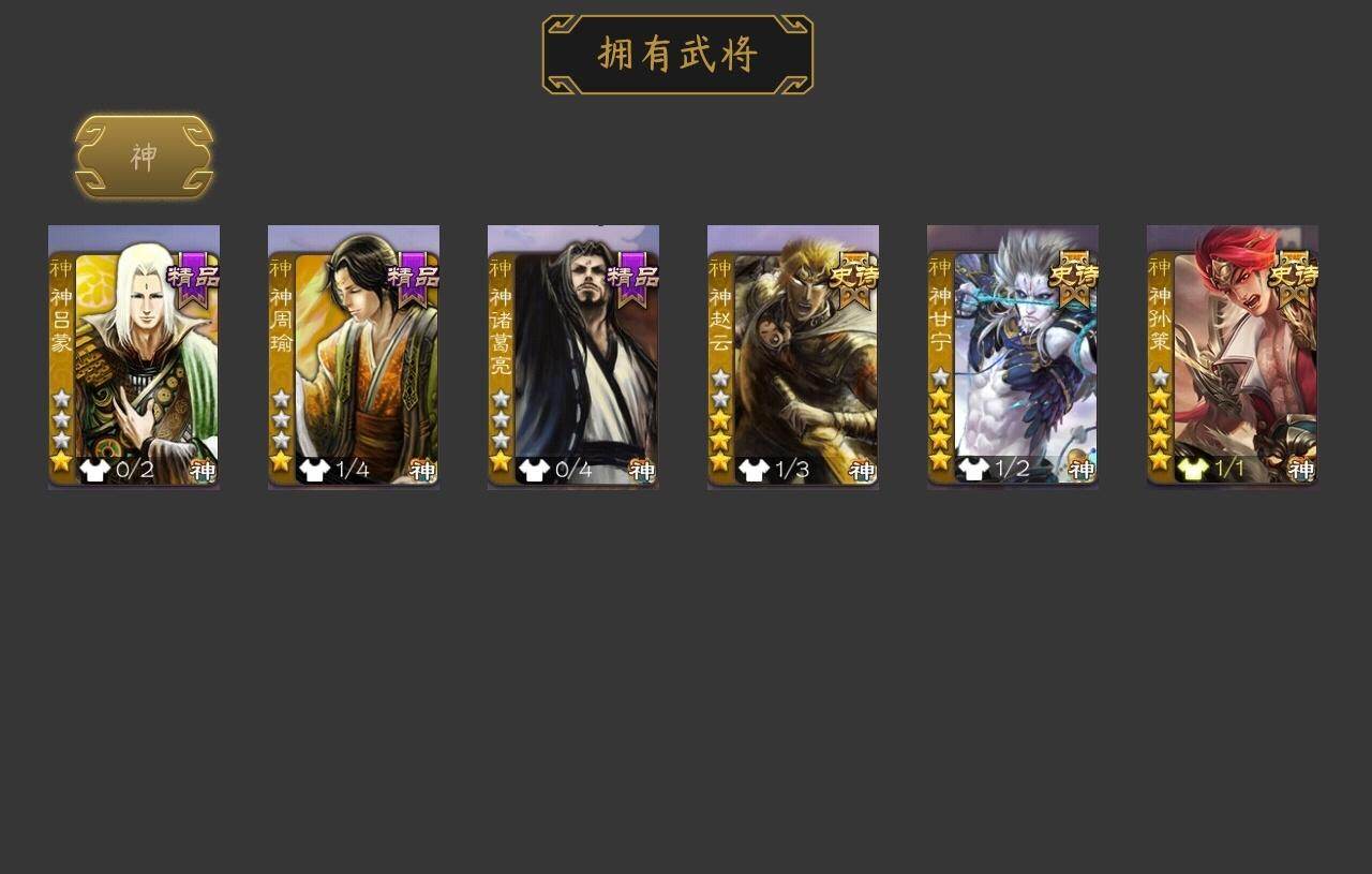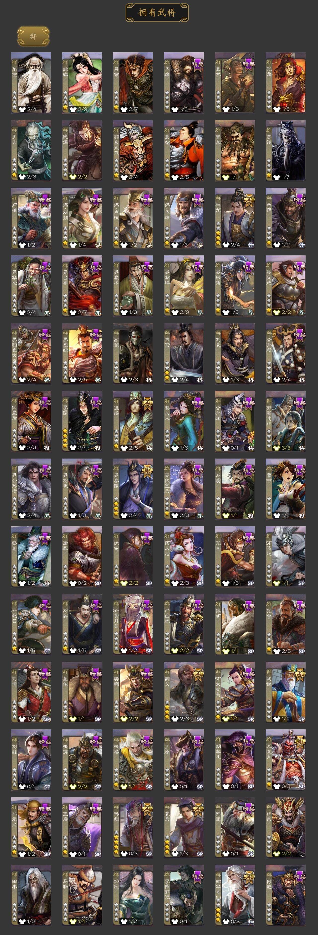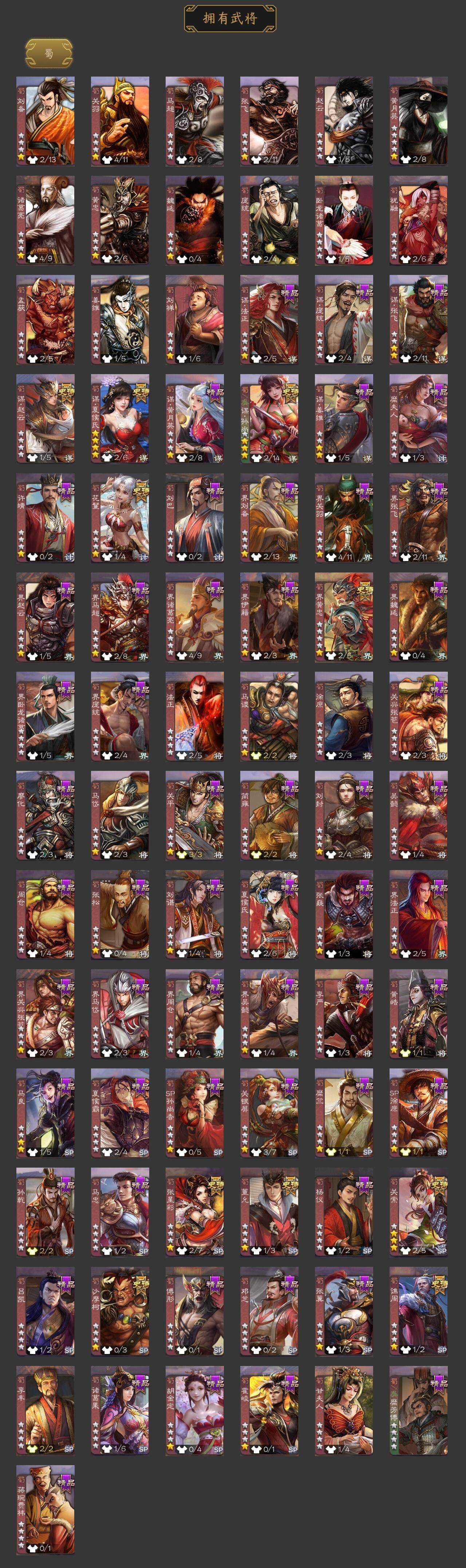[15240943]【141】官阶:大将军;vip等级:vip11;史诗武将数量:32;动态皮肤数量:31;武将总数:329;史诗宝珠数量:0;将魂数量:1714;神将:6;魏国史诗武将:16;蜀国史诗武将:11;吴国史诗武将:3;群史诗武将:9 神赵云神甘宁神孙策神吕蒙神周瑜神诸葛亮王粲文鸯界钟会嵇康曹纯戏志才关索谋孙尚香谋夏侯氏谋赵云张星彩沙摩柯谯周界黄忠花鬘董允周处留赞界徐盛谋黄月英裴秀杨彪陶谦麹义南华老仙沮授界李儒杜预神孙策-霸王再世动态神甘宁-万人辟易动态神赵云-战龙在野动态钟会-潜蛟觊天动态曹丕-气荡山河(动态)甄姬-明珠耀躯(动态)荀彧-驱虎吞狼动态王粲-笔翰如流动态曹婴-兔年春节动态曹婴-锋芒毕露动态王元姬-鼠年冬至动态诸葛亮-龙年限定动态夏侯氏-猪年中秋动态关银屏-兔年春节动态张星彩-临军对阵动态关索-虎年七夕动态李丰-太仓聚粟动态周处-义除三害动态孙策-虎踞江东动态陆逊-烈火烛天动态大乔-猪年七夕动态界大乔-猪年七夕动态徐盛-破军杀将动态刘赞-抗音而歌动态文鸯-势若万钧动态灵雎-霜刃绚练动态麹义-扬刀立威动态谋刘赪-明良千古动态李儒-鸠杀少帝动态界李儒-鸠杀少帝动态何太后-蛇蝎为心动态张鲁-虎年冬至动态
