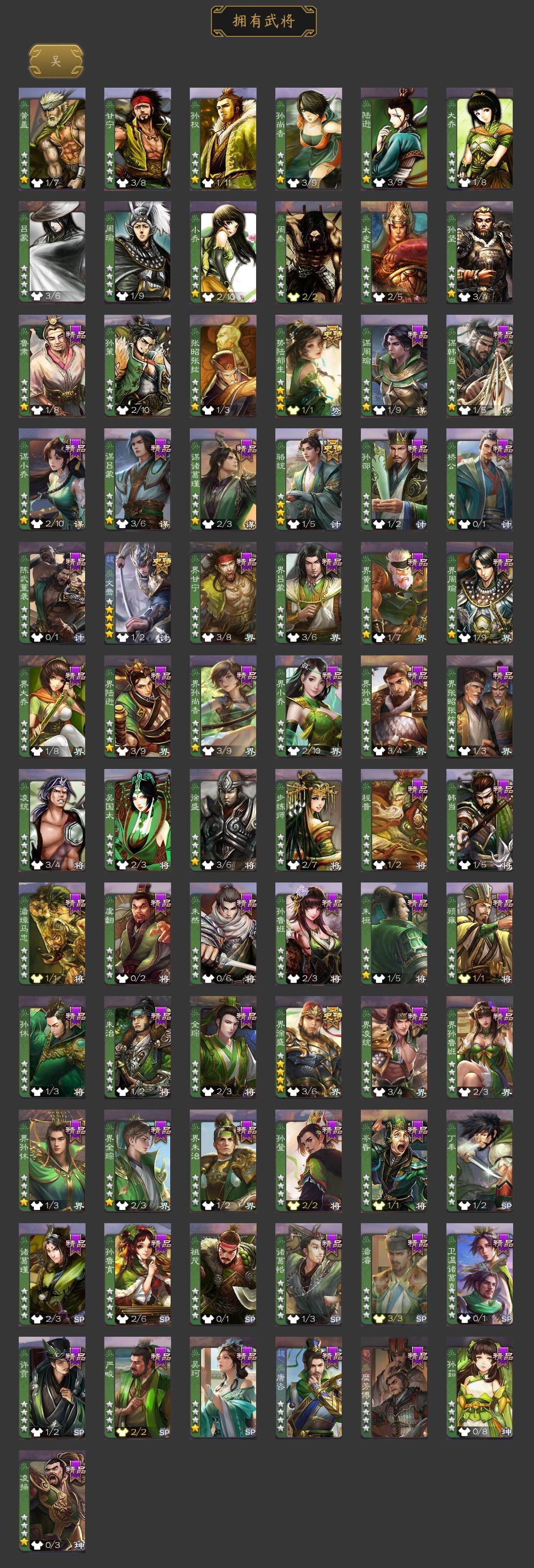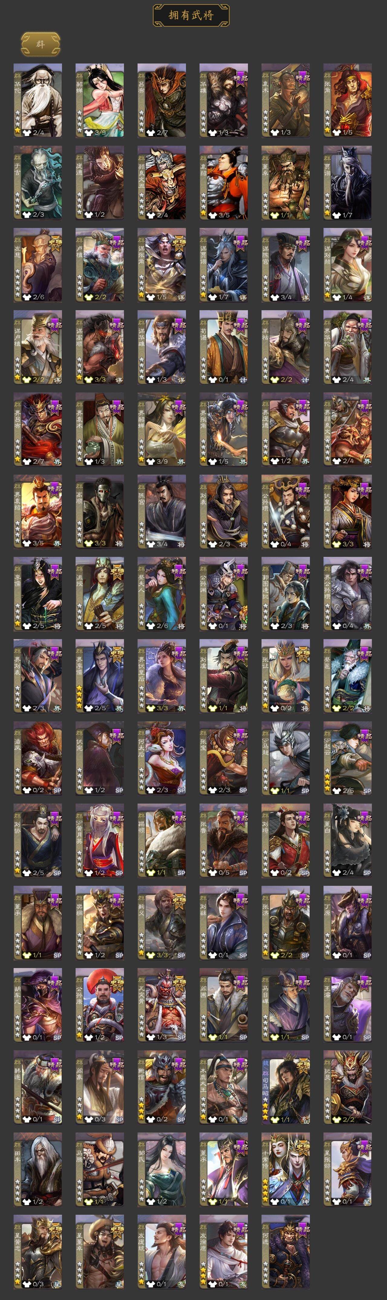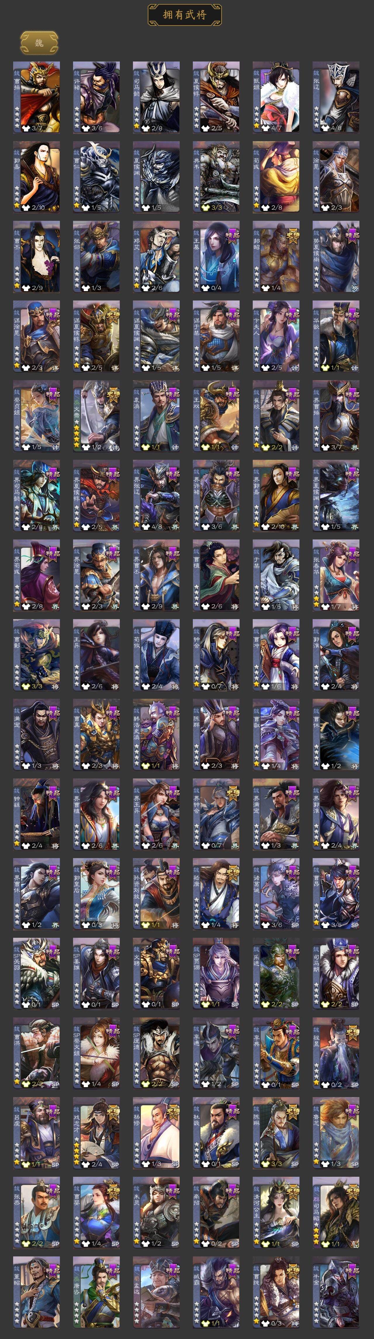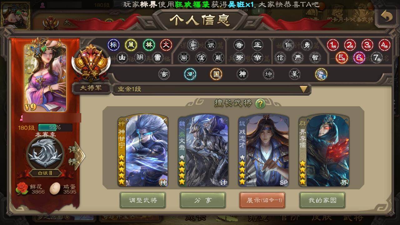 [15241121]【905】官阶:大将军;vip等级:vip9;史诗武将数量:36;动态皮肤数量:29;武将总数:347;史诗宝珠数量:8;将魂数量:4979;神将:5;魏国史诗武将:24;蜀国史诗武将:6;吴国史诗武将:3;群史诗武将:14 神吕布神赵云神甘宁神吕蒙神周瑜杨修文鸯魏-司马昭界钟会嵇康郝昭陈琳曹婴曹纯戏志才谋夏侯惇清河公主谋赵云谋马超诸葛瞻沙摩柯傅佥花鬘骆统界徐盛势陆郁生谋黄月英十常侍左慈张让星黄忠麹义沮授界李儒公孙康鲍信谋张角阎象友徐庶星董卓神太史慈-勇撼日月动态神吕蒙-心生万象神郭嘉-半醉山河神甘宁-万人辟易动态神赵云-神龙天降星周不疑-才广志宏动态曹植-龙年中秋动态钟繇-安民护祚(动态)星周不疑-龙年清明动态甄姬-明珠耀躯(动态)曹丕-龙年中秋动态王粲-笔翰如流动态戏志才-举棋若定动态曹婴-兔年春节动态司马昭-昭威淮南(动态)星徐晃-斧引霹雳动态清河公主-魅影萦心动态诸葛亮-龙年限定动态马超-虎年冬至动态黄月英-木牛流马动态界黄月英-木牛流马动态张星彩-虎年端午动态鲍三娘-虎年七夕动态吕蒙-剑起惊澜动态陆逊-蛇年清明动态文鸯-势若万钧动态高顺-每战必克动态麹义-扬刀立威动态李儒-鸠杀少帝动态界李儒-鸠杀少帝动态sp赵云-威名尽显动态左慈-蛇年限定动态