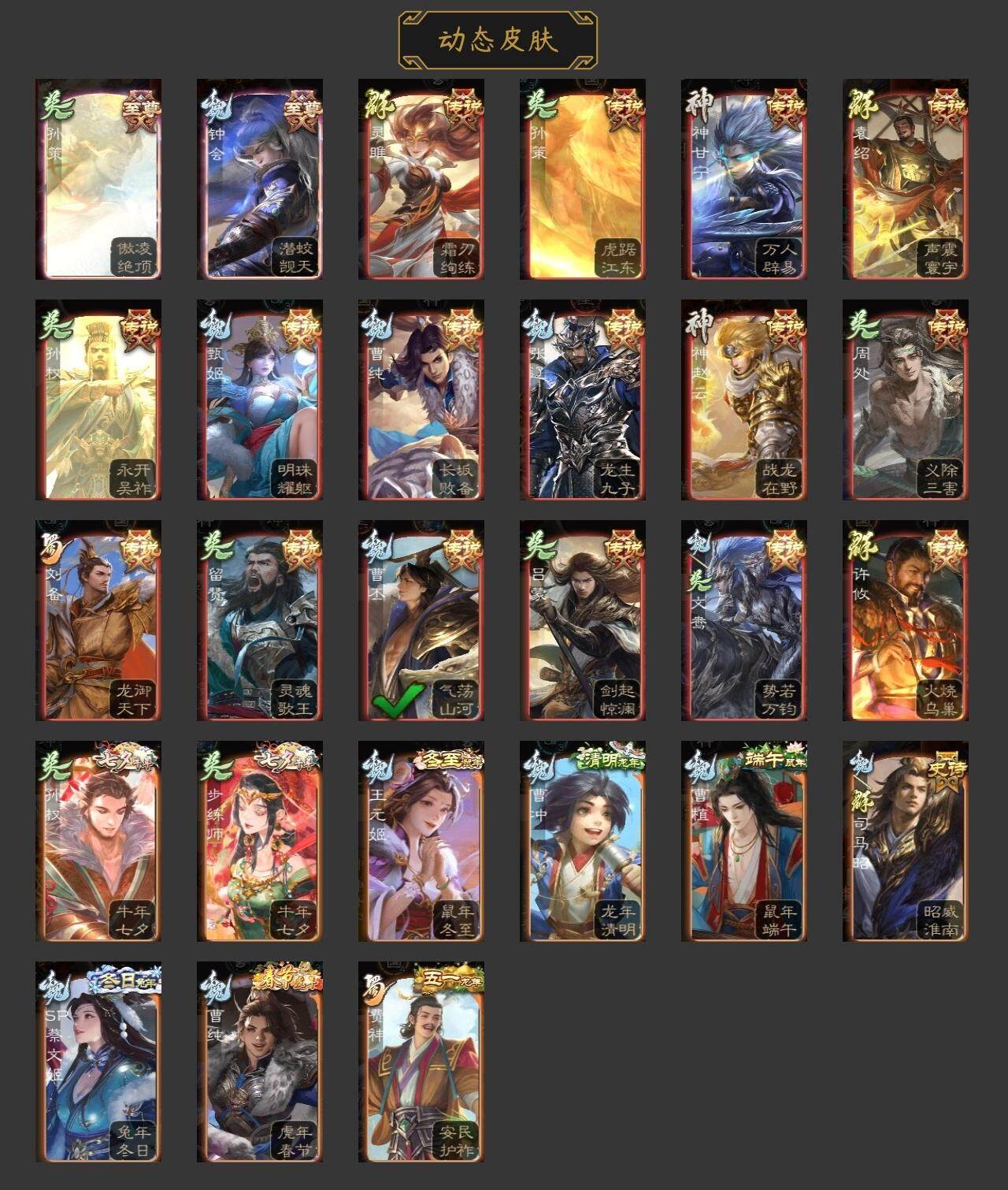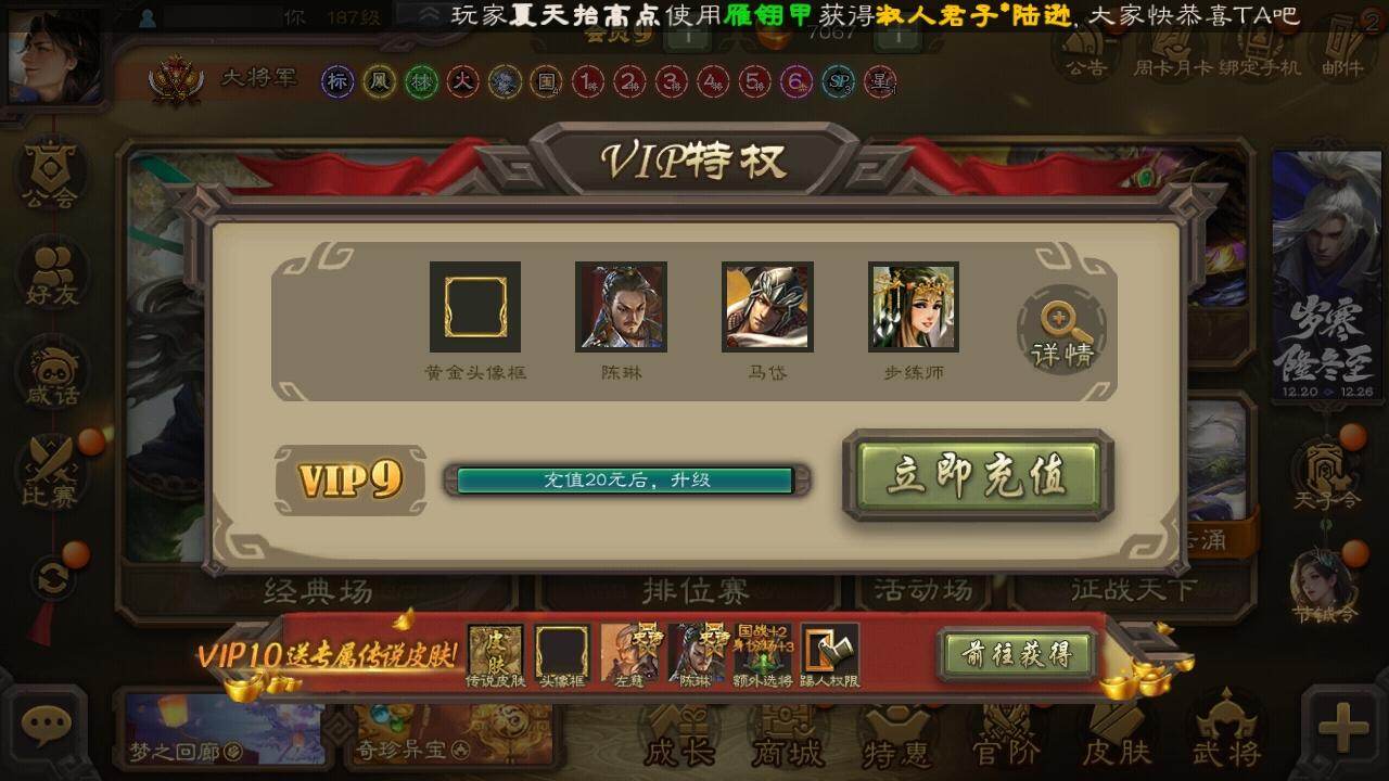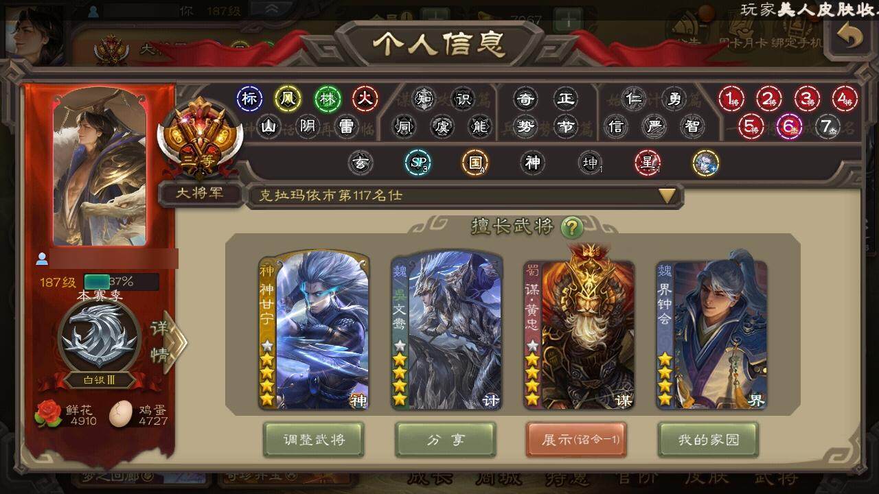 [15241619]【437】官阶:大将军;vip等级:vip9;史诗武将数量:44;动态皮肤数量:26;武将总数:353;史诗宝珠数量:10;将魂数量:6679;神将:7;魏国史诗武将:22;蜀国史诗武将:8;吴国史诗武将:7;群史诗武将:13 神赵云神陆逊神甘宁神张辽神吕蒙神周瑜神诸葛亮郭女王星周不疑王粲杨修文鸯王元姬魏-司马昭界钟会界曹真郝昭曹纯戏志才谋黄忠谋赵云谋马超赵襄张星彩王平谯周花鬘谋孙策周处骆统留赞界徐盛界步练师贺齐左慈张让星黄忠陶谦苏飞麹义南华老仙沮授界李儒公孙康张绣李傕许攸神甘宁-万人辟易动态神赵云-战龙在野动态钟会-潜蛟觊天动态曹丕-气荡山河(动态)甄姬-明珠耀躯(动态)sp蔡文姬-兔年冬日动态邓艾-神兵天降动态界邓艾-神兵天降动态界曹植-鼠年端午动态曹纯-虎年春节动态曹纯-长坂败备动态王元姬-鼠年冬至动态司马昭-昭威淮南(动态)张辽-龙生九子(动态)刘备-龙御天下动态费祎-安民护祚(动态)周处-义除三害动态吕蒙-剑起惊澜动态孙权-永开吴祚动态孙策-虎踞江东动态孙权-牛年七夕动态界孙权-牛年七夕动态步练师-牛年七夕动态界步练师-牛年七夕动态刘赞-灵魂歌王动态孙策-傲凌绝顶动态文鸯-势若万钧动态灵雎-霜刃绚练动态许攸-火烧乌巢动态袁绍-声震寰宇动态