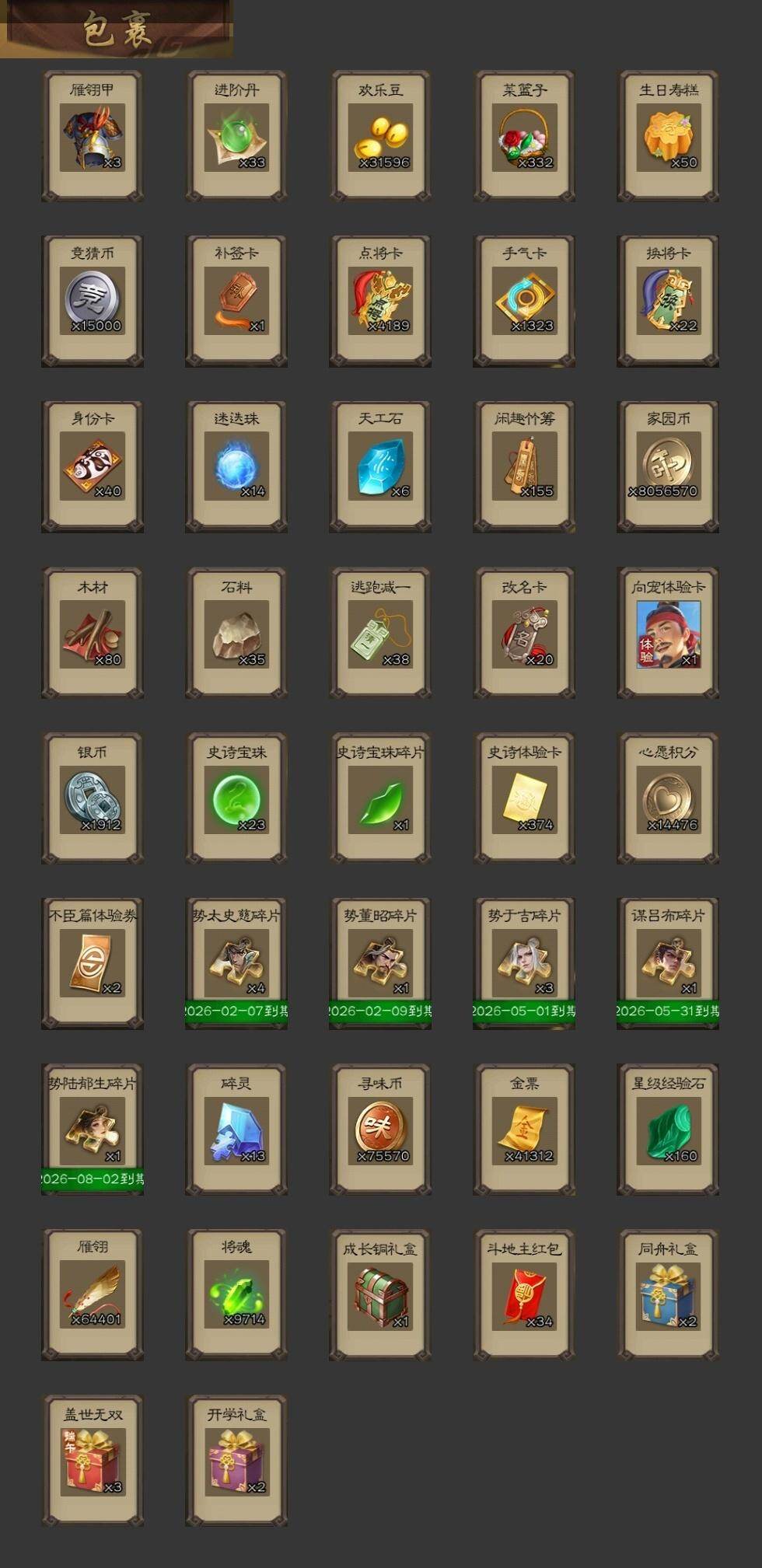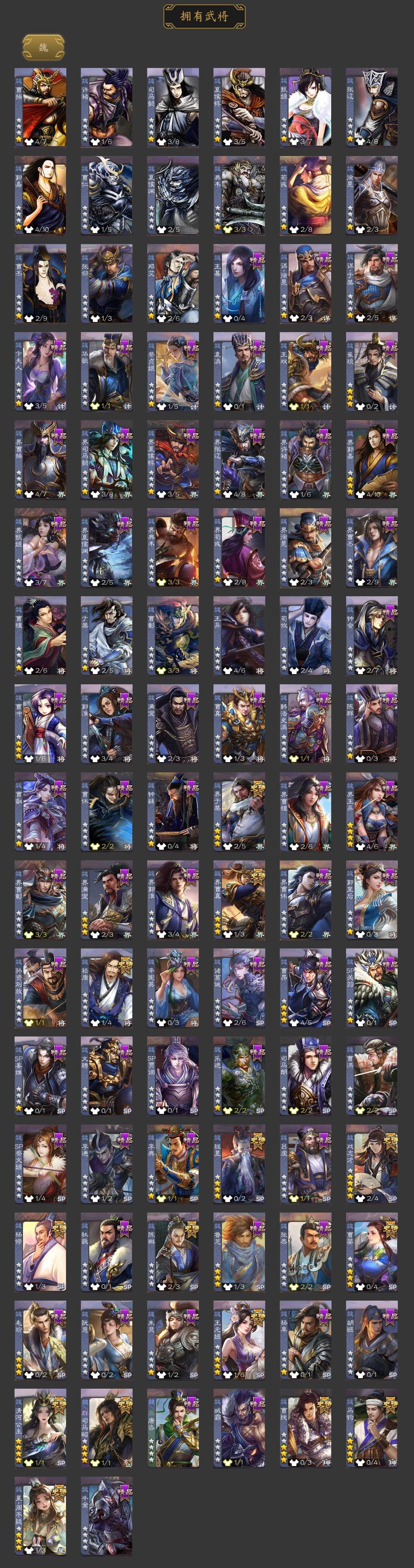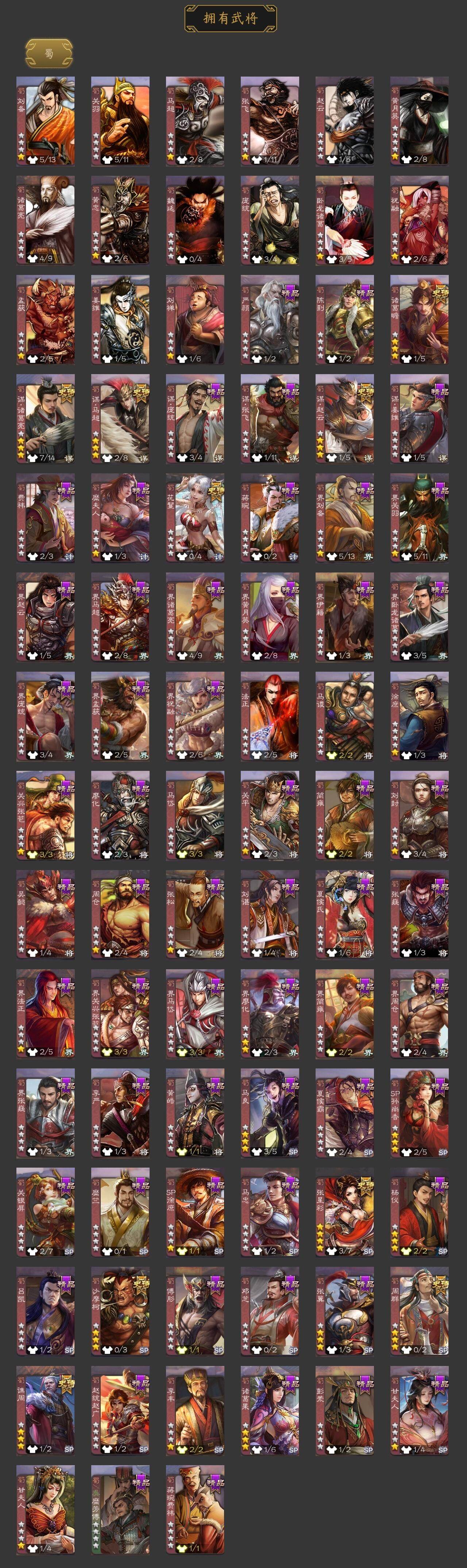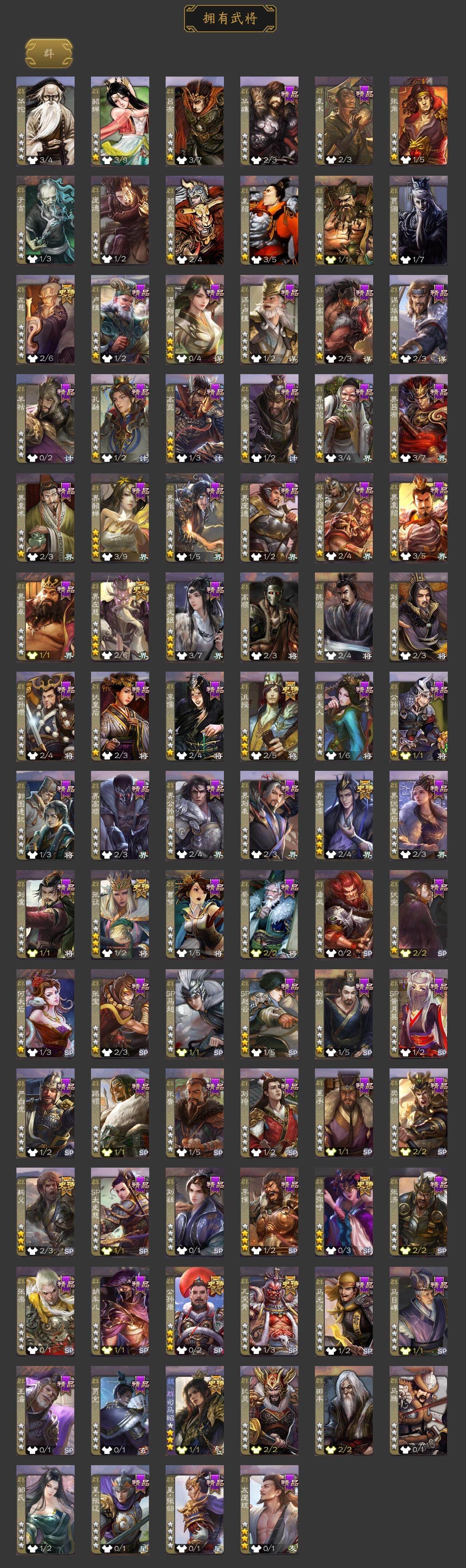 [15241794]【717】官阶:大将军;vip等级:vip8;史诗武将数量:41;动态皮肤数量:42;武将总数:367;史诗宝珠数量:23;将魂数量:9714;神将:6;魏国史诗武将:27;蜀国史诗武将:9;吴国史诗武将:6;群史诗武将:9 神赵云神郭嘉神太史慈神吕蒙神周瑜神诸葛亮星周不疑杨修王元姬魏-司马昭马钧界于禁界曹真嵇康陈琳曹婴曹纯戏志才清河公主谋诸葛亮谋赵云谋马超诸葛瞻周群张星彩沙摩柯谯周花鬘谋孙策吴景孙寒华骆统界朱然界徐盛左慈张让麹义沮授界左慈界李儒公孙康卑弥呼李傕神郭嘉-虎年清明动态神曹操-天下归心郭嘉-以身证道(动态)星周不疑-才广志宏动态曹丕-气荡山河(动态)甄姬-明珠耀躯(动态)sp蔡文姬-兔年冬日动态荀彧-驱虎吞狼动态邓艾-神兵天降动态张春华-雪中舞刃动态曹昂-竭战麟伤动态戏志才-举棋若定动态王元姬-鼠年冬至动态司马昭-昭威淮南(动态)王异-倾天泻雨动态清河公主-魅影萦心动态刘备-龙御天下动态卧龙诸葛-龙跃凤鸣动态刘备-明良千古动态关羽-明良千古动态黄月英-明良千古动态诸葛瞻-绵竹之殇动态界刘备-明良千古动态界黄月英-明良千古动态张星彩-虎年端午动态张星彩-临军对阵动态关索-虎年七夕动态鲍三娘-虎年七夕动态李丰-太仓聚粟动态胡金定-明良千古动态诸葛果-蛇年限定动态卧龙诸葛-火烧博望动态孙策-兔年清明动态周处-义除三害动态吕蒙-剑起惊澜动态孙权-永开吴祚动态孙策-虎踞江东动态孙寒华-莲华熠熠动态孙寒华-威灵尽显动态周瑜-免年清明动态孙权-吴王六剑动态孙尚香-星流霆击动态界孙权-吴王六剑动态界孙尚香-星流霆击动态孙鲁育-牛年端午动态孙茹-烟水悠悠动态鲁肃-蛇年端午动态貂蝉-舞惑群心动态袁绍-声震寰宇动态麹义-扬刀立威动态吕布-傲睨万物动态李儒-鸠杀少帝动态界李儒-鸠杀少帝动态左慈-蛇年限定动态