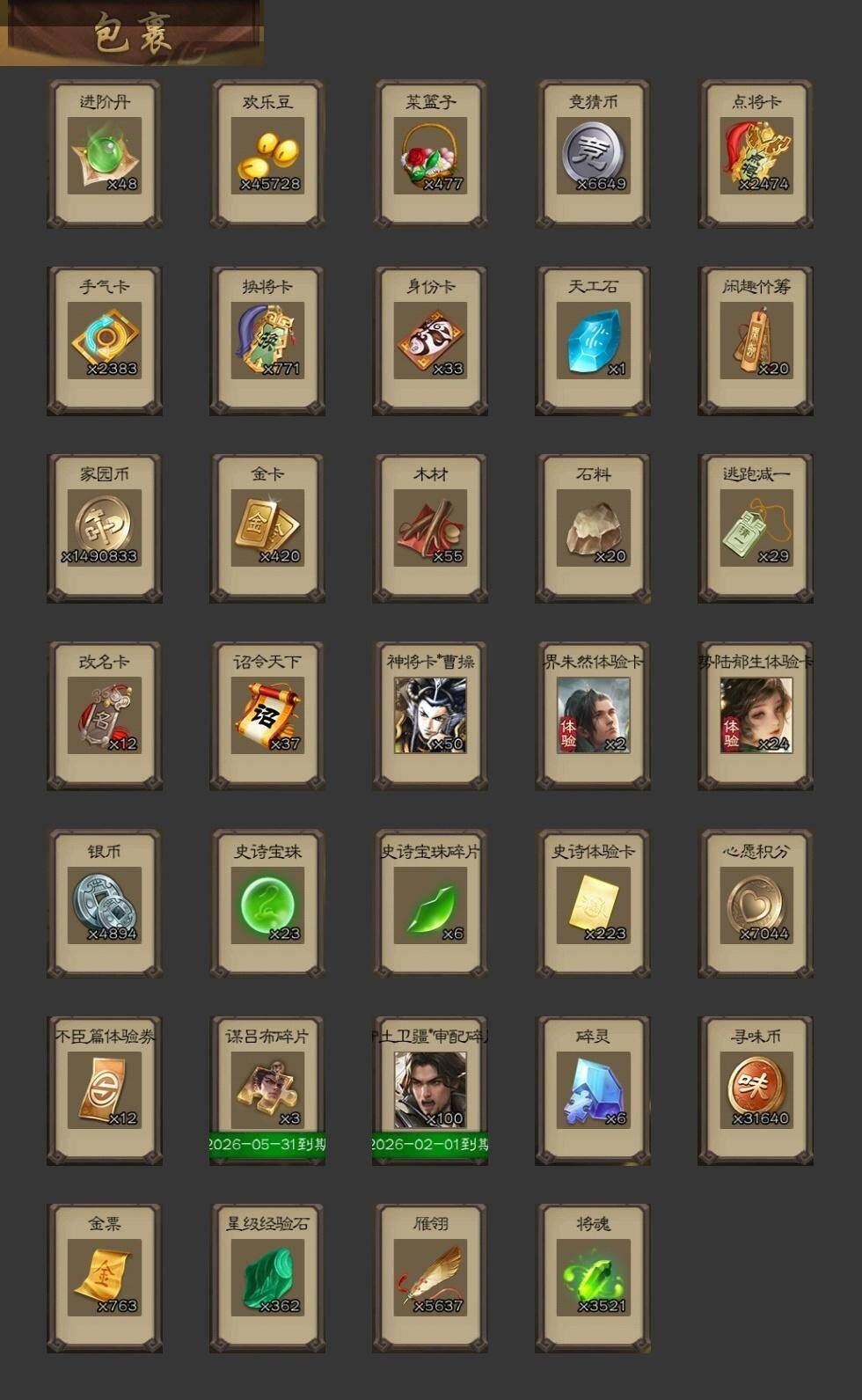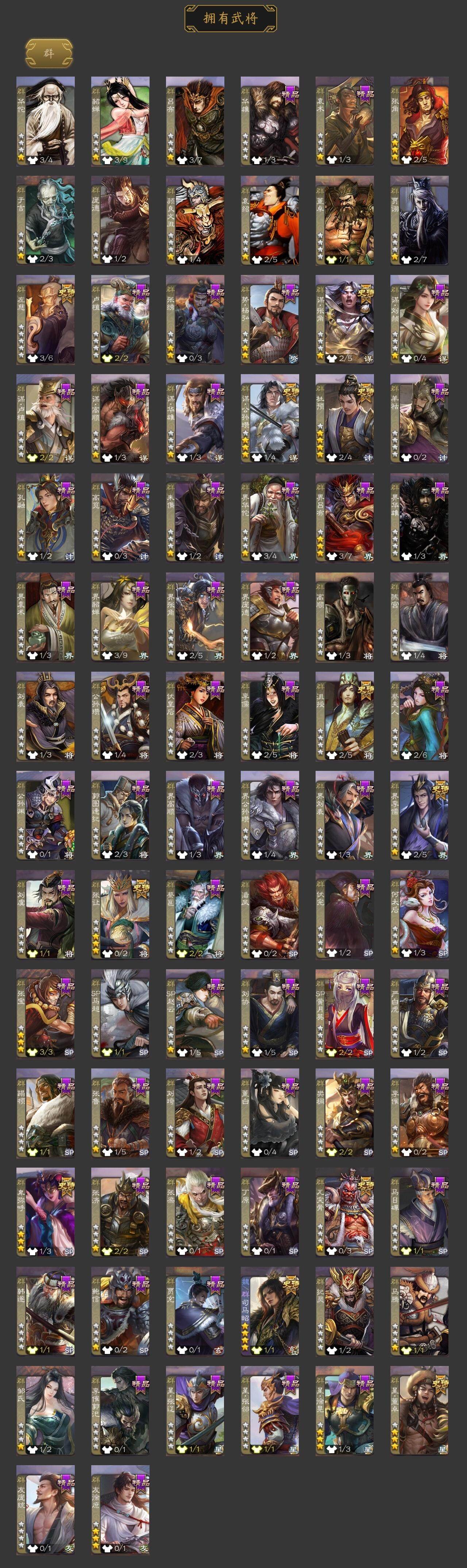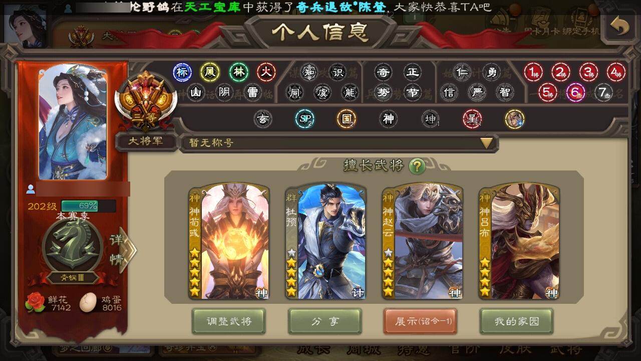 [15241914]【370】官阶:大将军;vip等级:vip9;史诗武将数量:32;动态皮肤数量:36;武将总数:345;史诗宝珠数量:23;将魂数量:3521;神将:6;魏国史诗武将:28;蜀国史诗武将:6;吴国史诗武将:3;群史诗武将:14 神吕布神赵云神荀彧神吕蒙神周瑜神诸葛亮星周不疑魏-司马昭界钟会界曹真曹婴曹纯戏志才谋曹丕清河公主关索谋赵云谋马超谯周界黄忠花鬘骆统界徐盛势陆郁生谋黄月英谋公孙瓒左慈张让沮授界李儒杜预卑弥呼鲍信谋张角张绣李傕友徐庶星董卓神鲁肃-九州为局神荀彧-虎年清明动态神荀彧-匡汉延祚动态神赵云-鳞振九霄神吕布-冠绝天下动态郭嘉-以身证道(动态)星周不疑-才广志宏动态曹丕-气荡山河(动态)甄姬-明珠耀躯(动态)曹丕-龙年中秋动态sp蔡文姬-兔年冬日动态荀彧-驱虎吞狼动态钟会-谋谟之勋动态界钟会-谋谟之勋动态曹婴-兔年春节动态司马昭-昭威淮南(动态)张辽-龙生九子(动态)星徐晃-斧引霹雳动态清河公主-魅影萦心动态花鬘-依心缱绻动态刘备-明良千古动态马超-虎年冬至动态界刘备-明良千古动态鲍三娘-虎年七夕动态鲍三娘-柳娇桃艳动态甘夫人-为君担忧动态李丰-太仓聚粟动态孙策-兔年清明动态孙权-吴王六剑动态孙尚香-星流霆击动态界孙权-吴王六剑动态界孙尚香-星流霆击动态貂蝉-舞惑群心动态杜预-龙吟破竹动态吕布-傲睨万物动态张角-黄天当立动态李儒-鸠杀少帝动态界李儒-鸠杀少帝动态张宝-苍天已死动态左慈-蛇年限定动态