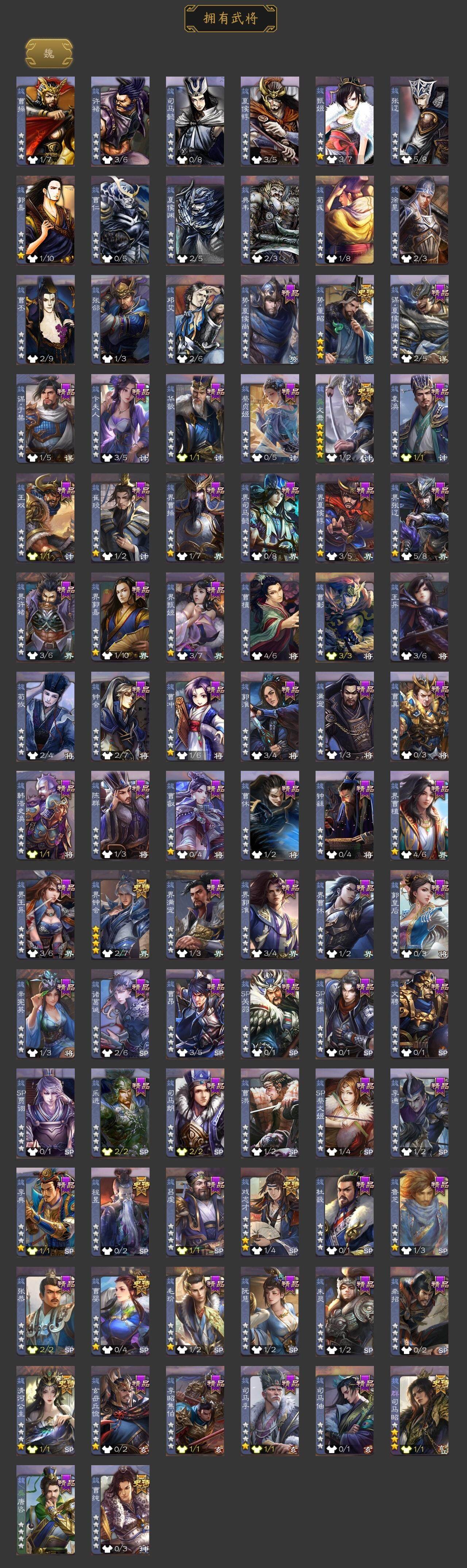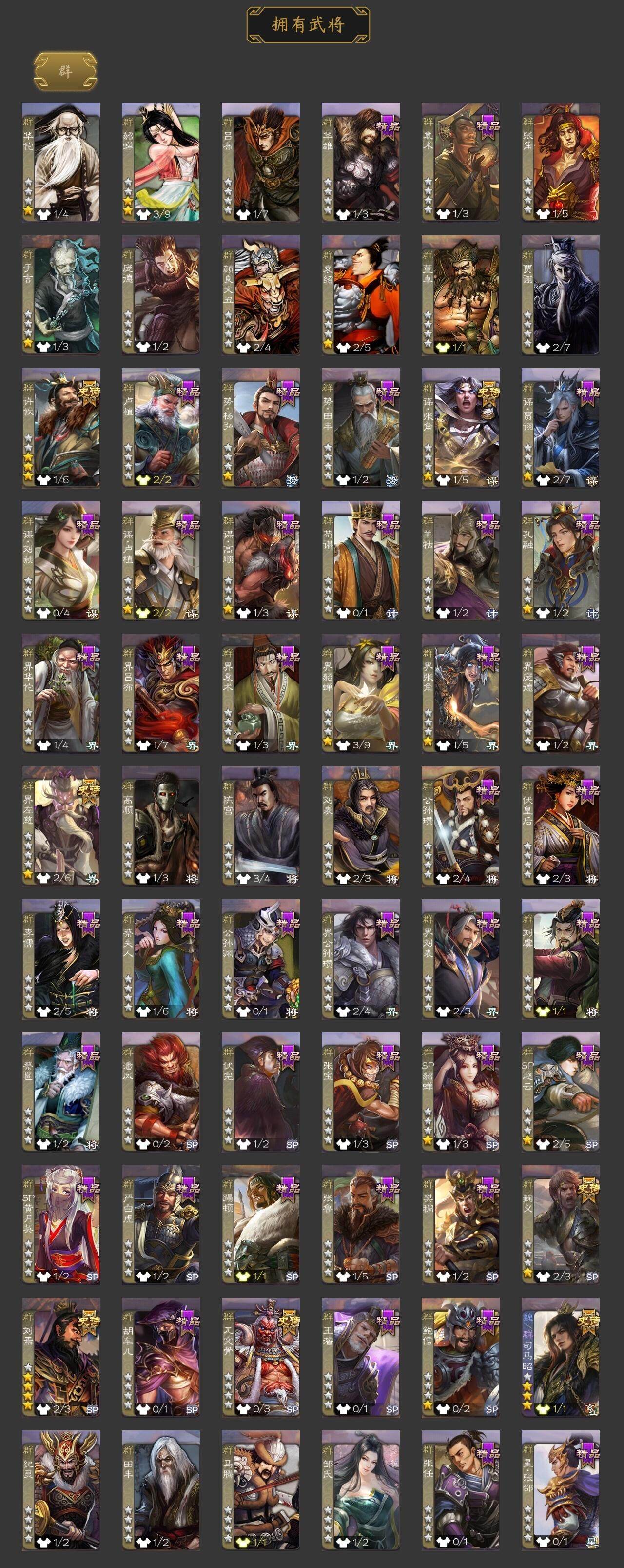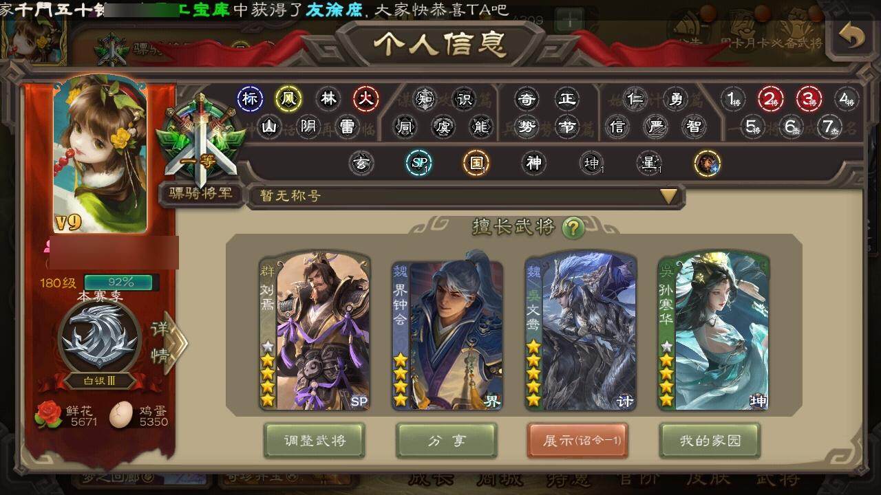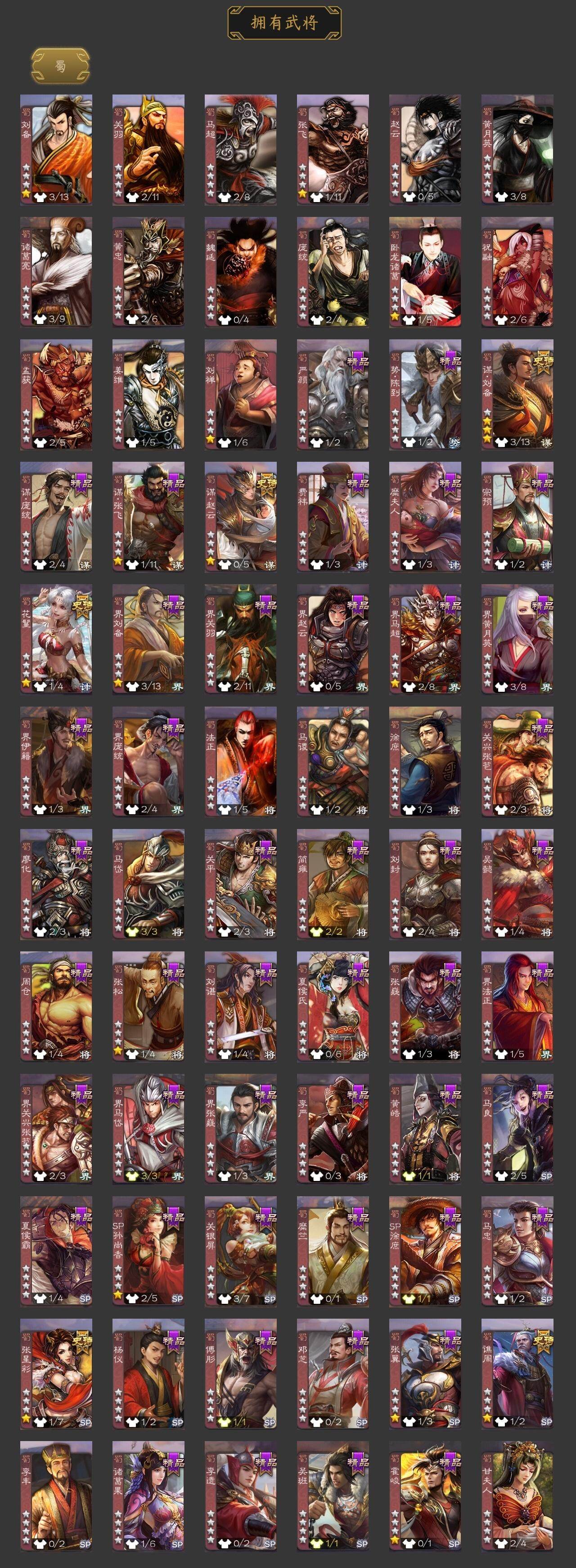 [15242229]【942】官阶:骠骑将军;vip等级:vip9;史诗武将数量:29;动态皮肤数量:28;武将总数:298;史诗宝珠数量:5;将魂数量:2514;神将:4;魏国史诗武将:13;蜀国史诗武将:5;吴国史诗武将:6;群史诗武将:6 神吕布神赵云神陆逊神吕蒙文鸯魏-司马昭界钟会曹婴曹纯戏志才势董昭清河公主谋刘备谋赵云张星彩谯周花鬘吴景孙皓孙寒华界朱然界徐盛势陆郁生麹义刘焉界左慈鲍信谋张角许攸星周不疑-才广志宏动态曹植-龙年中秋动态钟会-潜蛟觊天动态甄姬-明珠耀躯(动态)朱灵-以战破氐动态司马昭-昭威淮南(动态)清河公主-魅影萦心动态刘备-明良千古动态界刘备-明良千古动态关索-虎年七夕动态小乔-兔年七夕动态周处-义除三害动态吕蒙-剑起惊澜动态孙寒华-威灵尽显动态徐盛-破军杀将动态孙鲁育-牛年端午动态文鸯-势若万钧动态貂蝉-舞惑群心动态麹义-扬刀立威动态李儒-鸠杀少帝动态何太后-蛇蝎为心动态刘焉-雄踞益州动态sp赵云-威名尽显动态刘焉-龙兴蜀川动态左慈-蛇年限定动态
