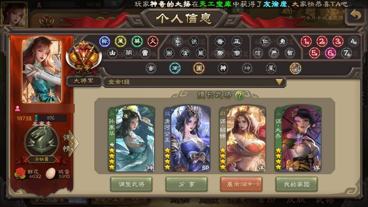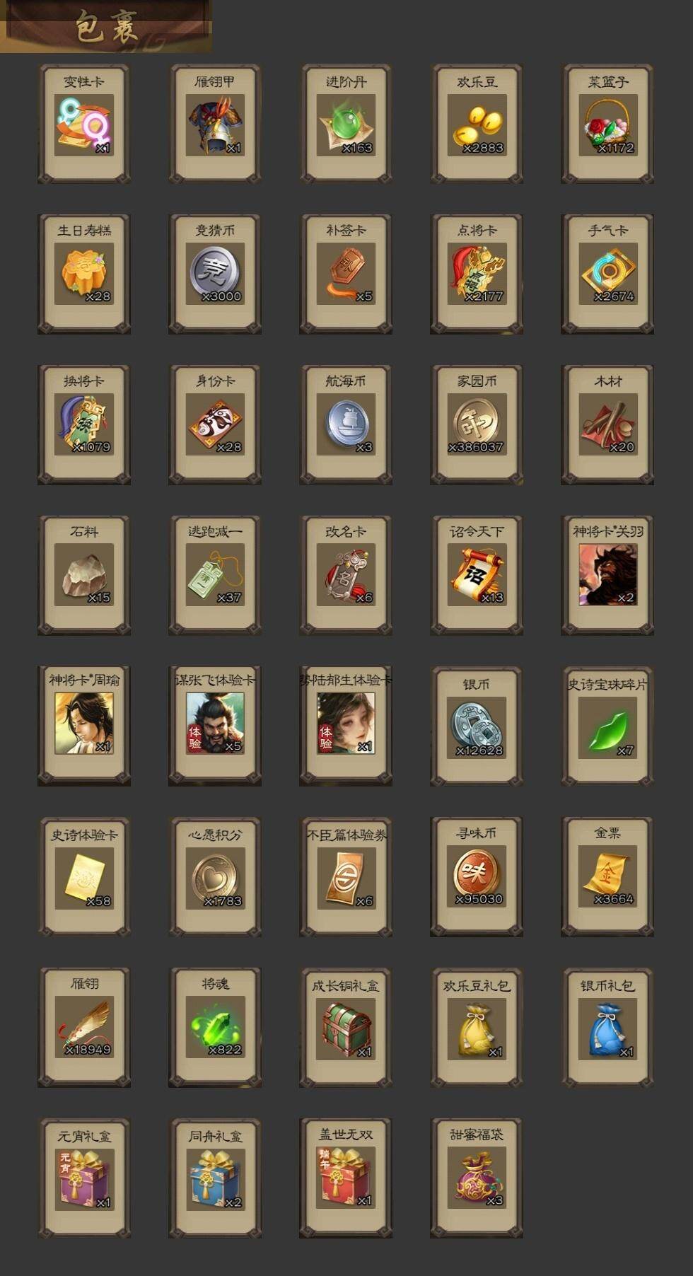 [15242493]【147】官阶:大将军;vip等级:vip9;史诗武将数量:31;动态皮肤数量:33;武将总数:320;史诗宝珠数量:0;将魂数量:822;神将:5;魏国史诗武将:8;蜀国史诗武将:6;吴国史诗武将:4;群史诗武将:11 神吕布神赵云神刘备神荀彧神周瑜曹髦王元姬界钟会曹纯戏志才清河公主谋夏侯氏谋赵云谋马超张星彩谯周花鬘孙寒华界朱然界徐盛界步练师谋貂蝉裴秀张让麹义南华老仙界李儒公孙康杜预卑弥呼张绣李傕神荀彧-虎年清明动态神荀彧-匡汉延祚动态神诸葛亮-观星唤雨神赵云-战龙在野动态荀彧-驱虎吞狼动态张春华-牛年立冬动态界曹植-鼠年端午动态清河公主-魅影萦心动态刘备-龙御天下动态马超-牛年春节动态诸葛亮-虎年中秋动态界马超-牛年春节动态夏侯氏-明良千古动态关银屏-虎年端午动态张星彩-猪年中秋动态张星彩-虎年端午动态鲍三娘-虎年七夕动态李丰-太仓聚粟动态诸葛果-虎年中秋动态诸葛果-蛇年限定动态周处-义除三害动态黄盖-兔年端午动态孙策-虎踞江东动态孙寒华-威灵尽显动态大乔-猪年七夕动态界大乔-猪年七夕动态徐盛-破军杀将动态曹节-龙年中秋动态灵雎-霜刃绚练动态貂蝉-舞惑群心动态袁绍-声震寰宇动态吕布-傲睨万物动态何太后-蛇蝎为心动态苏飞-肝胆相照动态