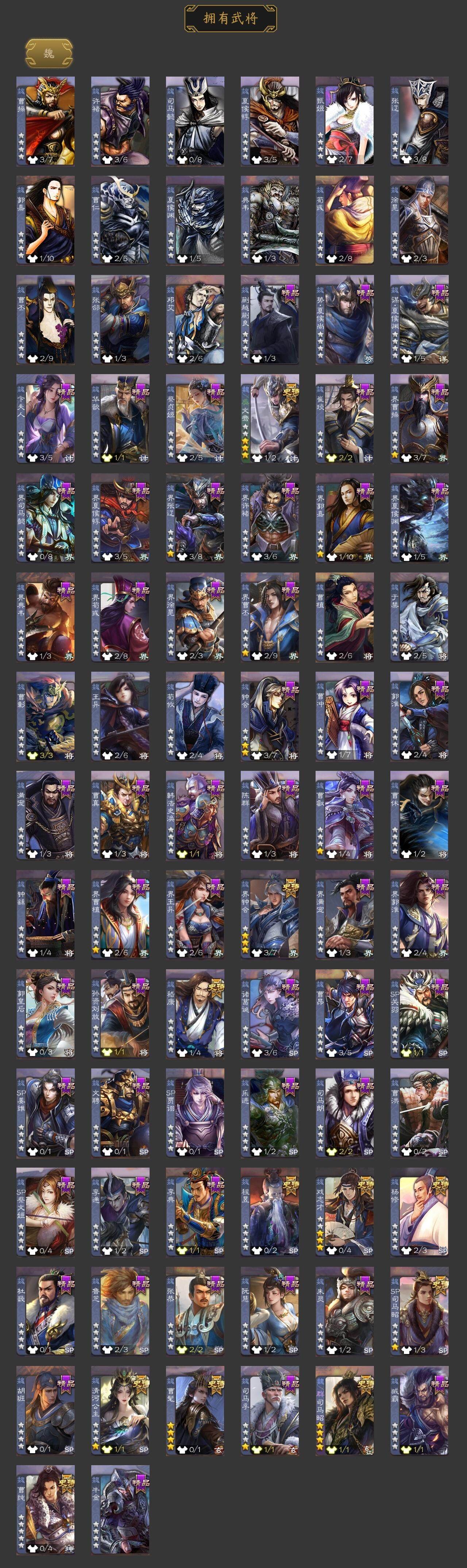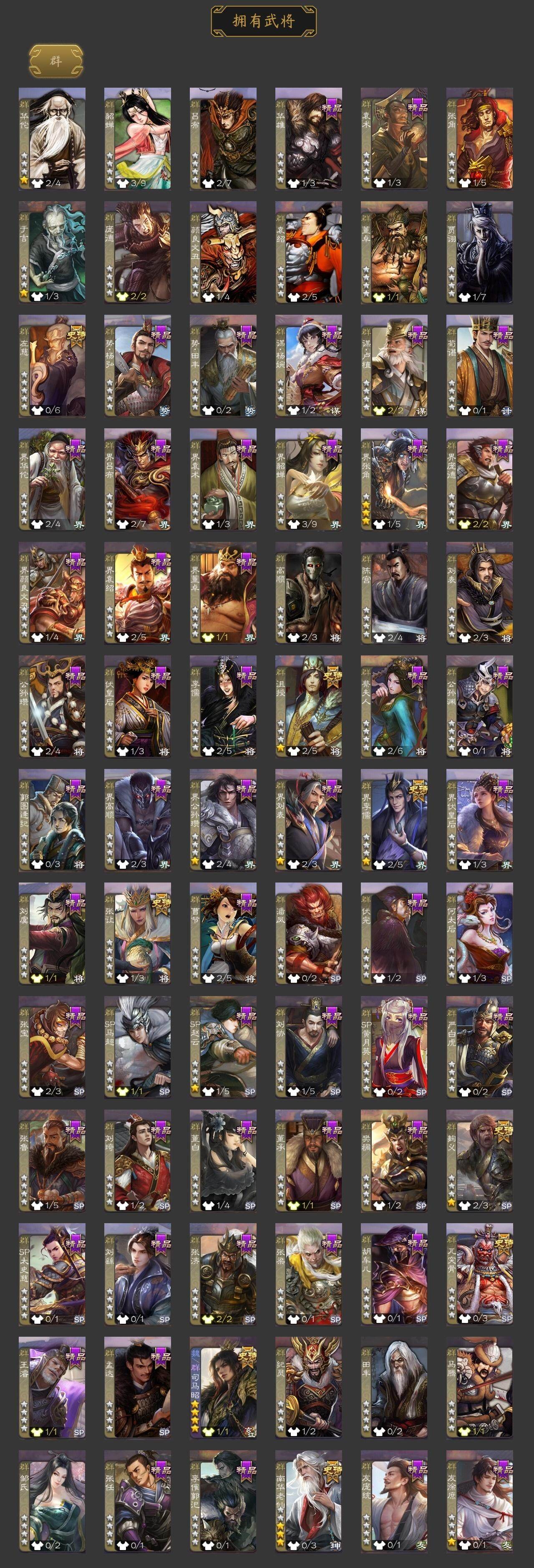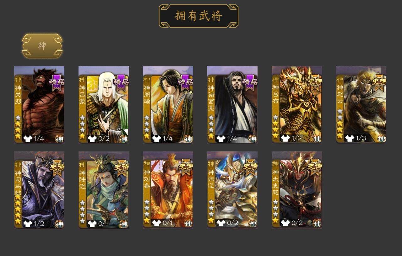[15298533]【1052】官阶:骠骑将军;vip等级:vip10;史诗武将数量:32;动态皮肤数量:23;武将总数:322;史诗宝珠数量:0;将魂数量:3095;神将:8;魏国史诗武将:18;蜀国史诗武将:4;吴国史诗武将:5;群史诗武将:9 神吕布神赵云神司马懿神陆逊神刘备神张辽神太史慈神诸葛亮sp司马昭曹髦杨修界钟会嵇康曹纯戏志才清河公主程昱关索马云騄沙摩柯鲍三娘留赞界朱然界徐盛文鸯左慈张让麹义南华老仙沮授界李儒兀突骨司马昭神吕蒙神周瑜神关羽势夏侯尚sp关羽sp蔡文姬乐进曹昂诸葛诞朱灵文聘sp姜维钟会曹冲郭淮满宠界王异界曹操界司马懿界夏侯惇界张辽界许褚界郭嘉李典曹真韩浩史涣陈群曹叡曹休钟繇司马朗李通郭皇后孙资刘放鲁芝蒯越蒯良界典韦界荀彧界徐晃杜畿界曹丕张恭界曹植界满宠界郭淮卞夫人华歆蔡贞姬崔琰阮慧胡班司马孚谋夏侯渊牛金界夏侯渊臧霸势陈到sp孙尚香关银屏夏侯霸马良关兴张苞廖化界马岱关平简雍刘封界法正界关兴张苞界刘备界关羽界赵云界马超sp徐庶吴懿周仓张松刘谌夏侯氏糜竺马忠李严黄皓界诸葛亮严颜界伊籍界卧龙诸葛界庞统界孟获界祝融界姜维吕凯张翼杨仪邓芝傅肜糜夫人刘巴谋庞统谋黄月英界张嶷吴班李遗霍峻诸葛果甘夫人势陈祗鲁肃凌操诸葛瑾孙鲁育程普韩当潘璋马忠虞翻朱然界甘宁界吕蒙界黄盖界周瑜界大乔界陆逊孙鲁班朱桓顾雍孙休朱治全琮孙登岑昏界孙权界孙尚香潘濬孙亮严畯界孙坚吕岱周鲂周妃界张昭张纮卫温诸葛直界韩当桥公张温陈武董袭界顾雍谋韩当谋周瑜界全琮界朱治谋小乔张布谋诸葛瑾界小乔友徐庶友庞统伏完刘协界袁术sp赵云张宝伏皇后李儒界张角华雄袁术界华佗界吕布公孙瓒蔡夫人公孙渊郭图逢纪张鲁严白虎sp黄月英董白刘虞曹节界貂蝉sp太史慈张梁刘琦界庞德界颜良文丑界袁绍张济樊稠界董卓刘繇界高顺董承界刘表界公孙瓒胡车儿界伏皇后荀谌谋杨婉王濬谋卢植杨弘张任李傕
