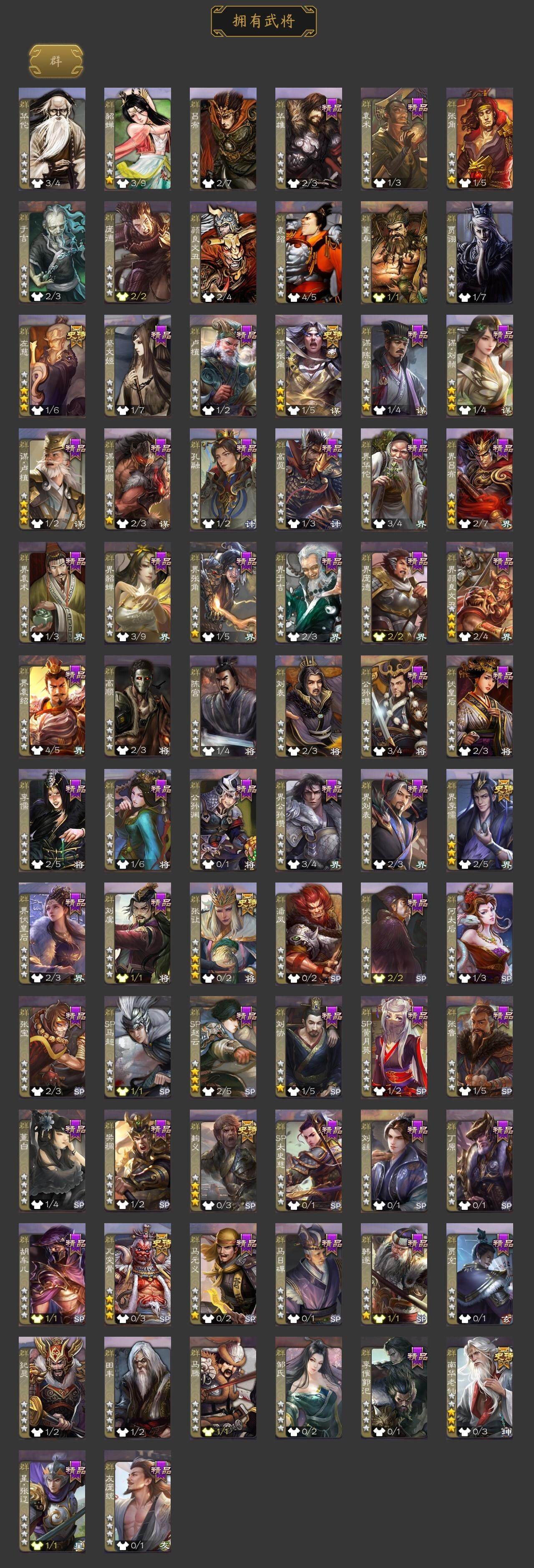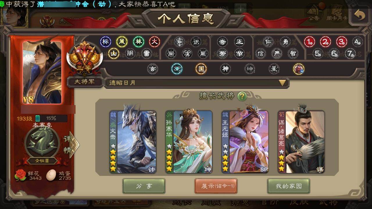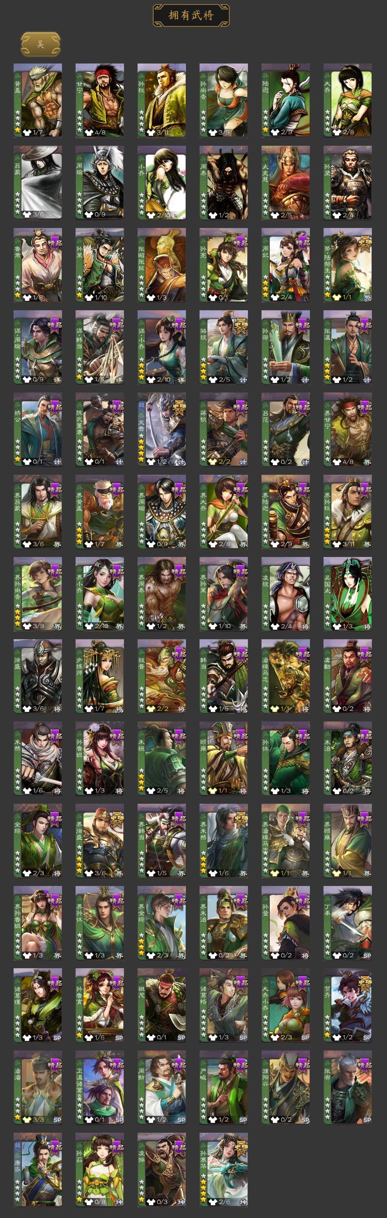 [15373331]【522】官阶:大将军;vip等级:vip8;史诗武将数量:34;动态皮肤数量:33;武将总数:333;史诗宝珠数量:13;将魂数量:1634;神将:6;魏国史诗武将:16;蜀国史诗武将:9;吴国史诗武将:6;群史诗武将:7 神赵云神陆逊神张辽神孙策神吕蒙神周瑜星周不疑杨修文鸯王元姬界钟会曹婴曹纯谋诸葛亮谋赵云谋马超诸葛瞻沙摩柯谯周界黄忠花鬘董允孙寒华骆统界朱然界徐盛贺齐势陆郁生谋黄月英左慈张让麹义南华老仙界李儒谋张角神陆逊-绽焰摧枯动态星周不疑-才广志宏动态曹丕-气荡山河(动态)甄姬-明珠耀躯(动态)sp蔡文姬-兔年冬日动态张春华-雪中舞刃动态曹婴-兔年春节动态王元姬-鼠年冬至动态星徐晃-斧引霹雳动态花鬘-依心缱绻动态刘备-龙御天下动态诸葛亮-龙年限定动态关羽-明良千古动态鲍三娘-虎年七夕动态卧龙诸葛-火烧博望动态周处-义除三害动态吕蒙-剑起惊澜动态孙权-永开吴祚动态孙权-牛年七夕动态孙尚香-兔年春节动态小乔-鼠年春分动态周妃-笼中箜响动态界孙权-牛年七夕动态界小乔-鼠年春分动态徐盛-破军杀将动态孙寒华-蛇年限定动态文鸯-势若万钧动态灵雎-霜刃绚练动态貂蝉-舞惑群心动态袁绍-声震寰宇动态吕布-鼠年七夕动态袁绍-一往无前动态界吕布-鼠年七夕动态界袁绍-一往无前动态张鲁-虎年冬至动态