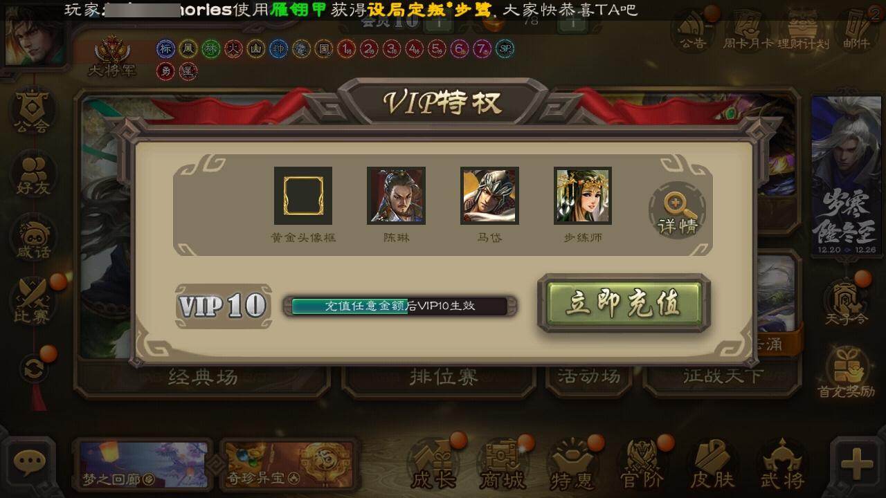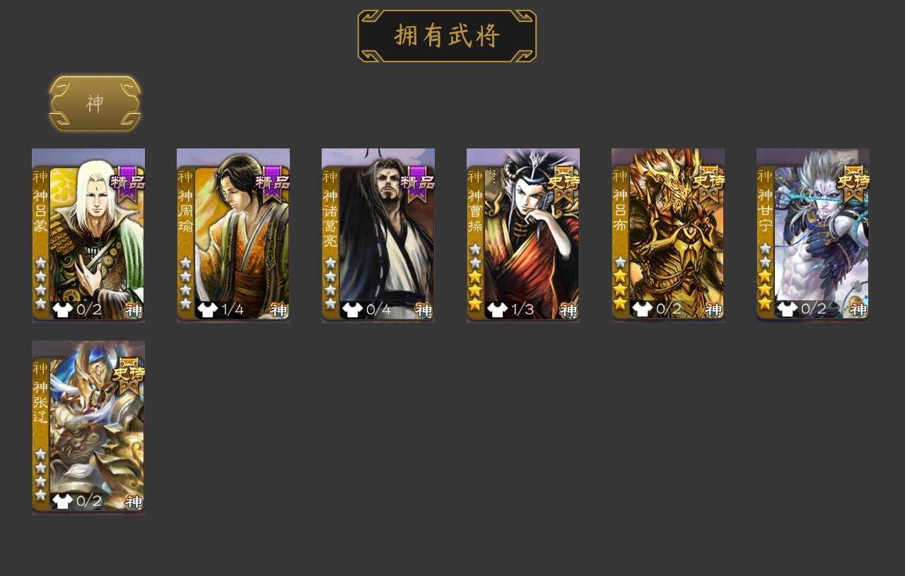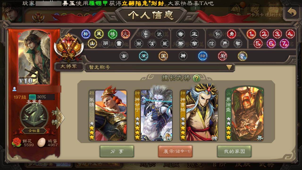 [15373347]【901】官阶:大将军;vip等级:vip10;史诗武将数量:38;动态皮肤数量:22;武将总数:368;史诗宝珠数量:3;将魂数量:1308;神将:7;魏国史诗武将:11;蜀国史诗武将:7;吴国史诗武将:5;群史诗武将:11 神曹操神吕布神甘宁神张辽神吕蒙神周瑜神诸葛亮sp司马昭星周不疑谋曹操杨修文鸯界钟会界于禁界曹真嵇康曹纯刘晔马云騄谋赵云谋马超诸葛瞻沙摩柯花鬘董允周处吴景骆统留赞界徐盛界沮授左慈张让苏飞麹义沮授界左慈界李儒张绣李傕许攸神刘备-龙兴海内神曹操-天下归心sp蔡文姬-兔年冬日动态许褚-兔年端午动态荀彧-驱虎吞狼动态邓艾-神兵天降动态张春华-雪中舞刃动态曹纯-虎年春节动态花鬘-依心缱绻动态刘备-龙御天下动态诸葛亮-龙年限定动态李丰-太仓聚粟动态诸葛果-蛇年限定动态孙权-永开吴祚动态周瑜-兔年七夕动态孙策-虎踞江东动态孙权-猪年端午动态界孙权-猪年端午动态徐盛-破军杀将动态刘赞-灵魂歌王动态袁绍-声震寰宇动态吕布-傲睨万物动态许攸-盛气凌人动态sp貂蝉-驭魂千机动态