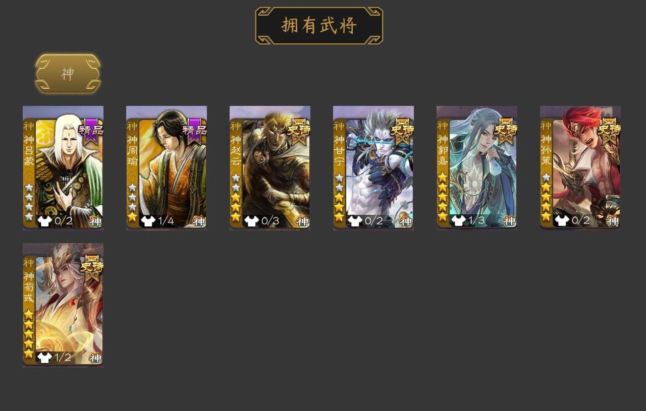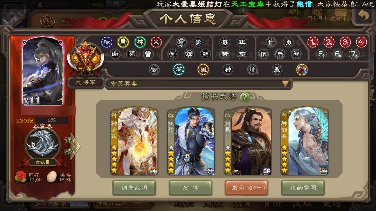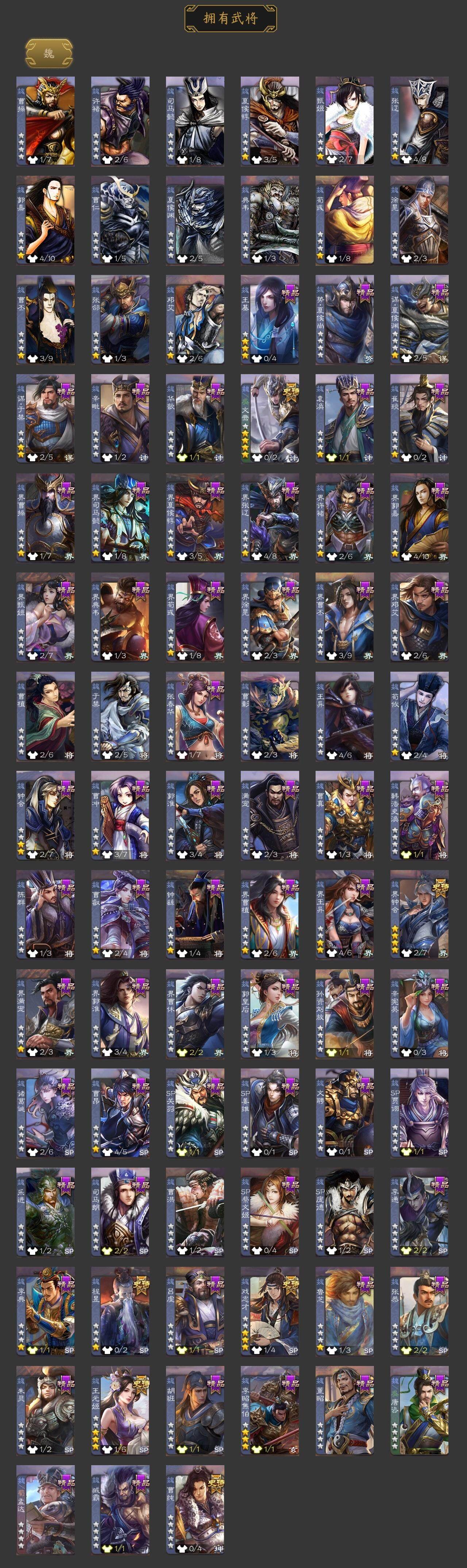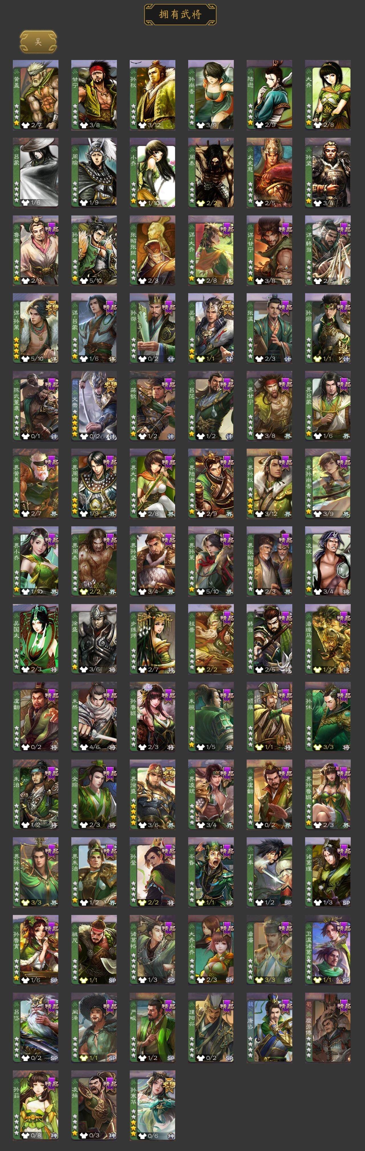 [15513312]【1113】官阶:大将军;vip等级:vip11;史诗武将数量:32;动态皮肤数量:21;武将总数:341;史诗宝珠数量:0;将魂数量:188;神将:5;魏国史诗武将:8;蜀国史诗武将:5;吴国史诗武将:6;群史诗武将:12 神赵云神甘宁神郭嘉神孙策神荀彧王元姬界钟会曹纯戏志才程昱谋刘备谋赵云沙摩柯花鬘董允谋孙策吴景孙寒华界徐盛文鸯十常侍谋貂蝉界沮授左慈苏飞麹义刘焉沮授界左慈界李儒杜预兀突骨神吕蒙神周瑜势夏侯尚sp关羽sp蔡文姬乐进曹昂诸葛诞朱灵文聘sp姜维张春华钟会曹冲郭淮满宠界王异界曹操界司马懿界夏侯惇界张辽界许褚界郭嘉李典曹真韩浩史涣陈群曹叡钟繇司马朗王基李通郭皇后孙资刘放辛宪英界甄姬吕虔鲁芝界典韦界荀彧界徐晃界曹丕界邓艾张恭界曹植界满宠界郭淮辛毗华歆袁涣崔琰谋于禁界曹休胡班李昭焦伯谋夏侯渊臧霸唐咨董昭势陈到sp孙尚香关银屏夏侯霸马良关兴张苞廖化界马岱关平简雍刘封界法正界关兴张苞界刘备界关羽界张飞界赵云界马超sp徐庶吴懿周仓张松刘谌夏侯氏糜竺马忠李严黄皓界黄月英界诸葛亮赵统赵广严颜界伊籍界庞统界孟获界姜维界刘禅吕凯张翼杨仪邓芝傅肜费祎糜夫人王甫赵累界周仓向宠刘巴彭羕谋庞统界张嶷谋姜维谋张飞诸葛果蒋琬费祎糜芳傅士仁甘夫人鲁肃孙茹凌操大乔小乔诸葛恪诸葛瑾孙鲁育程普韩当潘璋马忠虞翻朱然界周泰界甘宁界吕蒙界黄盖界周瑜界大乔界陆逊孙鲁班朱桓顾雍孙休朱治全琮阚泽孙登岑昏界孙权界孙尚香潘濬严畯界孙坚吕岱界孙策界张昭张纮卫温诸葛直界凌统界虞翻孙邵张温陈武董袭孙翊蒋钦吕范界孙鲁班濮阳兴谋韩当谋吕蒙谋甘宁谋大乔界孙休界朱治界小乔孟达友庞统伏完刘协界袁术sp赵云张宝伏皇后李儒界于吉界张角华雄袁术界华佗界吕布公孙瓒蔡夫人公孙渊郭图逢纪张鲁蹋顿严白虎刘虞蔡邕界貂蝉sp太史慈卢植刘琦界庞德界颜良文丑界袁绍张济樊稠刘繇界刘表
