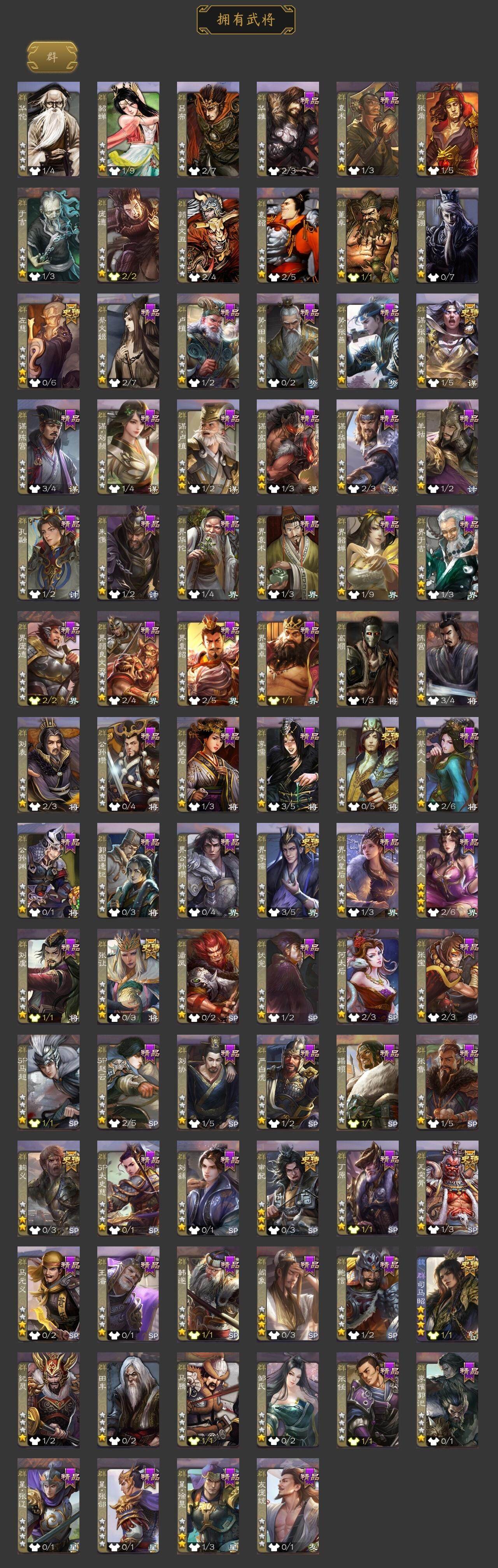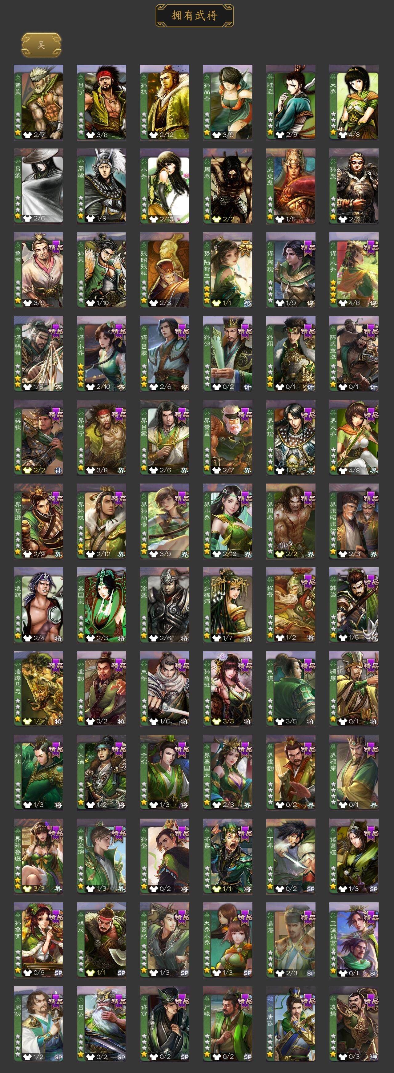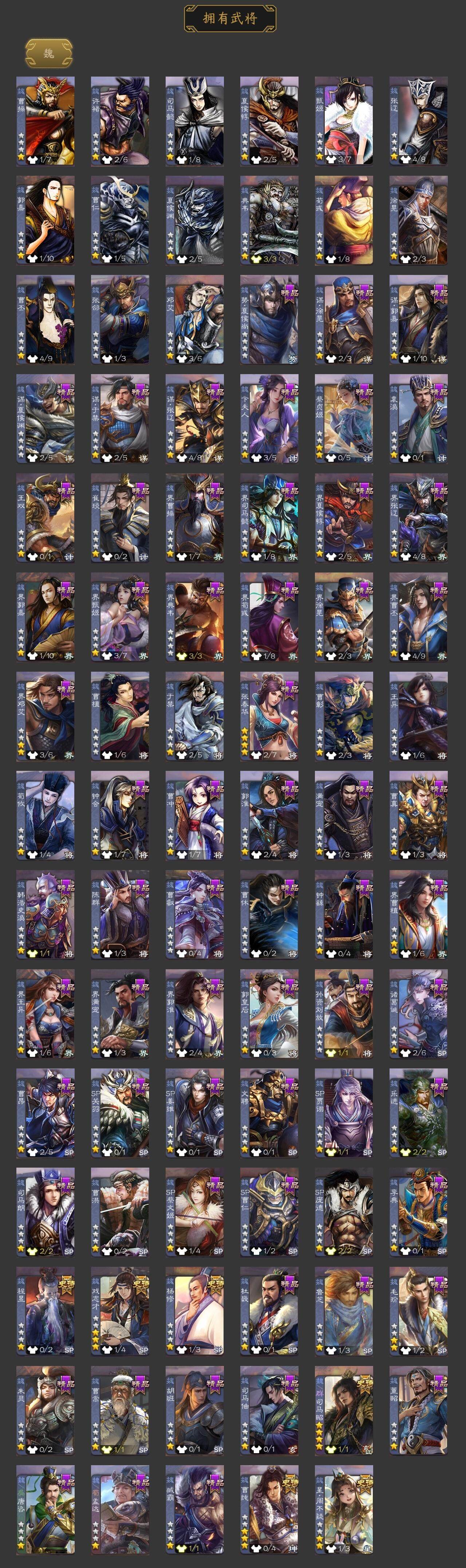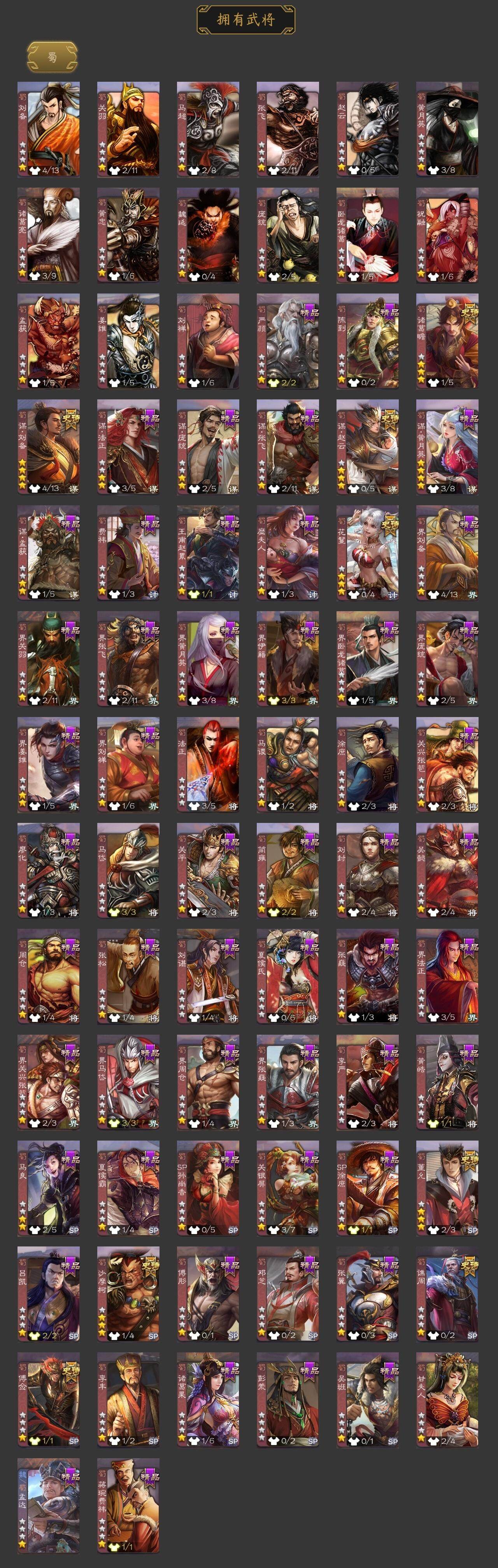 [15513440]【1116】官阶:骠骑将军;vip等级:vip9;史诗武将数量:25;动态皮肤数量:25;武将总数:328;史诗宝珠数量:0;将魂数量:1347;神将:3;魏国史诗武将:14;蜀国史诗武将:8;吴国史诗武将:1;群史诗武将:10 神赵云神张辽神诸葛亮星周不疑杨修曹纯戏志才程昱谋刘备谋赵云诸葛瞻沙摩柯谯周傅佥花鬘董允势陆郁生左慈张让审配麹义沮授界李儒谋张角兀突骨司马昭神吕蒙神周瑜势夏侯尚sp关羽sp曹仁sp蔡文姬乐进曹昂诸葛诞朱灵文聘sp姜维张春华钟会曹冲郭淮满宠界王异界曹操界司马懿界夏侯惇界张辽界郭嘉李典曹真韩浩史涣陈群曹叡曹休钟繇司马朗郭皇后孙资刘放界甄姬鲁芝界典韦界荀彧界徐晃杜畿界曹丕界邓艾界曹植界满宠界郭淮卞夫人蔡贞姬袁涣王双崔琰毛玠曹嵩谋徐晃谋于禁胡班司马伷谋张辽谋郭嘉谋夏侯渊臧霸唐咨董昭sp孙尚香关银屏夏侯霸马良关兴张苞廖化界马岱关平简雍刘封界法正界关兴张苞界刘备界关羽界张飞sp徐庶吴懿周仓张松刘谌夏侯氏李严黄皓界黄月英严颜界伊籍界卧龙诸葛界庞统陈到界姜维界刘禅吕凯张翼邓芝傅肜费祎糜夫人王甫赵累界周仓彭羕谋法正谋庞统谋黄月英界张嶷谋孟获谋张飞吴班诸葛果蒋琬费祎甘夫人鲁肃凌操大乔小乔诸葛恪诸葛瑾孙鲁育程普韩当潘璋马忠虞翻朱然界周泰界甘宁界吕蒙界黄盖界周瑜界大乔界陆逊孙鲁班朱桓顾雍孙休朱治全琮孙登岑昏界孙权界孙尚香潘濬严畯吕岱周鲂界张昭张纮许贡卫温诸葛直界吴国太界虞翻孙邵陈武董袭孙翊蒋钦界顾雍界孙鲁班谋韩当谋吕蒙谋周瑜谋大乔界全琮谋小乔界小乔孟达友庞统蔡文姬伏完刘协界袁术sp赵云张宝伏皇后李儒界于吉华雄袁术界华佗公孙瓒蔡夫人公孙渊郭图逢纪张鲁蹋顿严白虎刘虞界貂蝉sp太史慈卢植界庞德界颜良文丑界袁绍界董卓刘繇星张辽星徐晃星张郃界公孙瓒丁原韩遂界伏皇后孔融羊祜马元义朱儁界蔡夫人谋刘赪王濬谋陈宫谋卢植谋华雄