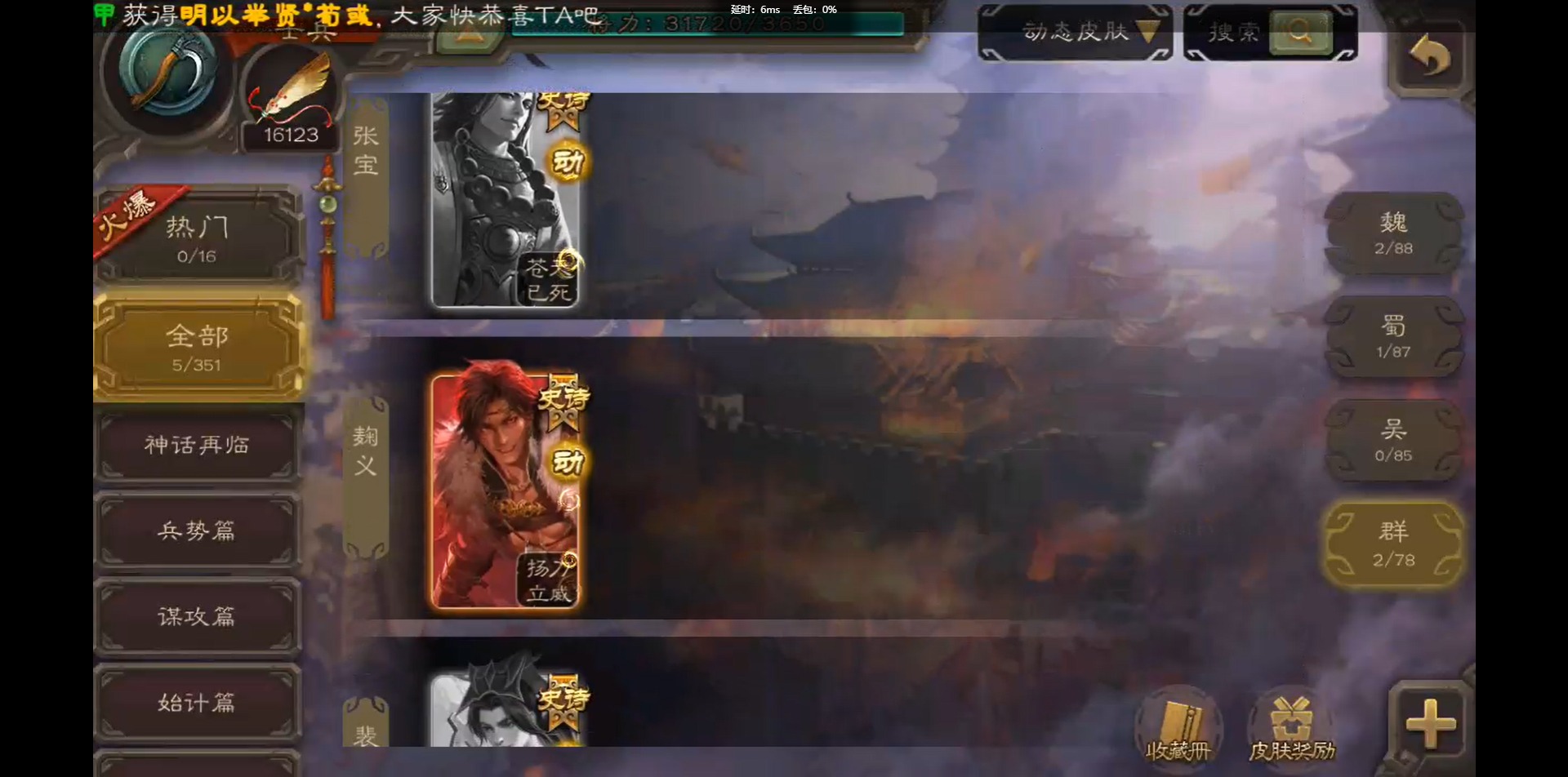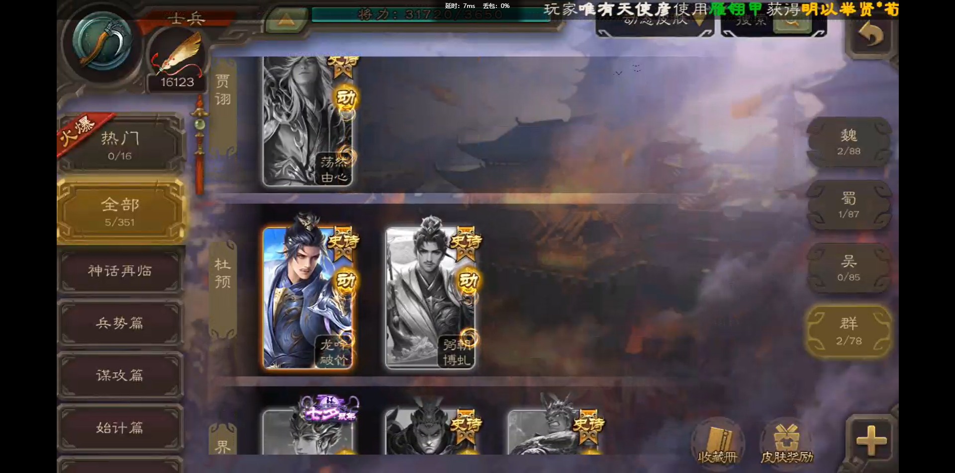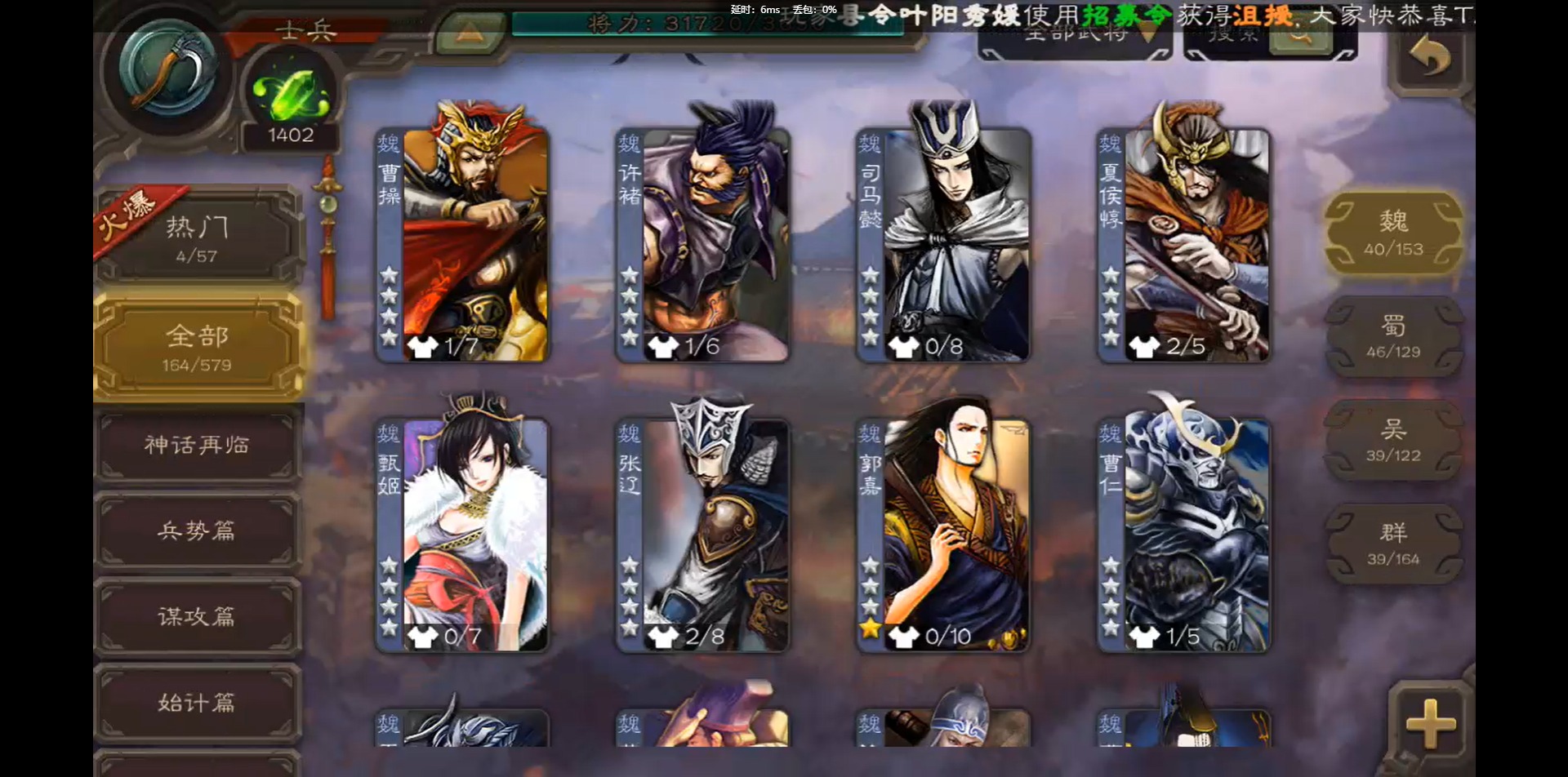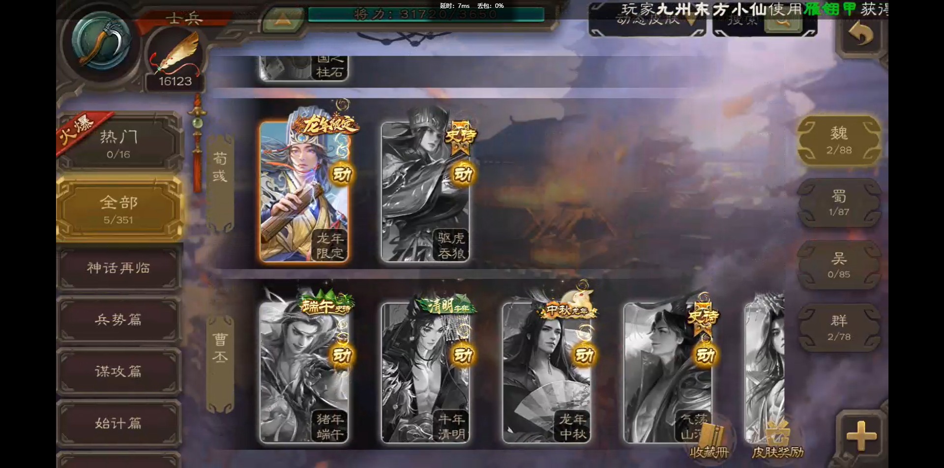 [16295492]vip5 士兵 164武将 5动态皮肤 6史诗武将 【神将】:神吕布 【魏国武将】:甄姬司马懿许褚夏侯惇郭嘉曹仁曹操张辽 【蜀国武将】:沙摩柯 【吴国武将】:界徐盛 【群国武将】:裴秀麹义杜预