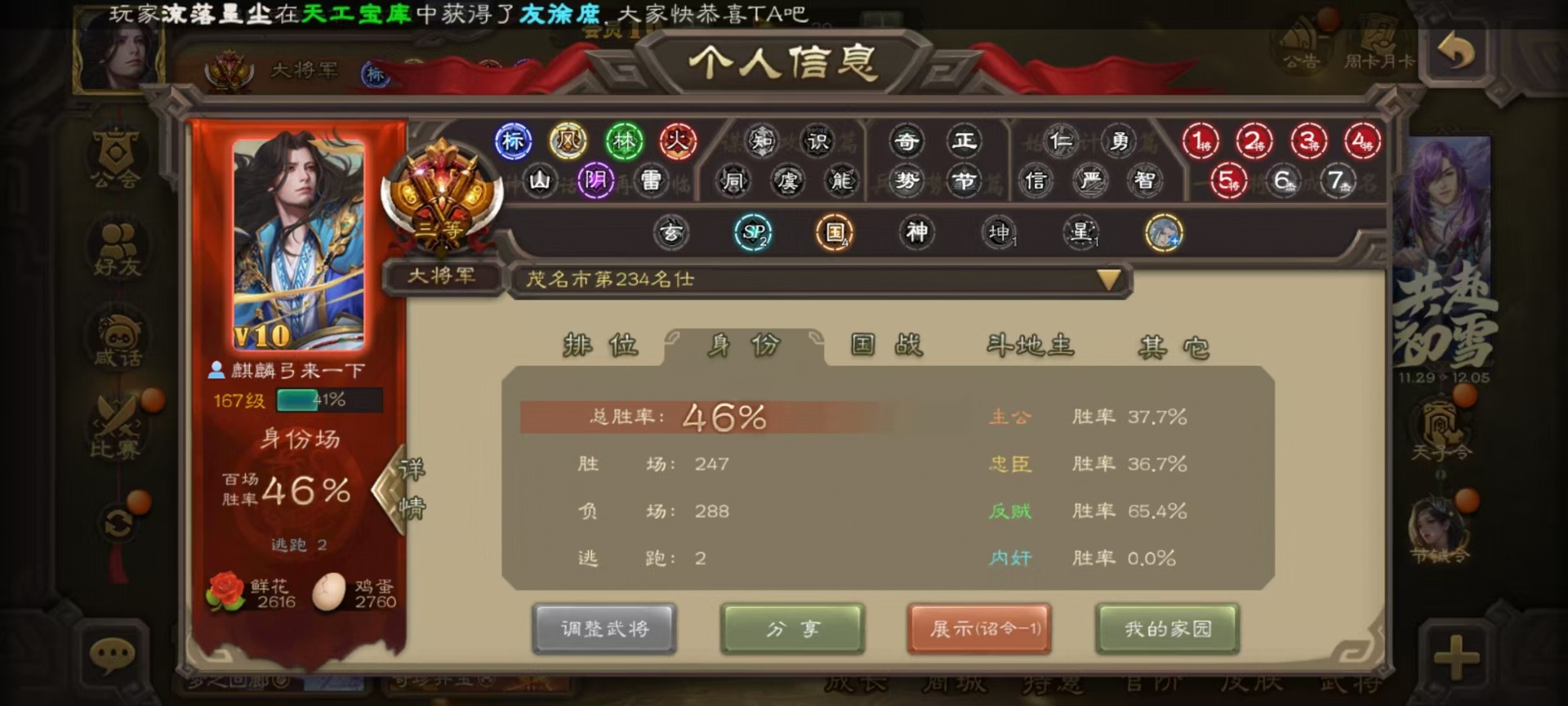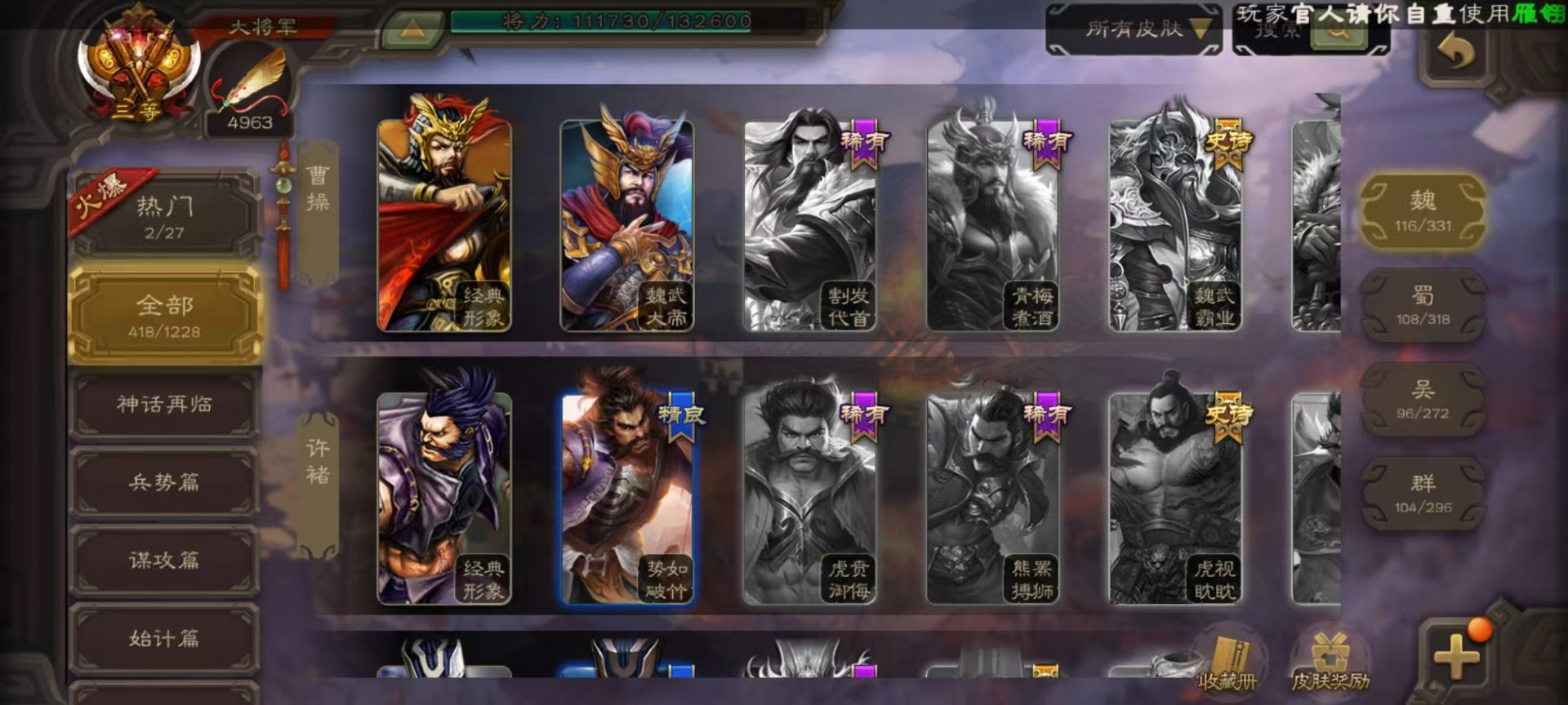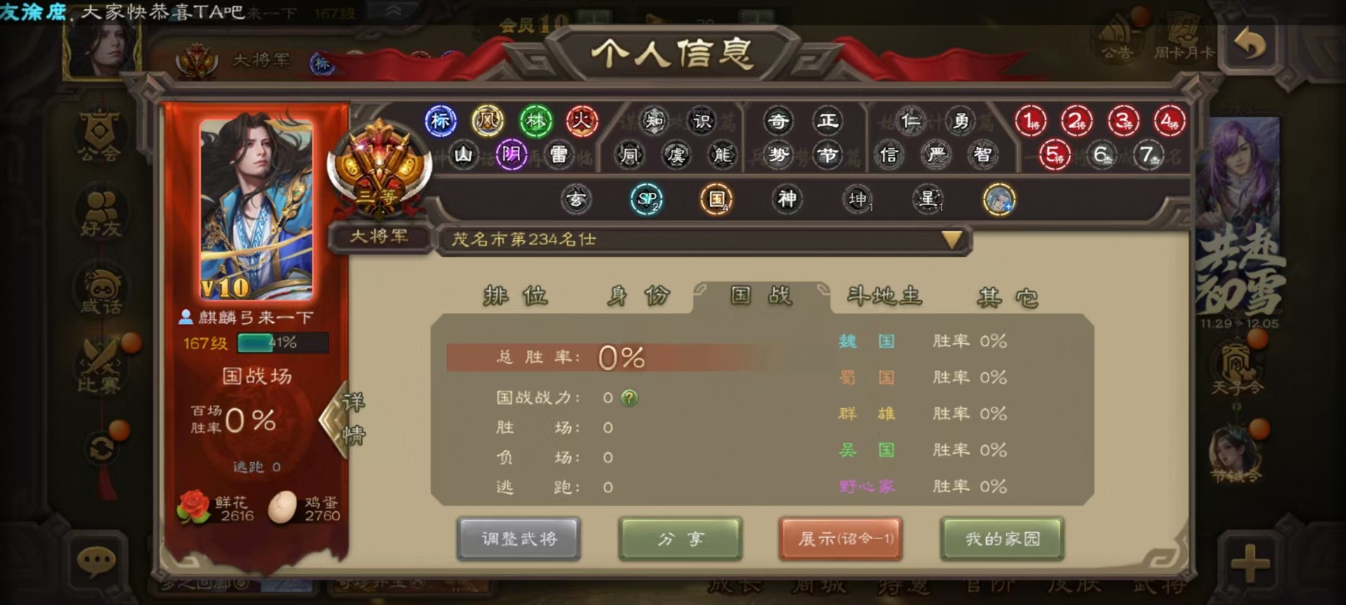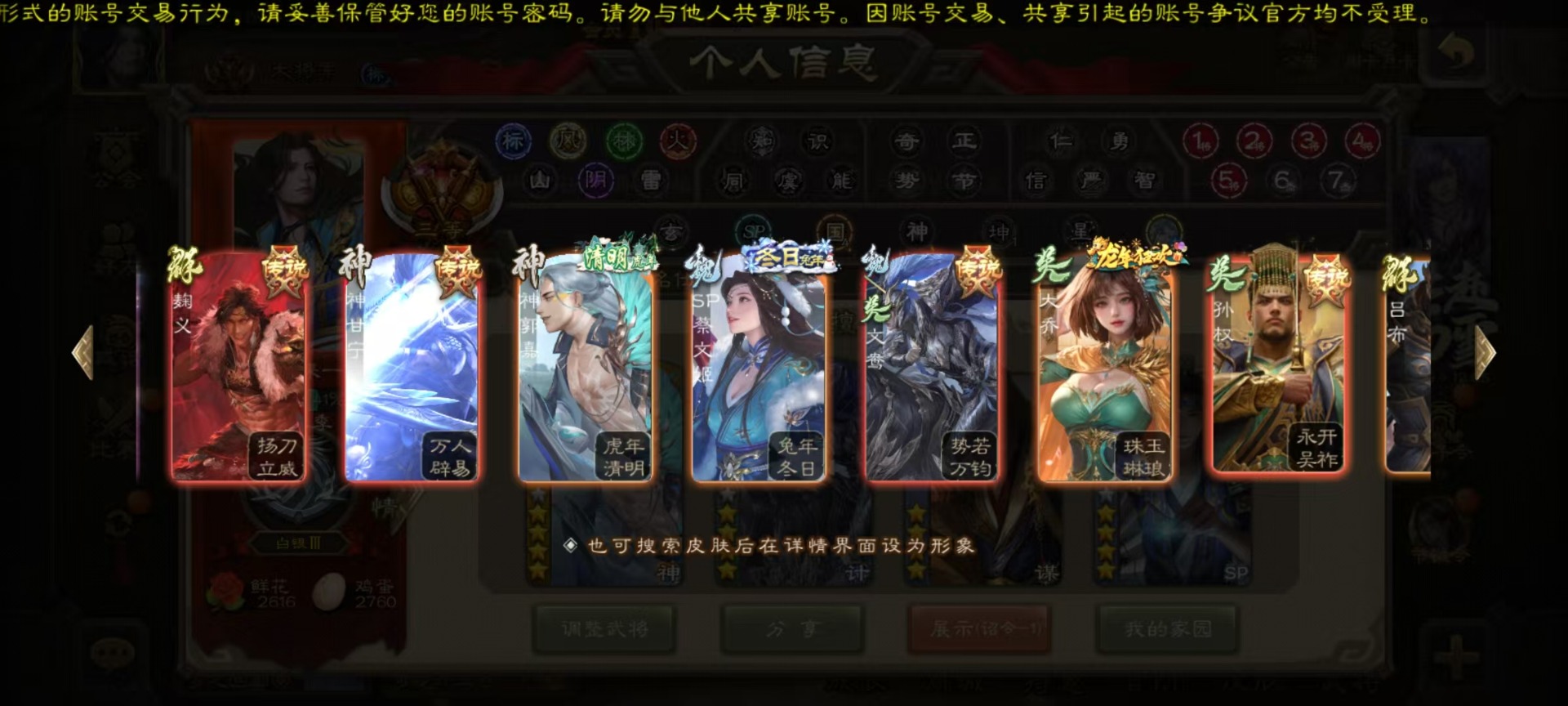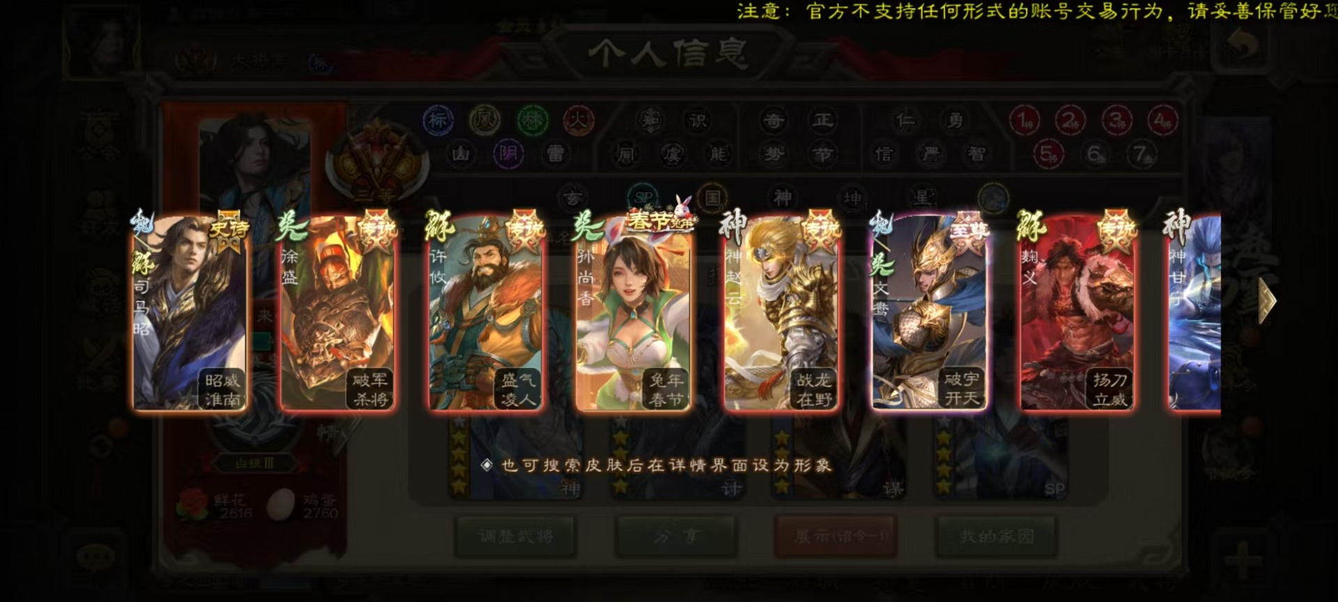[16295556]vip10 大将军 365武将 40动态皮肤 34史诗武将 3宝珠 【神将】:神赵云神张辽神郭嘉 【魏国武将】:星周不疑杨修文鸯魏-司马昭程昱曹纯戏志才甄姬司马懿许褚夏侯惇郭嘉曹仁曹操张辽 【蜀国武将】:蜀-谋孙尚香谋赵云诸葛瞻张星彩王平沙摩柯界黄忠花鬘 【吴国武将】:谋陆逊谋黄盖文鸯吴-谋孙尚香周处骆统界徐盛 【群国武将】:星董卓群-司马昭左慈兀突骨苏飞麹义南华老仙沮授界左慈界李儒许攸