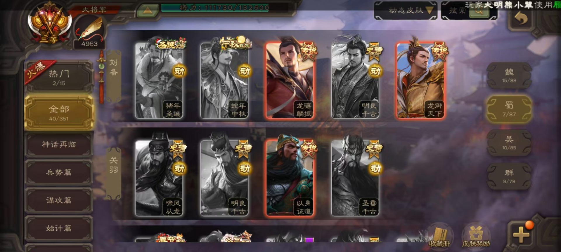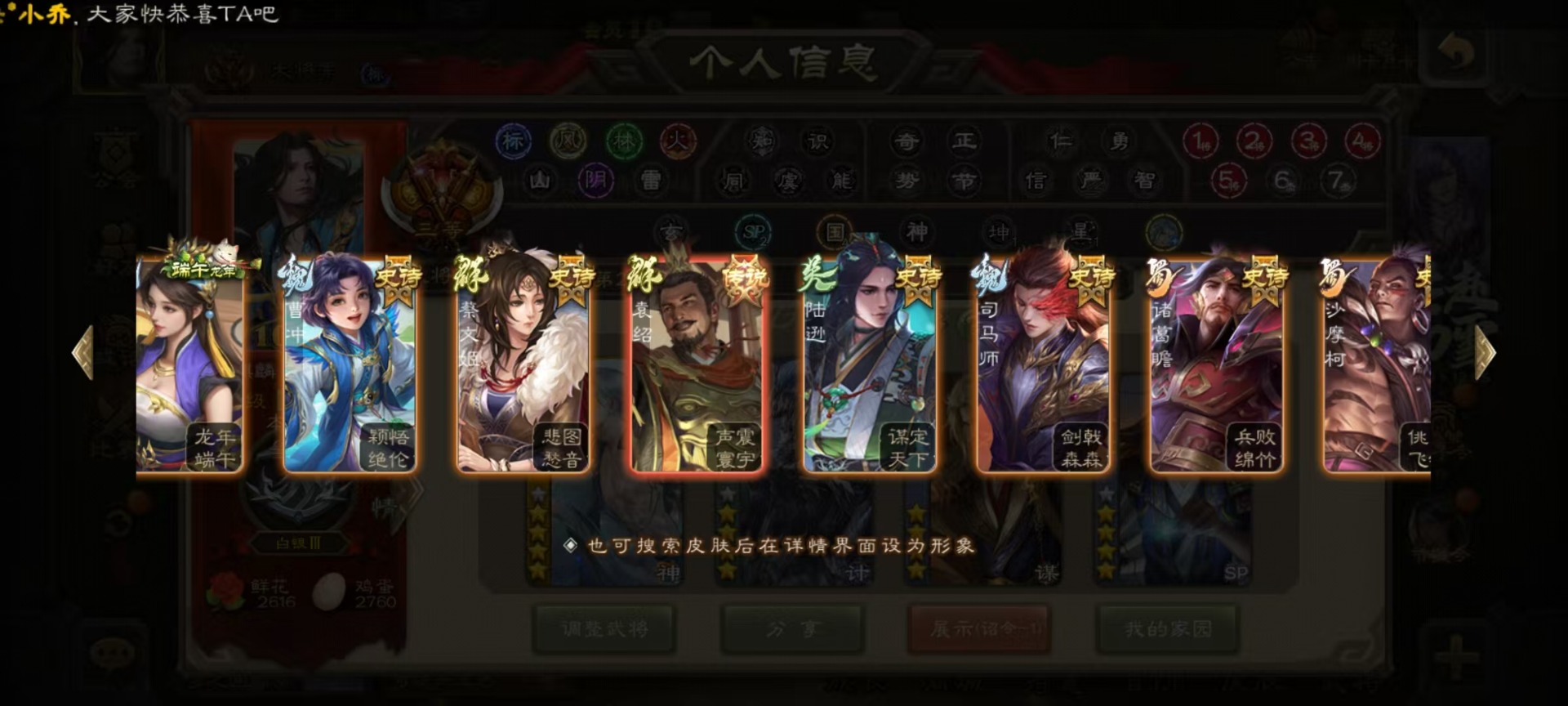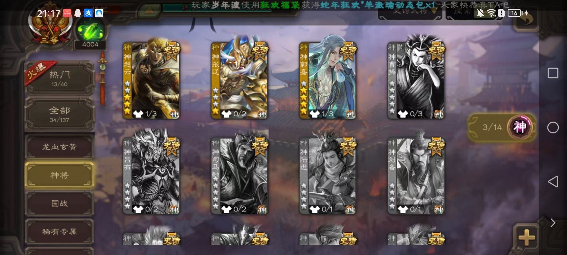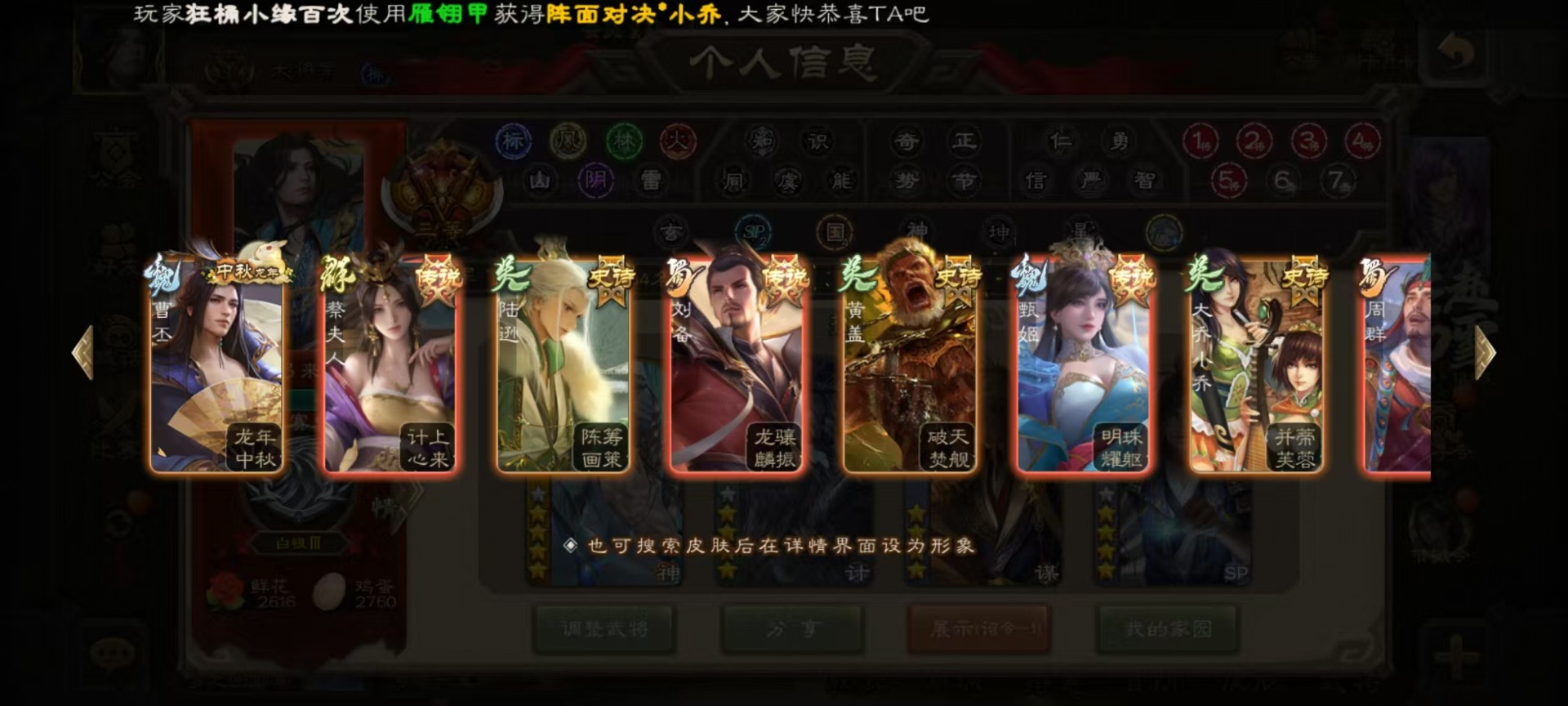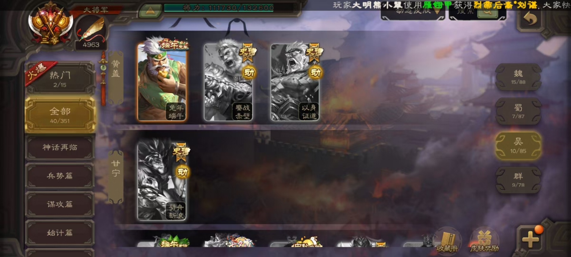 [16295556]vip10 大将军 365武将 40动态皮肤 34史诗武将 3宝珠 【神将】:神赵云神张辽神郭嘉 【魏国武将】:星周不疑杨修文鸯魏-司马昭程昱曹纯戏志才甄姬司马懿许褚夏侯惇郭嘉曹仁曹操张辽 【蜀国武将】:蜀-谋孙尚香谋赵云诸葛瞻张星彩王平沙摩柯界黄忠花鬘 【吴国武将】:谋陆逊谋黄盖文鸯吴-谋孙尚香周处骆统界徐盛 【群国武将】:星董卓群-司马昭左慈兀突骨苏飞麹义南华老仙沮授界左慈界李儒许攸