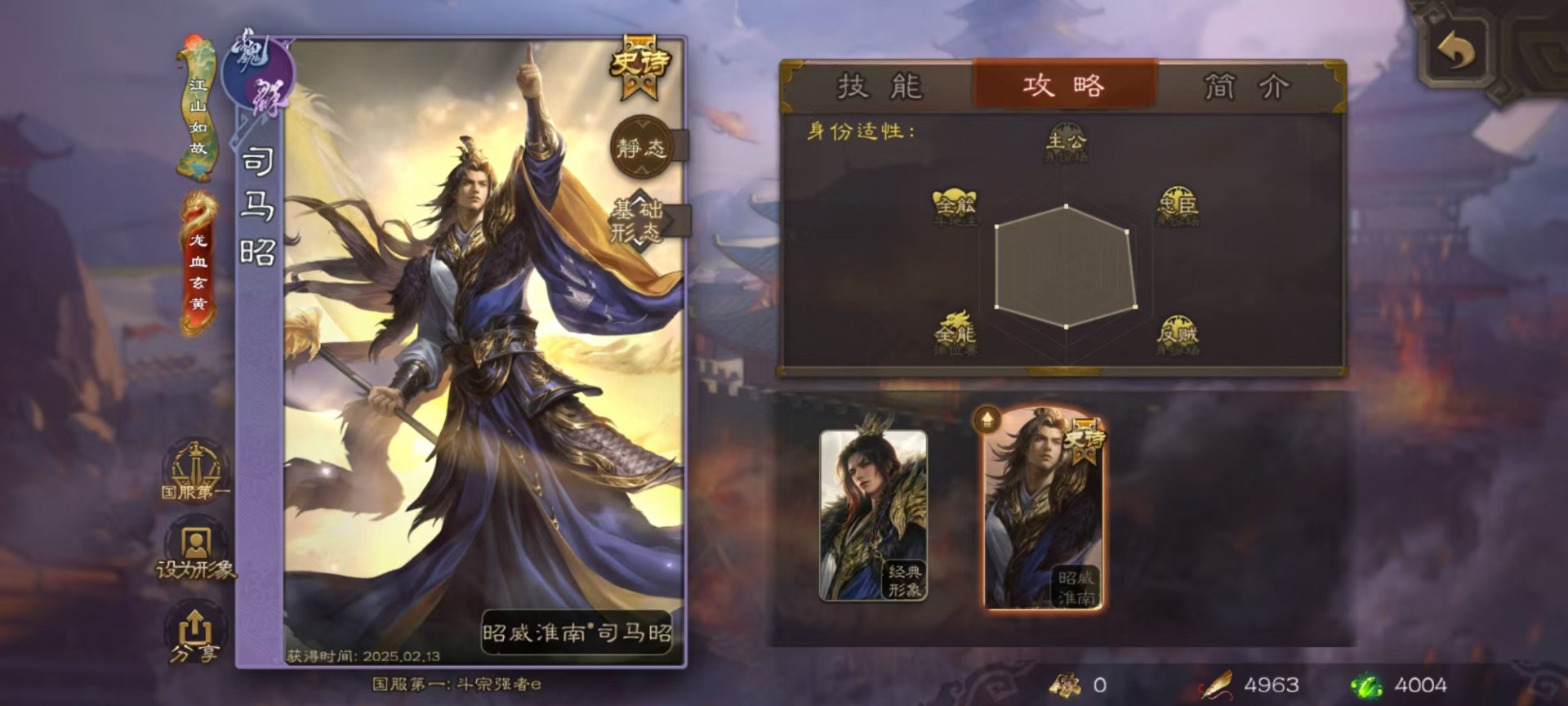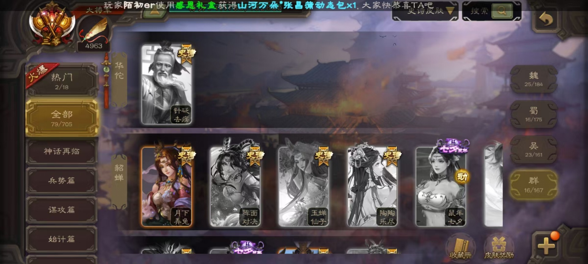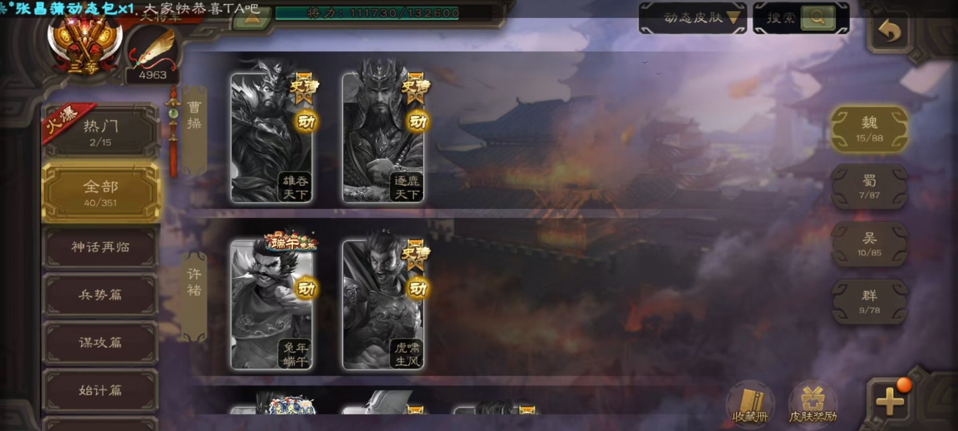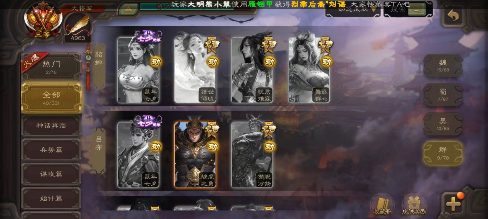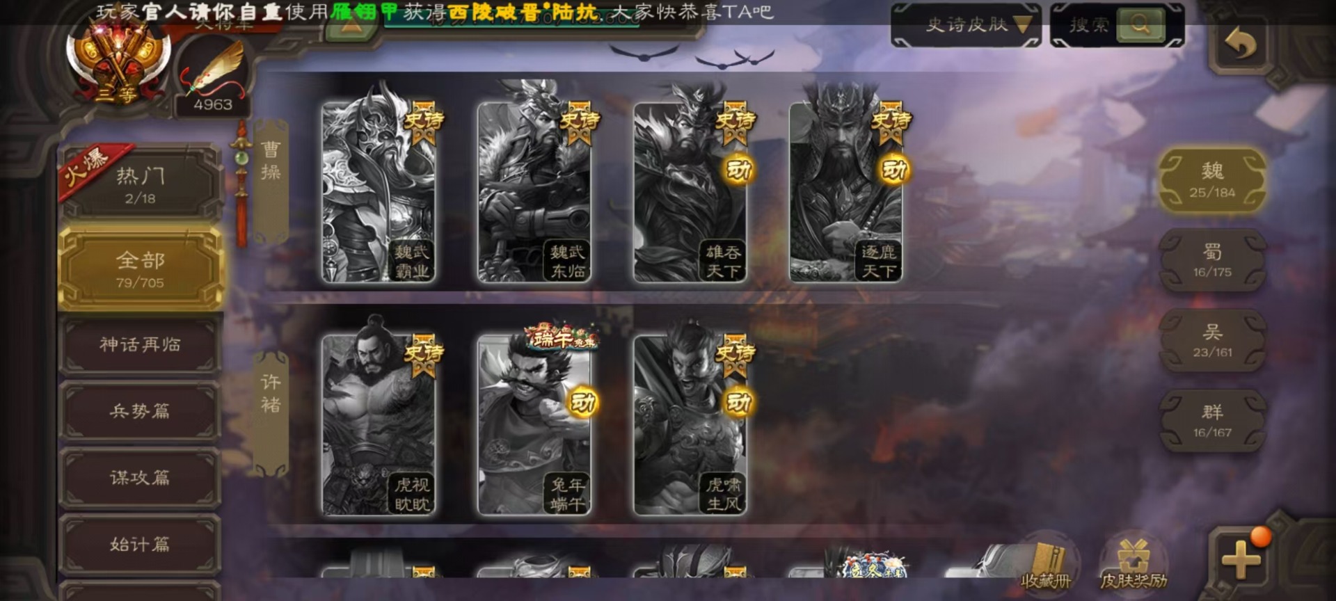 [16295556]vip10 大将军 365武将 40动态皮肤 34史诗武将 3宝珠 【神将】:神赵云神张辽神郭嘉 【魏国武将】:星周不疑杨修文鸯魏-司马昭程昱曹纯戏志才甄姬司马懿许褚夏侯惇郭嘉曹仁曹操张辽 【蜀国武将】:蜀-谋孙尚香谋赵云诸葛瞻张星彩王平沙摩柯界黄忠花鬘 【吴国武将】:谋陆逊谋黄盖文鸯吴-谋孙尚香周处骆统界徐盛 【群国武将】:星董卓群-司马昭左慈兀突骨苏飞麹义南华老仙沮授界左慈界李儒许攸