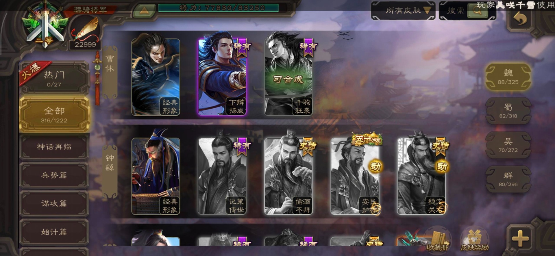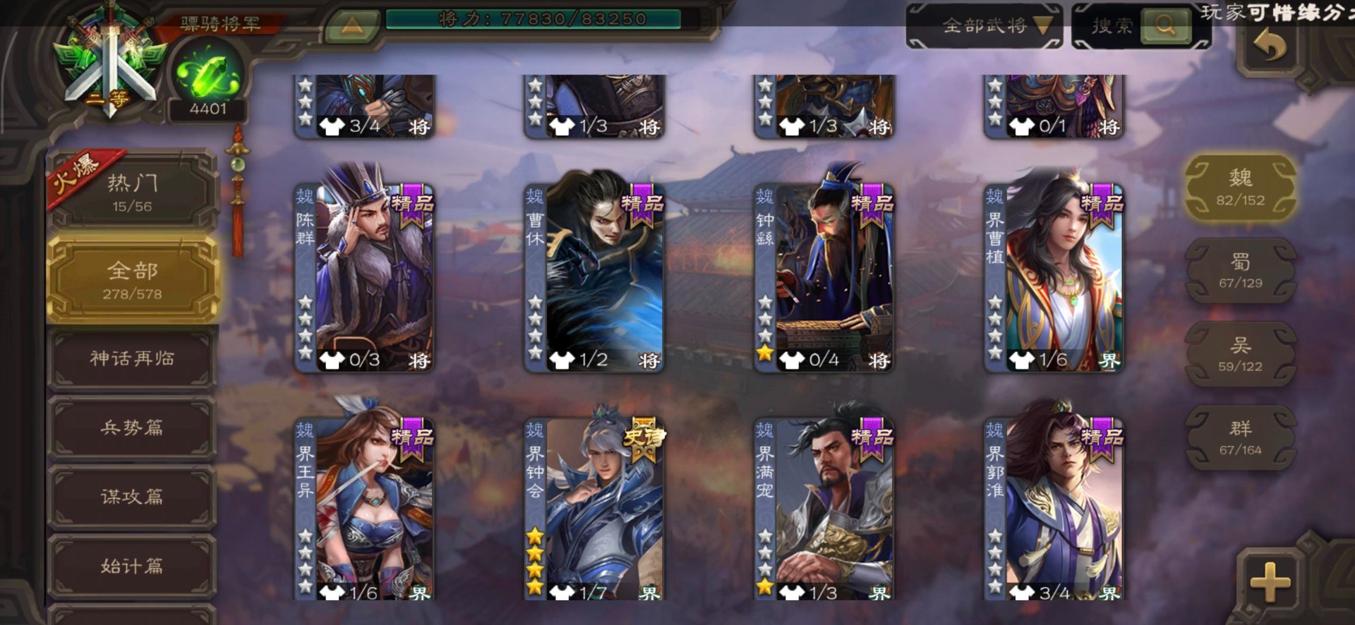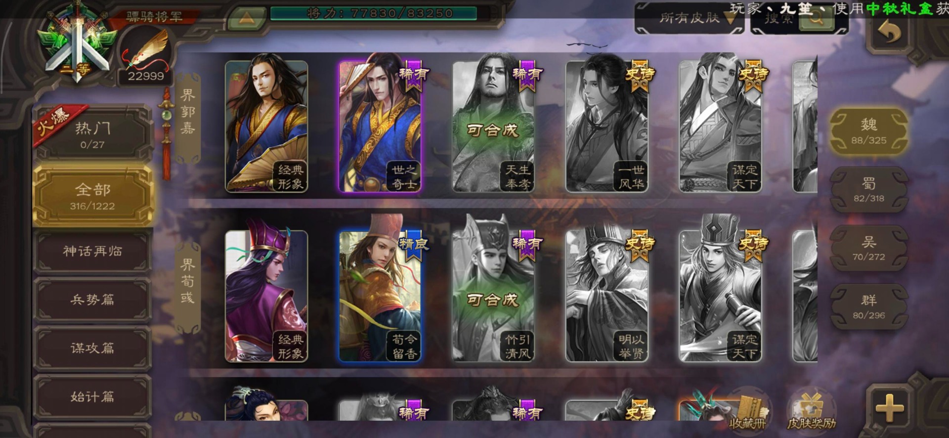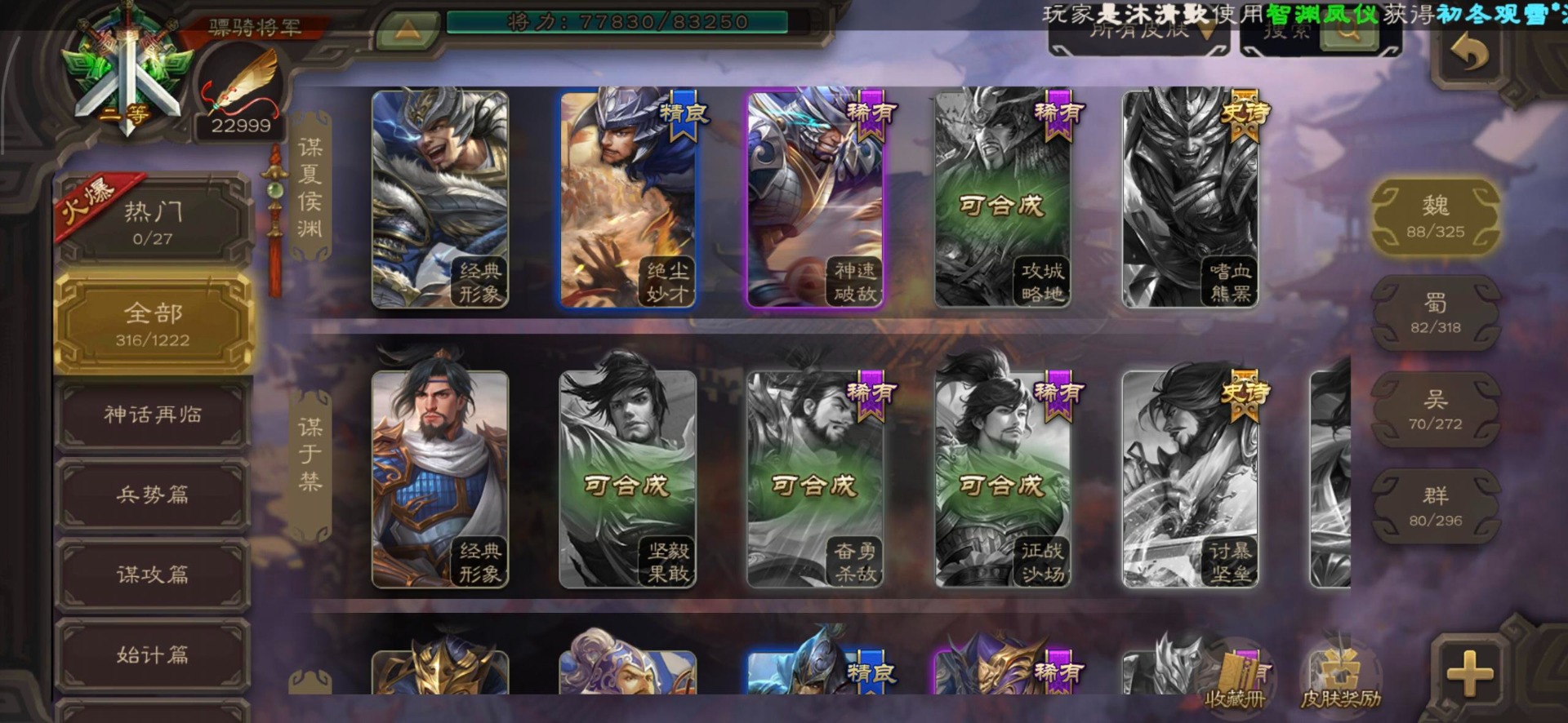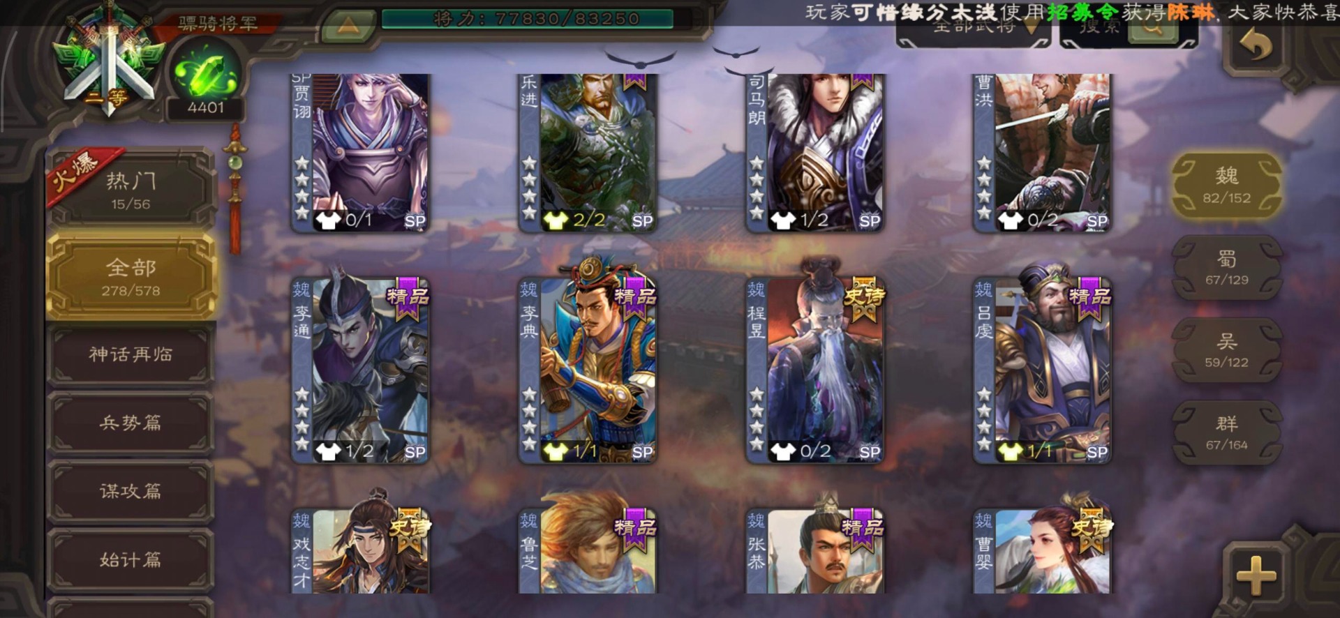 [16295575]vip8 骠骑将军 278武将 20动态皮肤 30史诗武将 【魏国武将】:星周不疑界钟会郝昭程昱曹婴曹纯戏志才于禁界夏侯惇曹彰界张辽曹植李通界许褚吕虔界荀彧界郭嘉张恭王异sp贾诩
