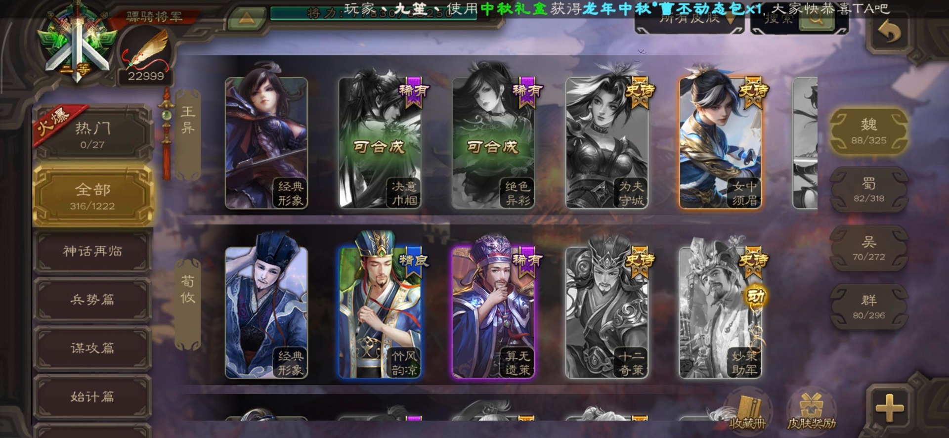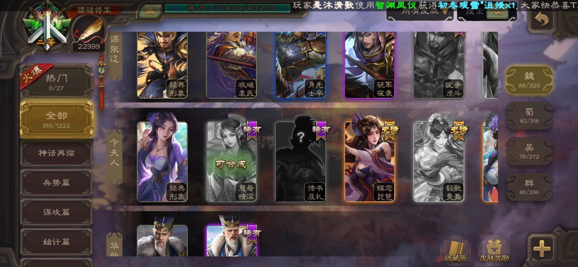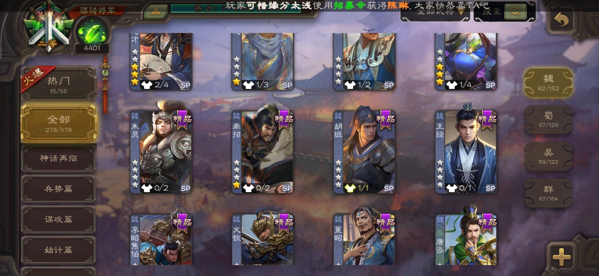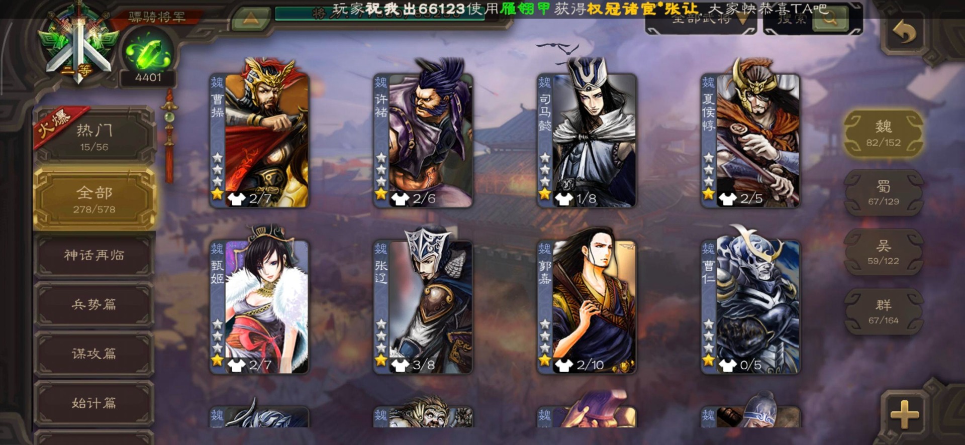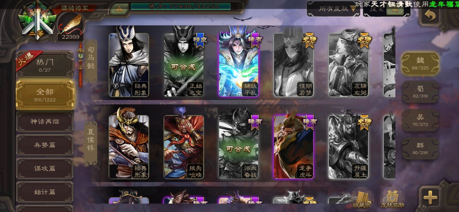 [16295575]vip8 骠骑将军 278武将 20动态皮肤 30史诗武将 【魏国武将】:星周不疑界钟会郝昭程昱曹婴曹纯戏志才于禁界夏侯惇曹彰界张辽曹植李通界许褚吕虔界荀彧界郭嘉张恭王异sp贾诩