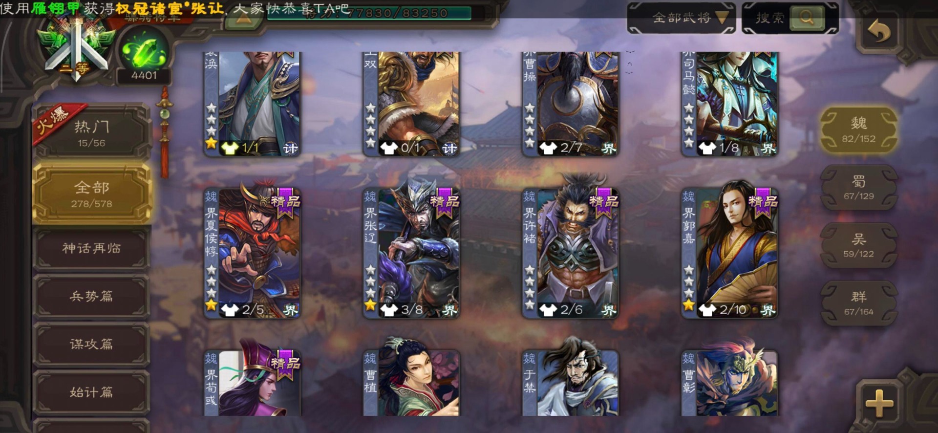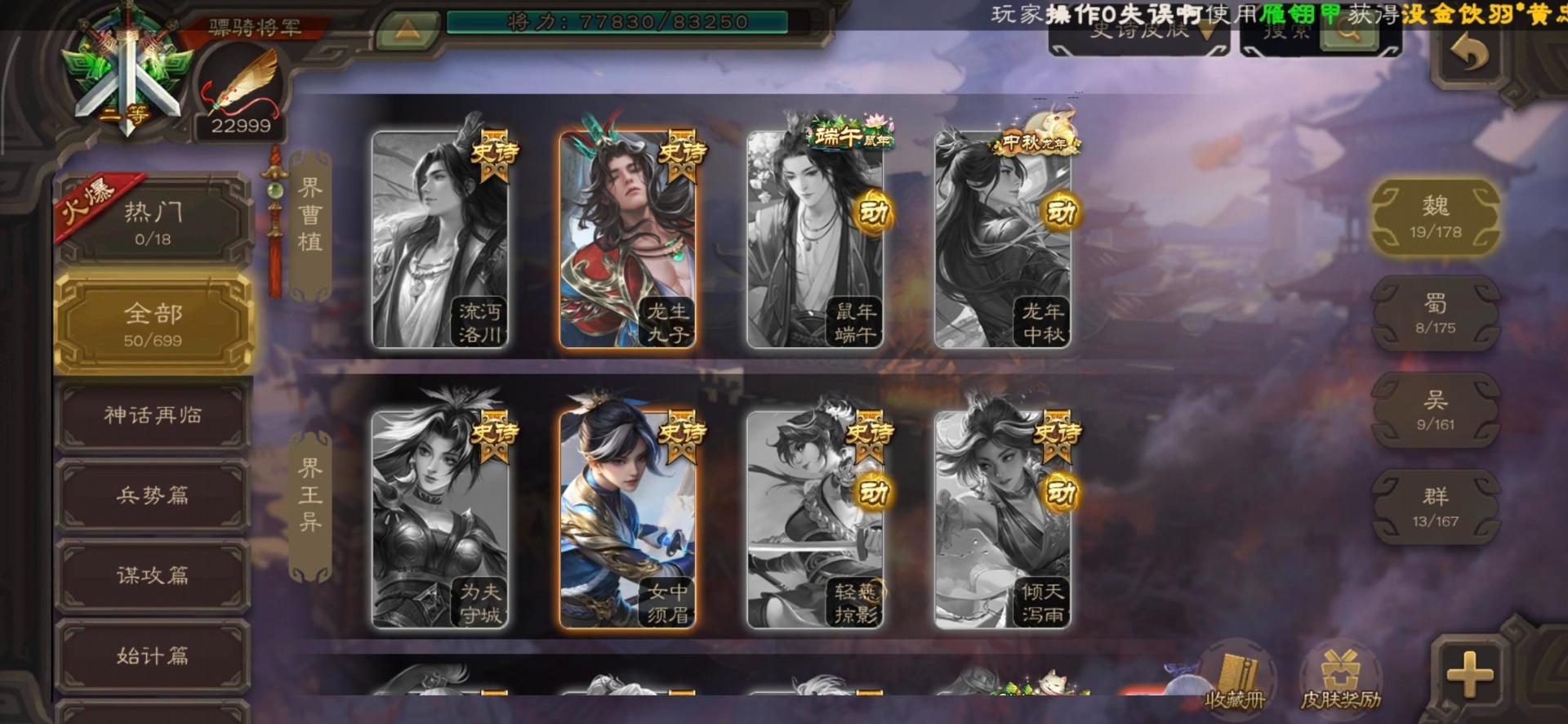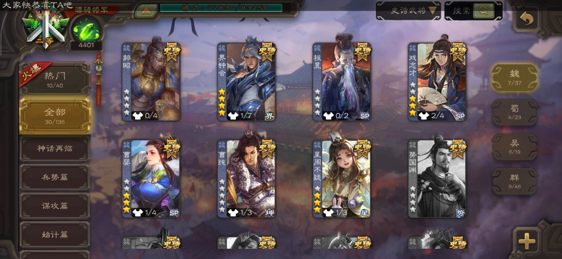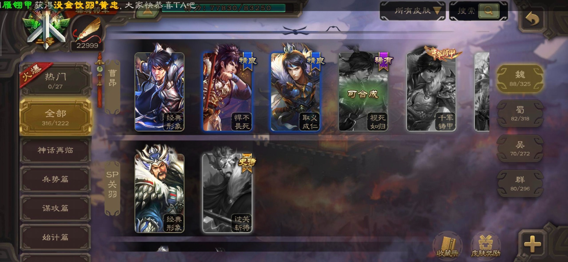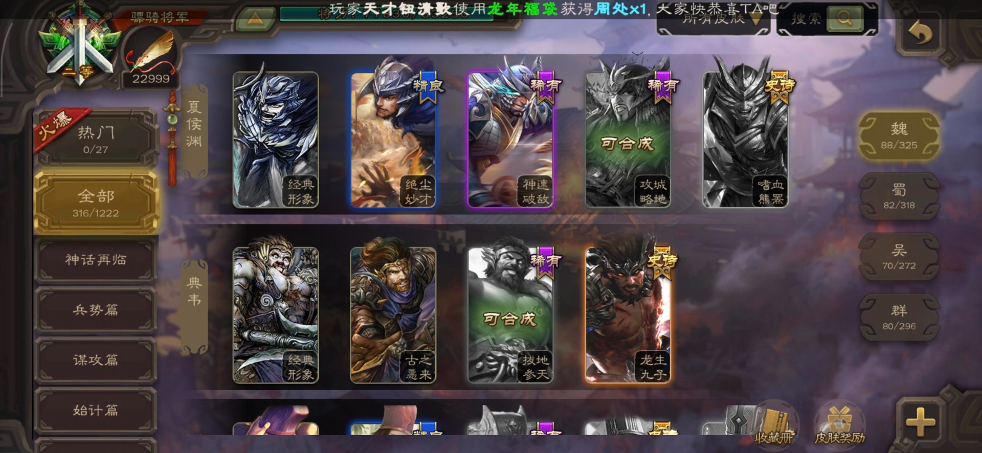 [16295575]vip8 骠骑将军 278武将 20动态皮肤 30史诗武将 【魏国武将】:星周不疑界钟会郝昭程昱曹婴曹纯戏志才于禁界夏侯惇曹彰界张辽曹植李通界许褚吕虔界荀彧界郭嘉张恭王异sp贾诩