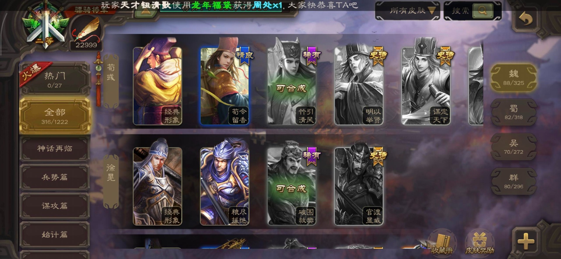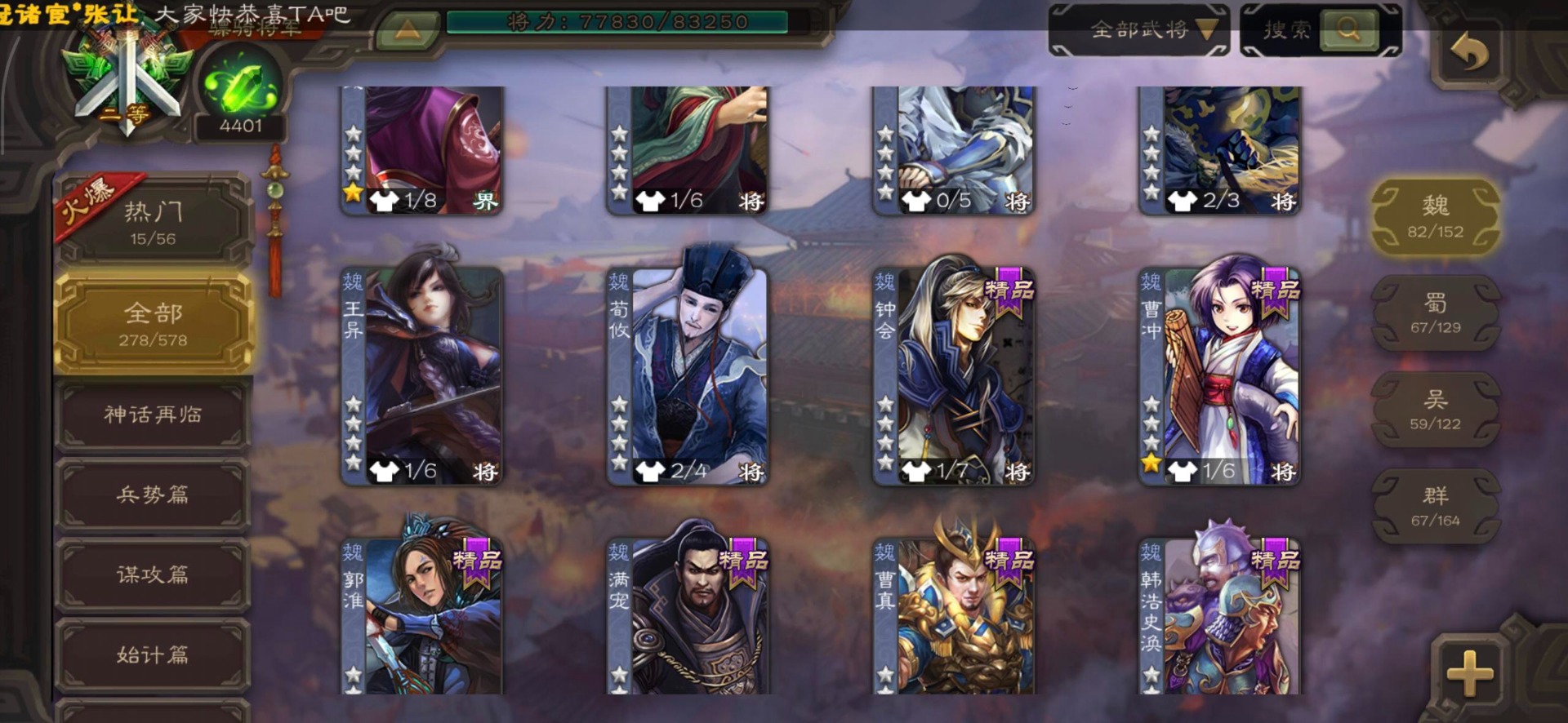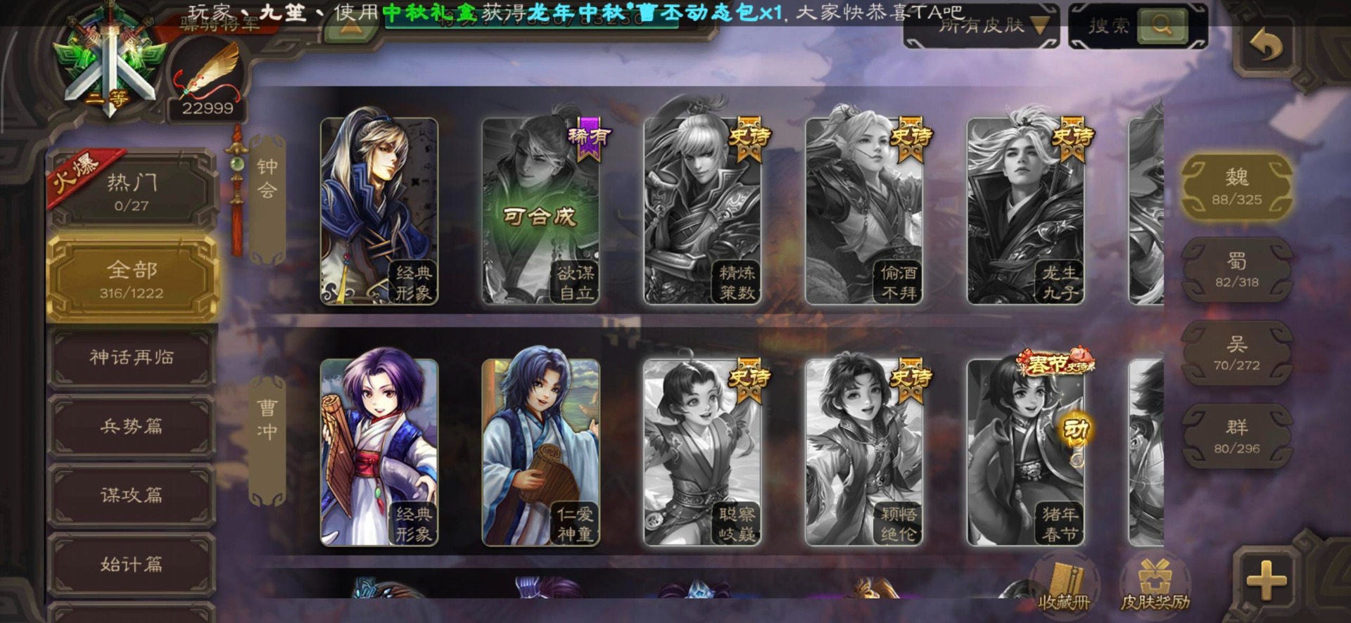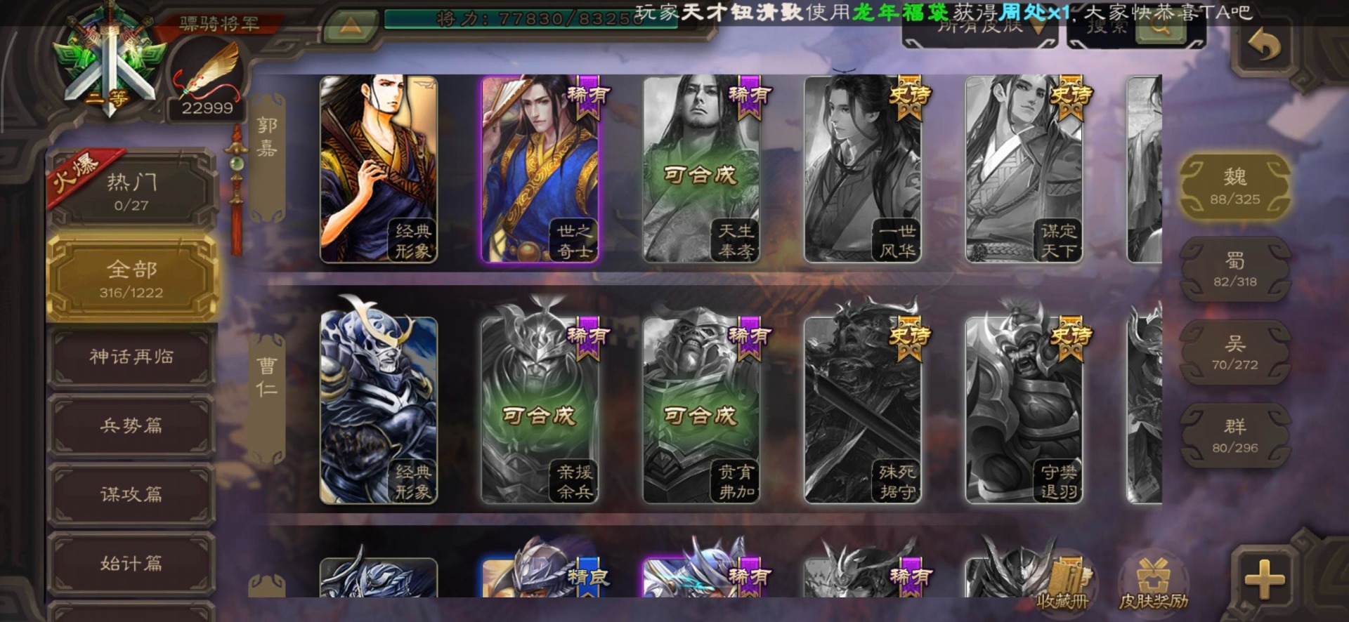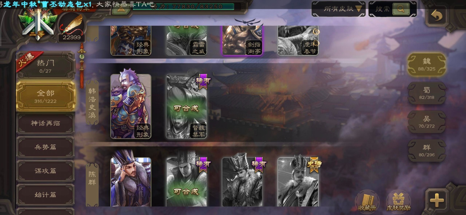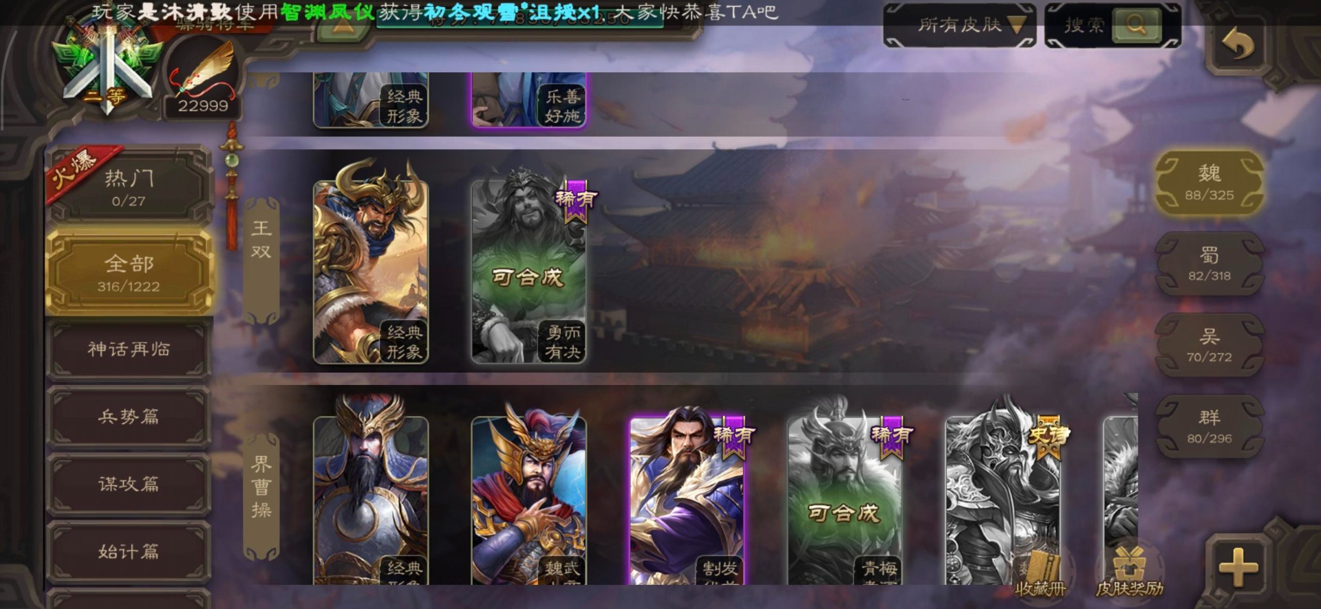 [16295575]vip8 骠骑将军 278武将 20动态皮肤 30史诗武将 【魏国武将】:星周不疑界钟会郝昭程昱曹婴曹纯戏志才于禁界夏侯惇曹彰界张辽曹植李通界许褚吕虔界荀彧界郭嘉张恭王异sp贾诩