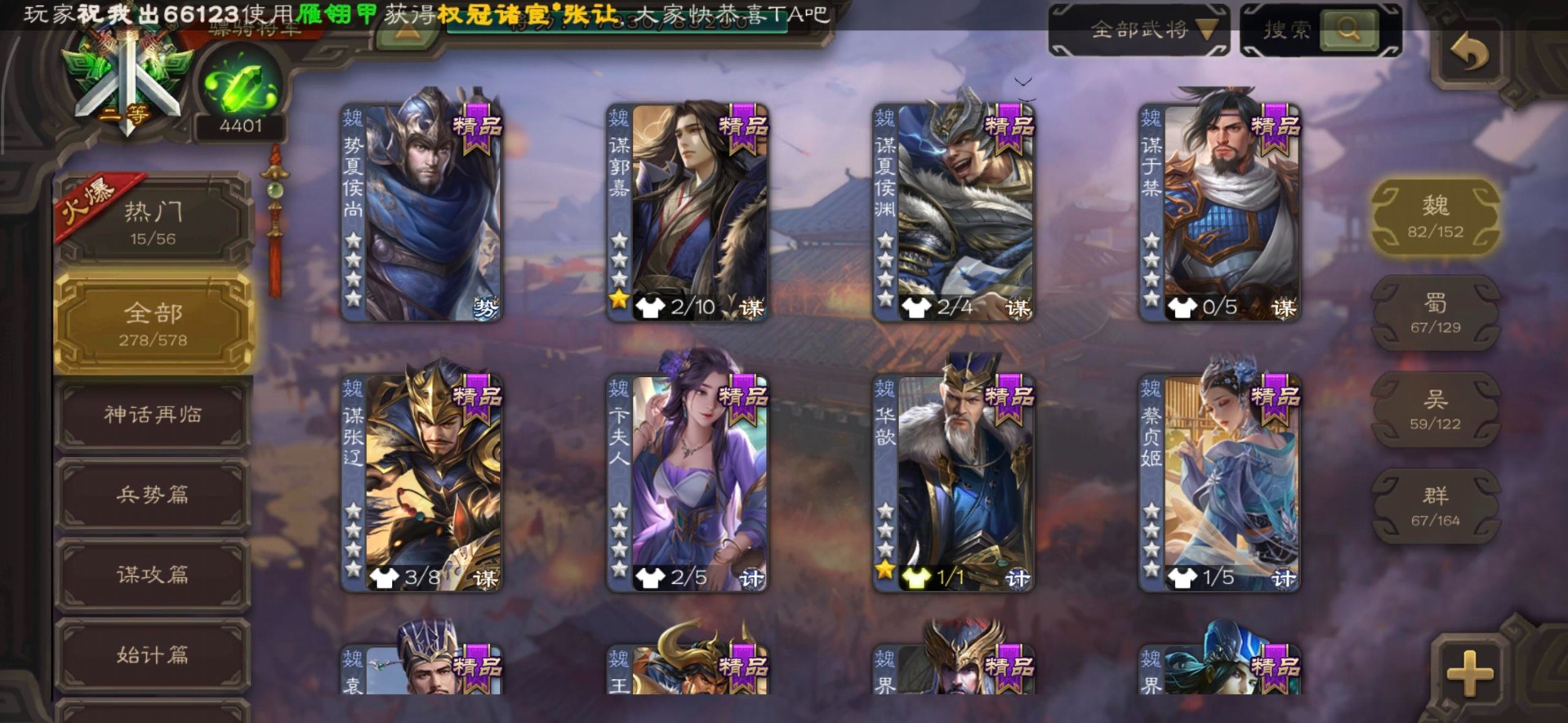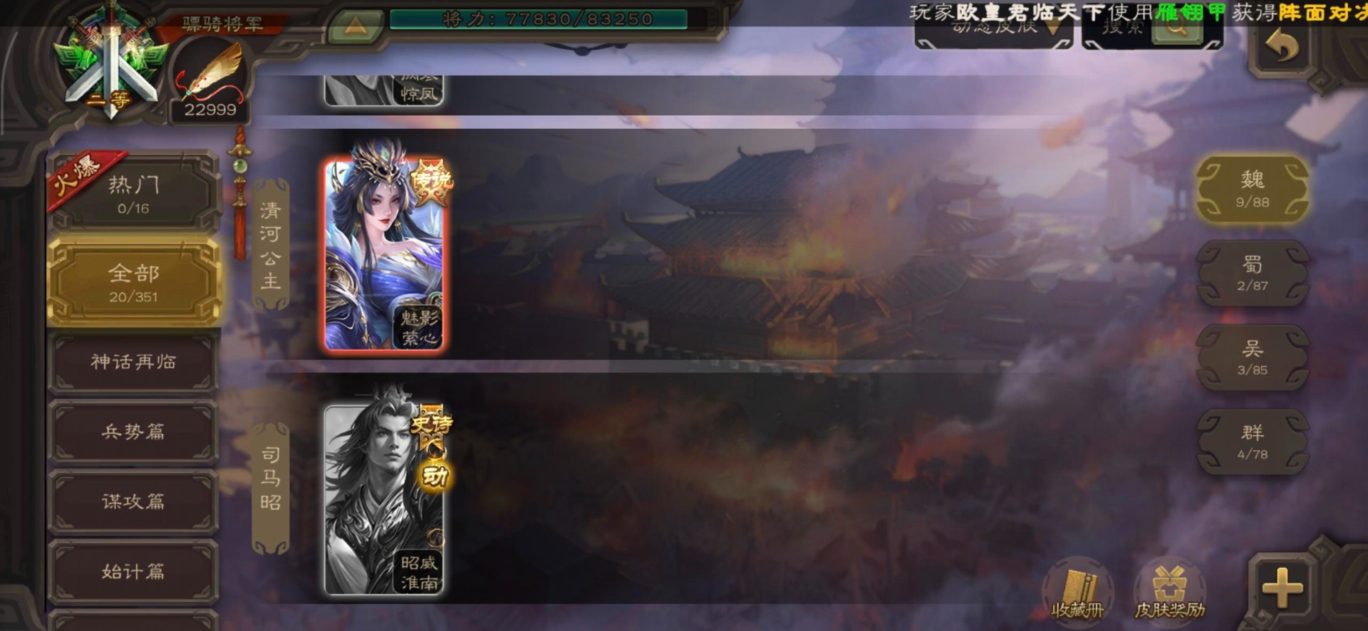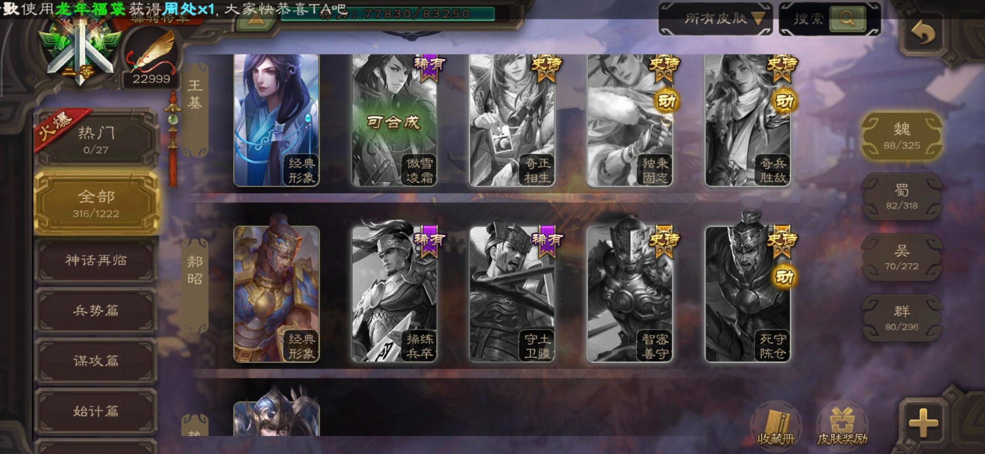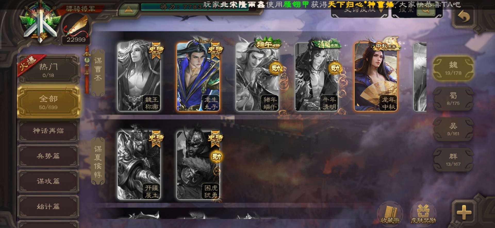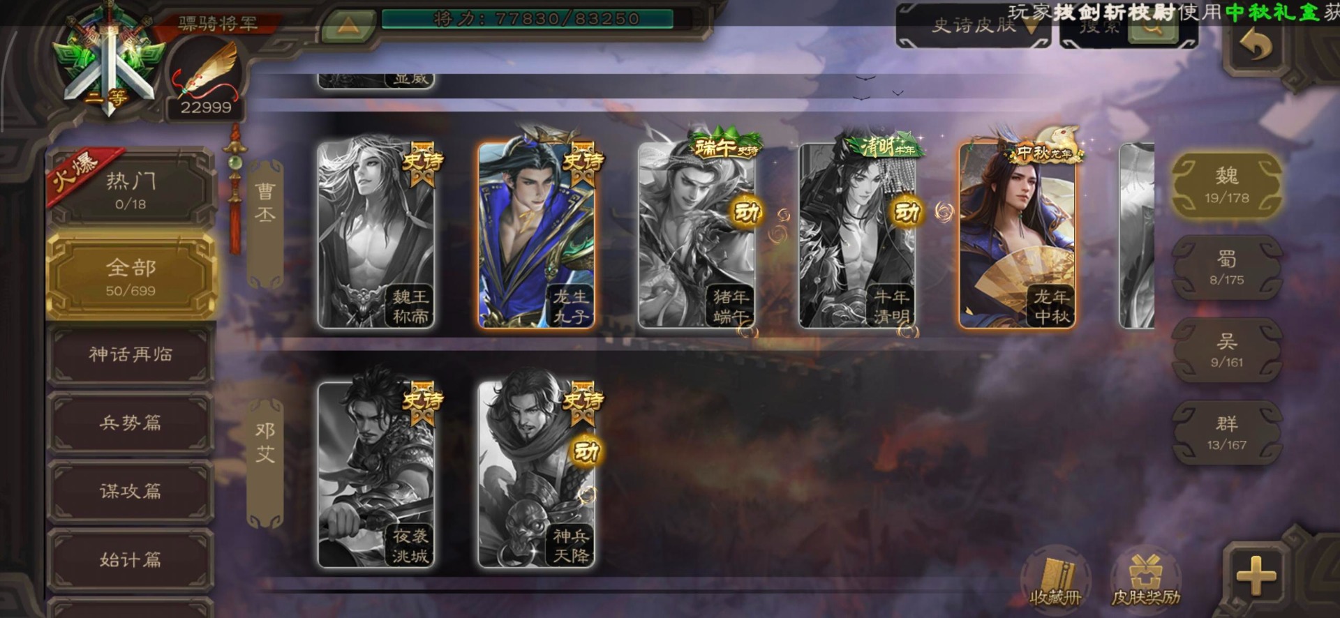 [16295575]vip8 骠骑将军 278武将 20动态皮肤 30史诗武将 【魏国武将】:星周不疑界钟会郝昭程昱曹婴曹纯戏志才于禁界夏侯惇曹彰界张辽曹植李通界许褚吕虔界荀彧界郭嘉张恭王异sp贾诩