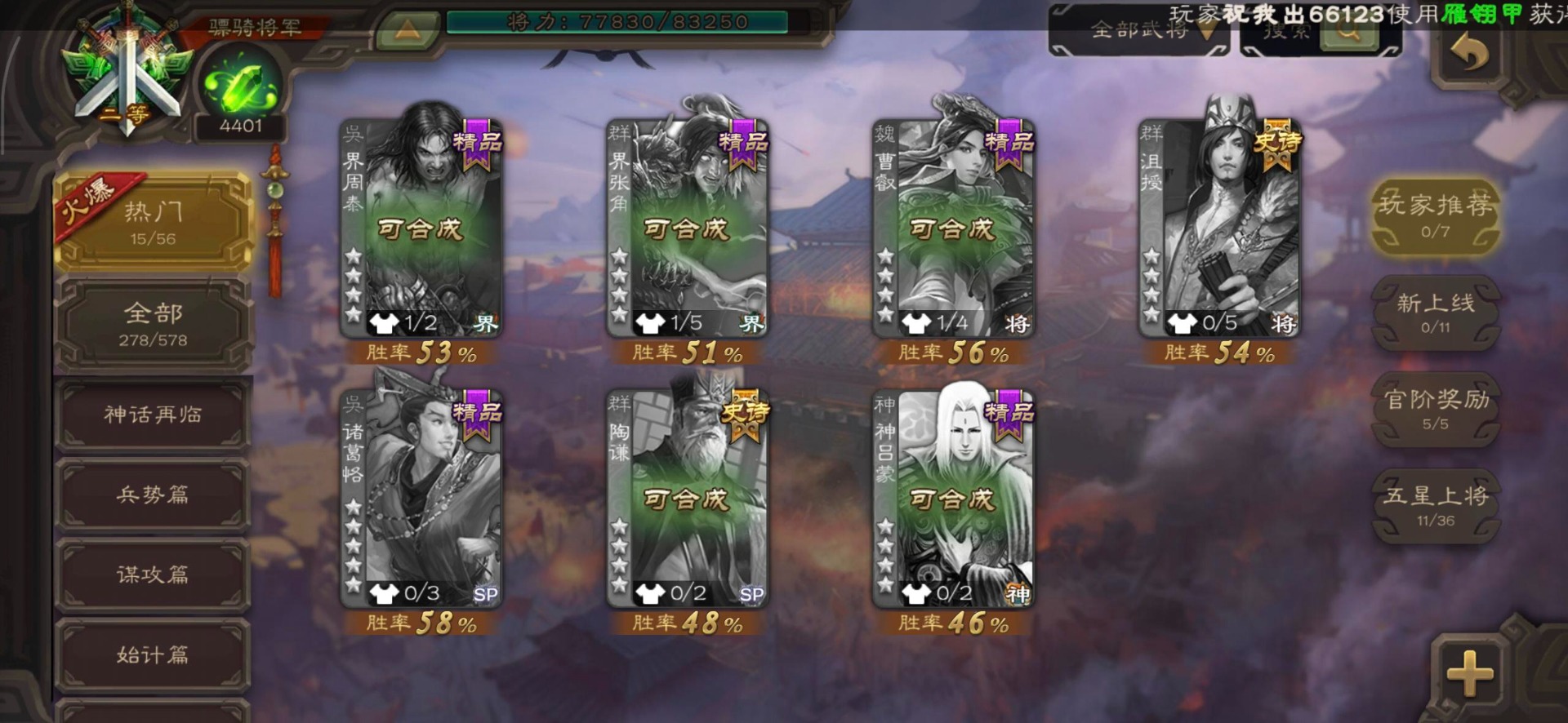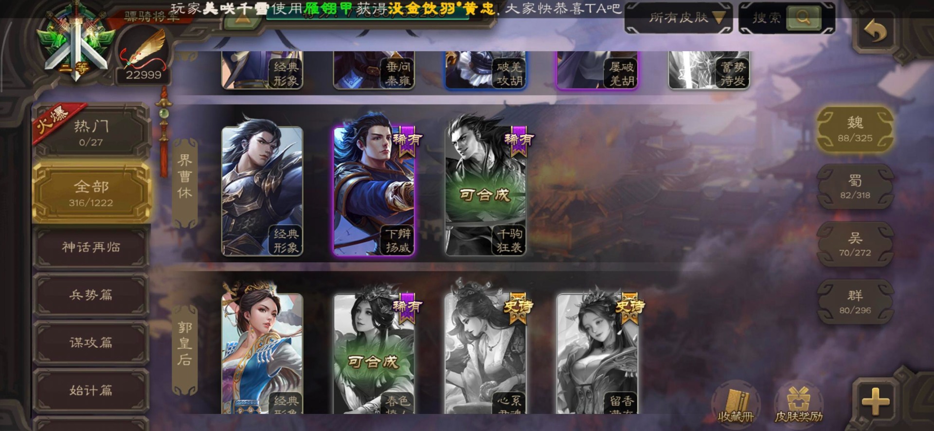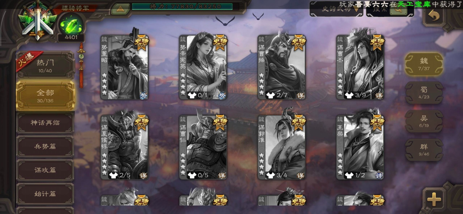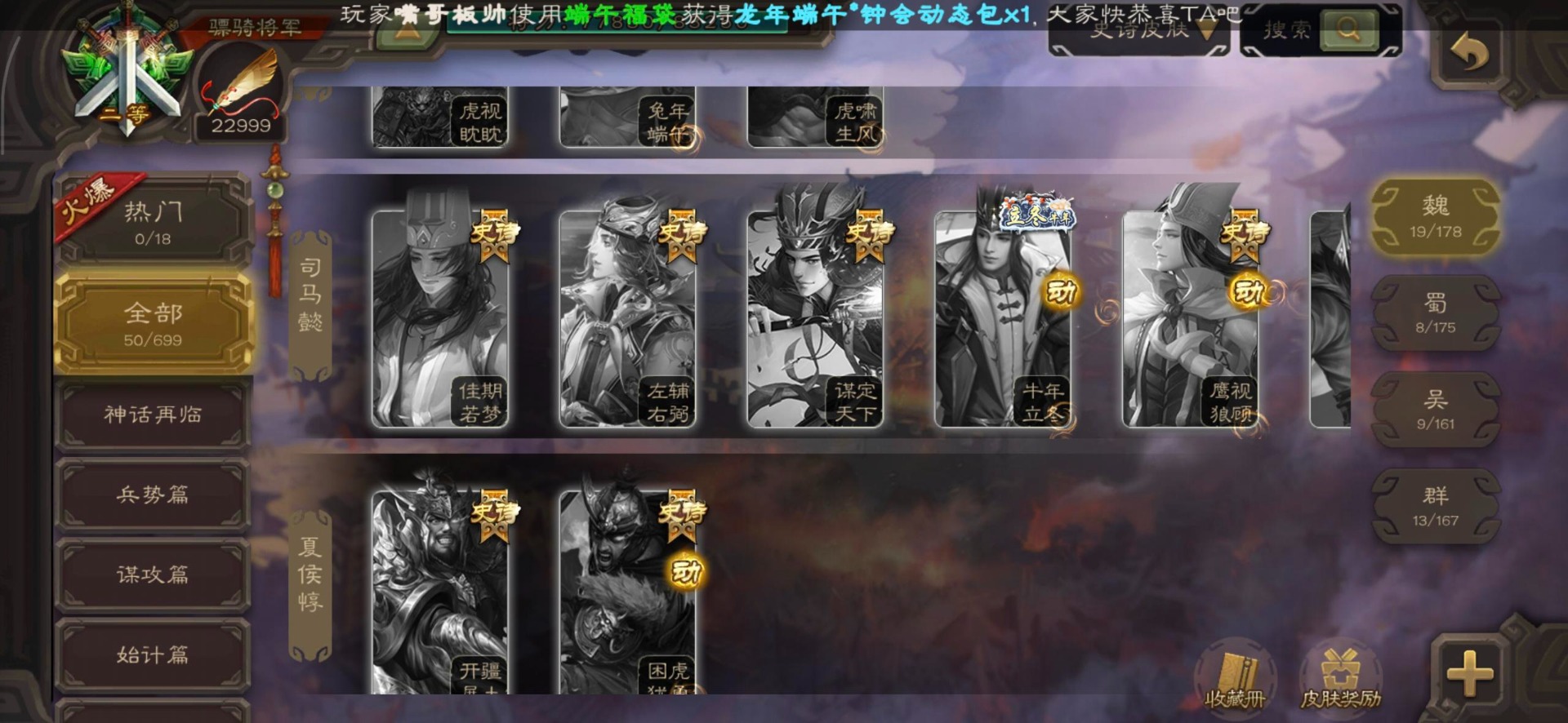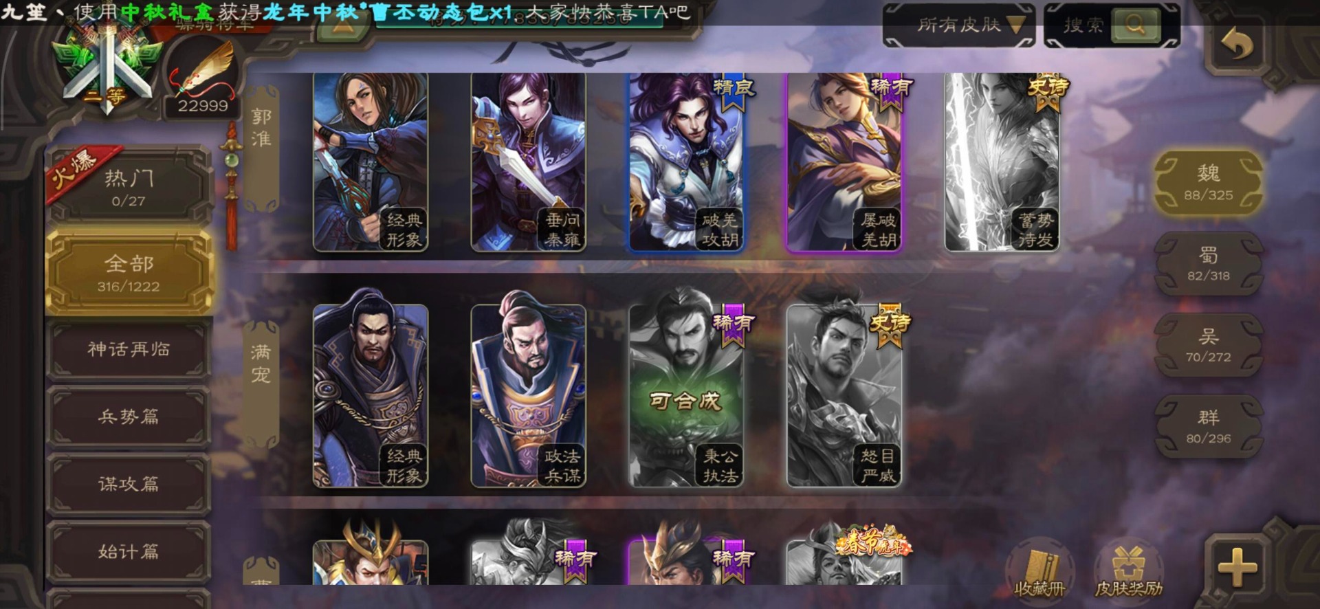 [16295575]vip8 骠骑将军 278武将 20动态皮肤 30史诗武将 【魏国武将】:星周不疑界钟会郝昭程昱曹婴曹纯戏志才于禁界夏侯惇曹彰界张辽曹植李通界许褚吕虔界荀彧界郭嘉张恭王异sp贾诩