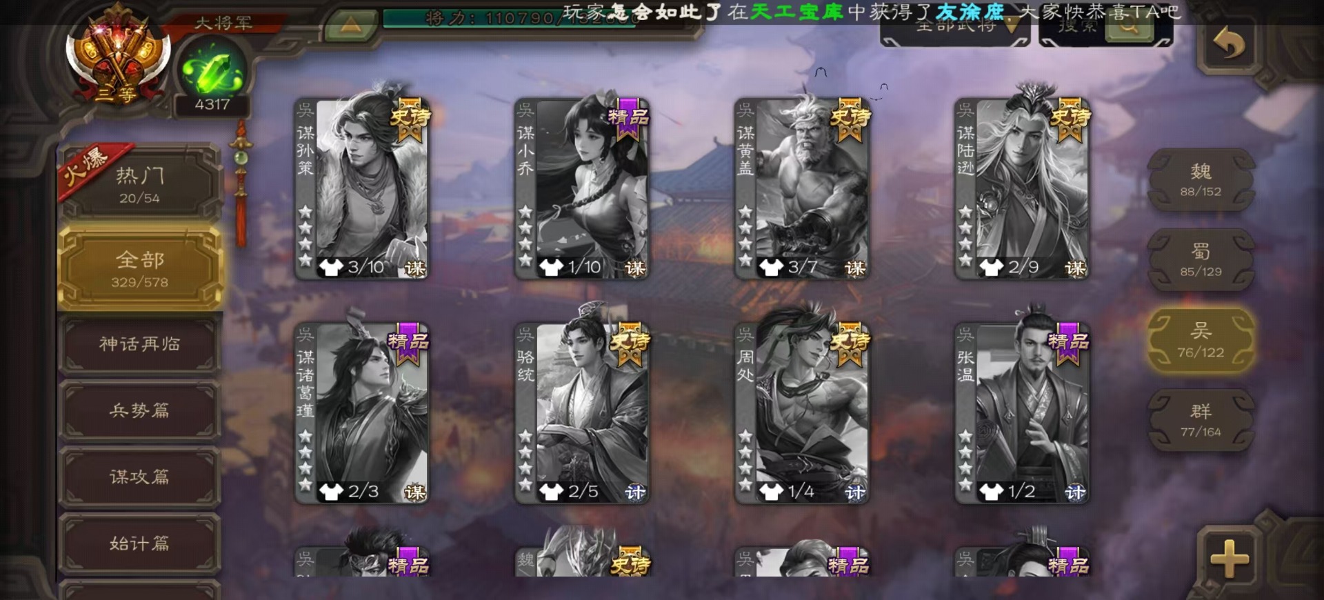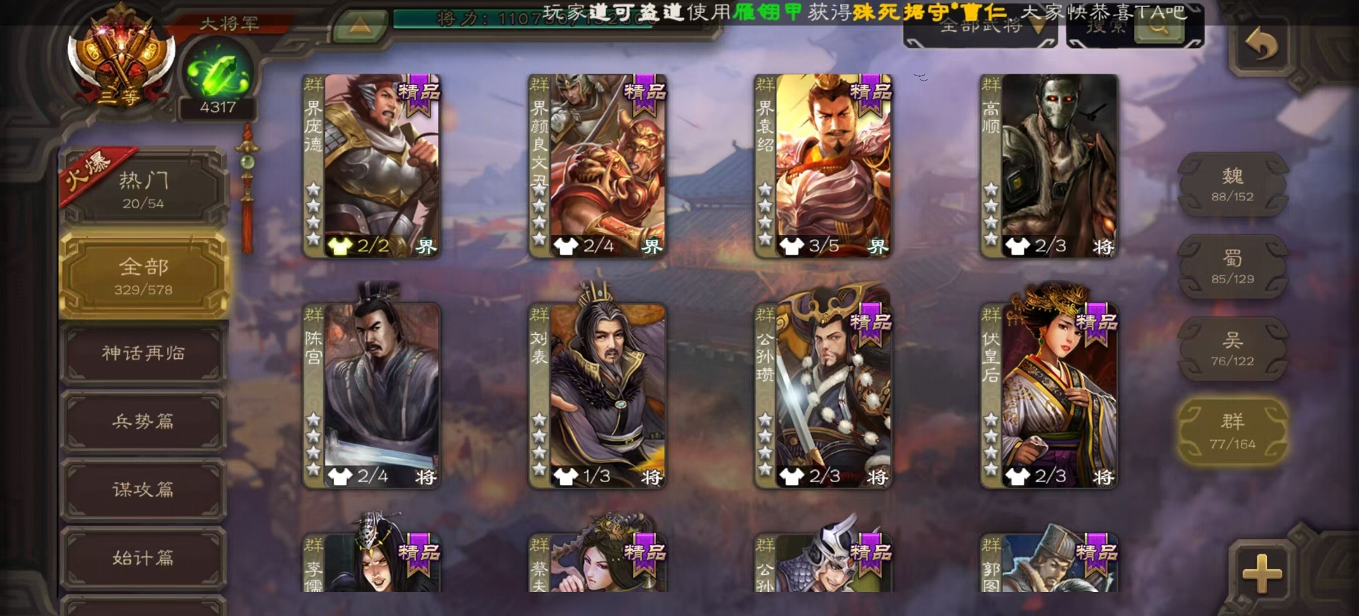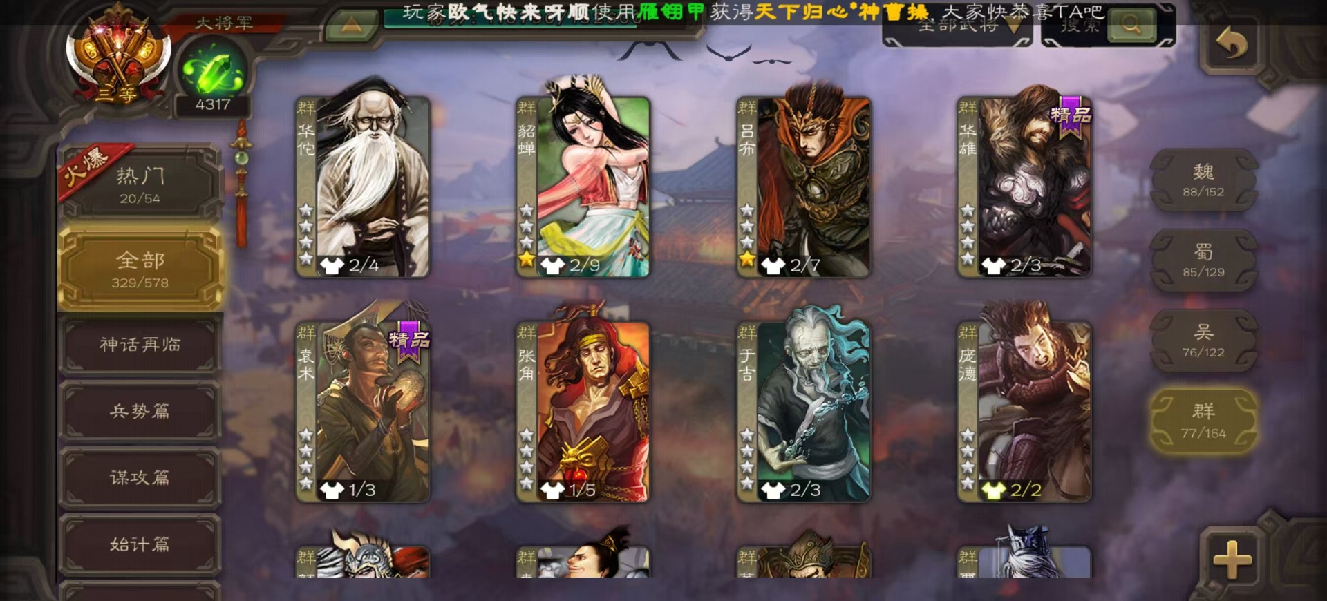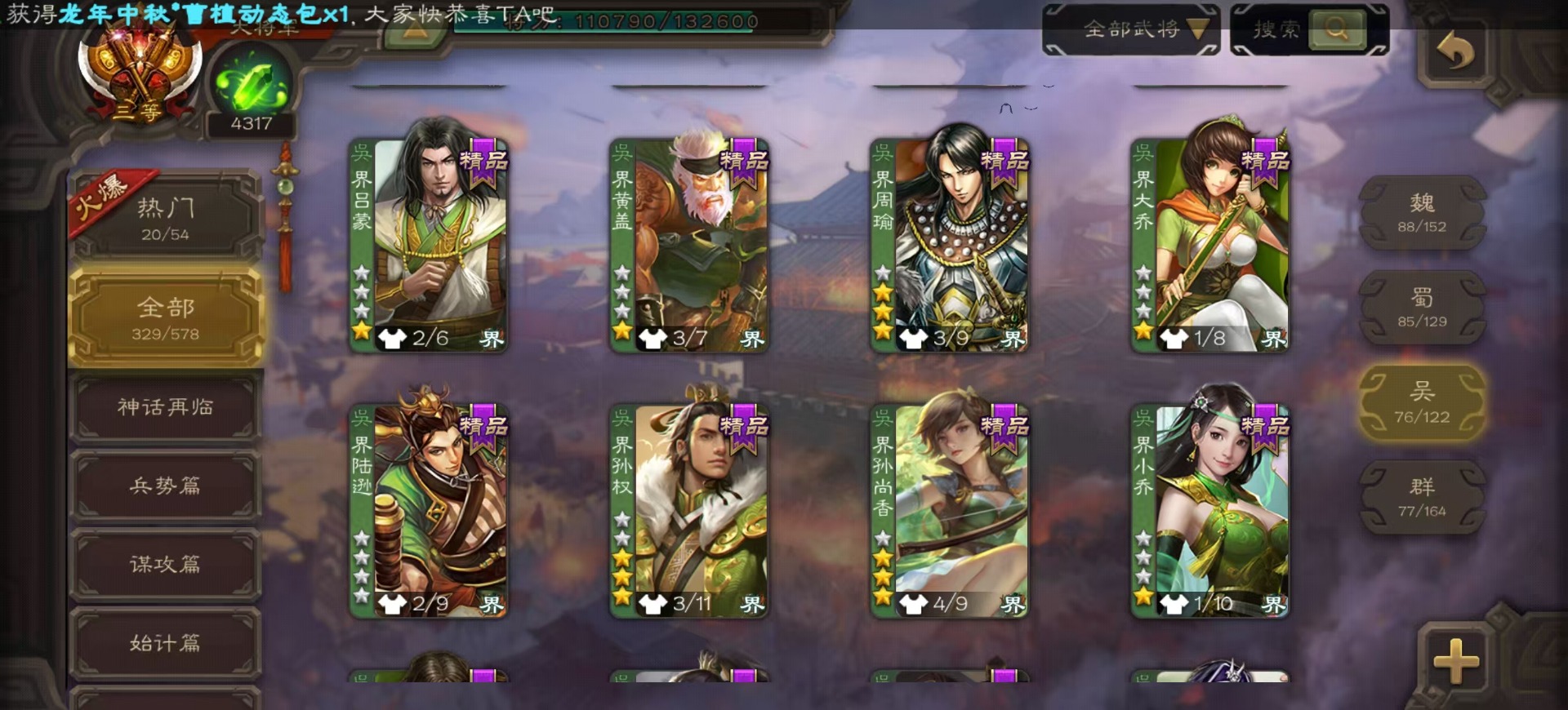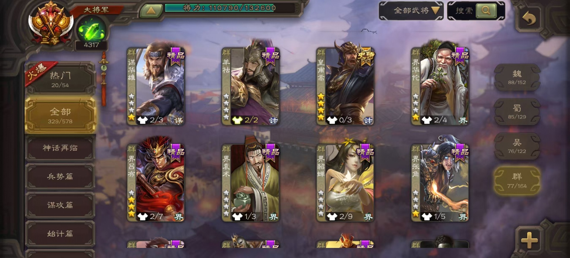[16295583]vip8 大将军 329武将 40动态皮肤 36史诗武将 4宝珠 【神将】:神吕布神赵云神陆逊神张辽神郭嘉神太史慈 【魏国武将】:星周不疑界钟会程昱陈琳曹婴曹纯戏志才 【蜀国武将】:蜀-谋孙尚香谋赵云谋马超诸葛瞻周群沙摩柯谯周界黄忠花鬘关索董允 【吴国武将】:势陆郁生吴-谋孙尚香吴景界徐盛 【群国武将】:皇甫嵩左慈张让兀突骨苏飞麹义南华老仙界李儒