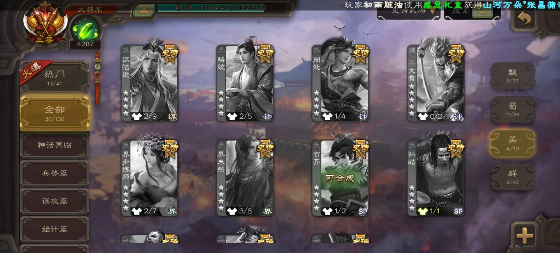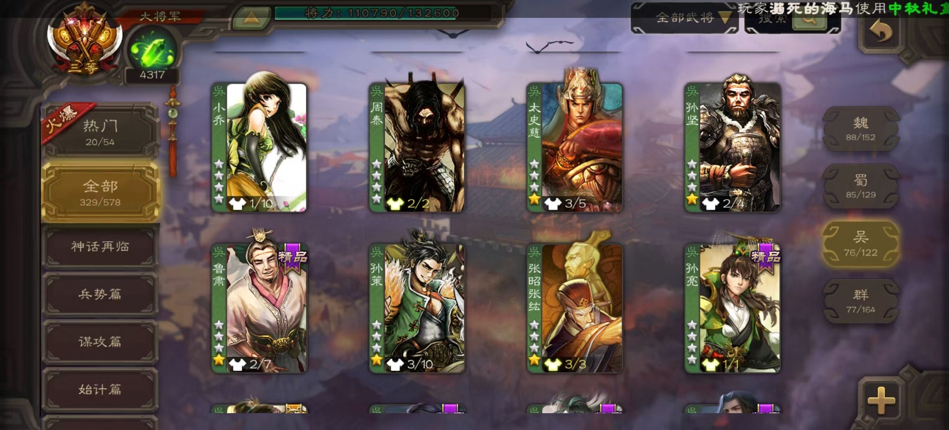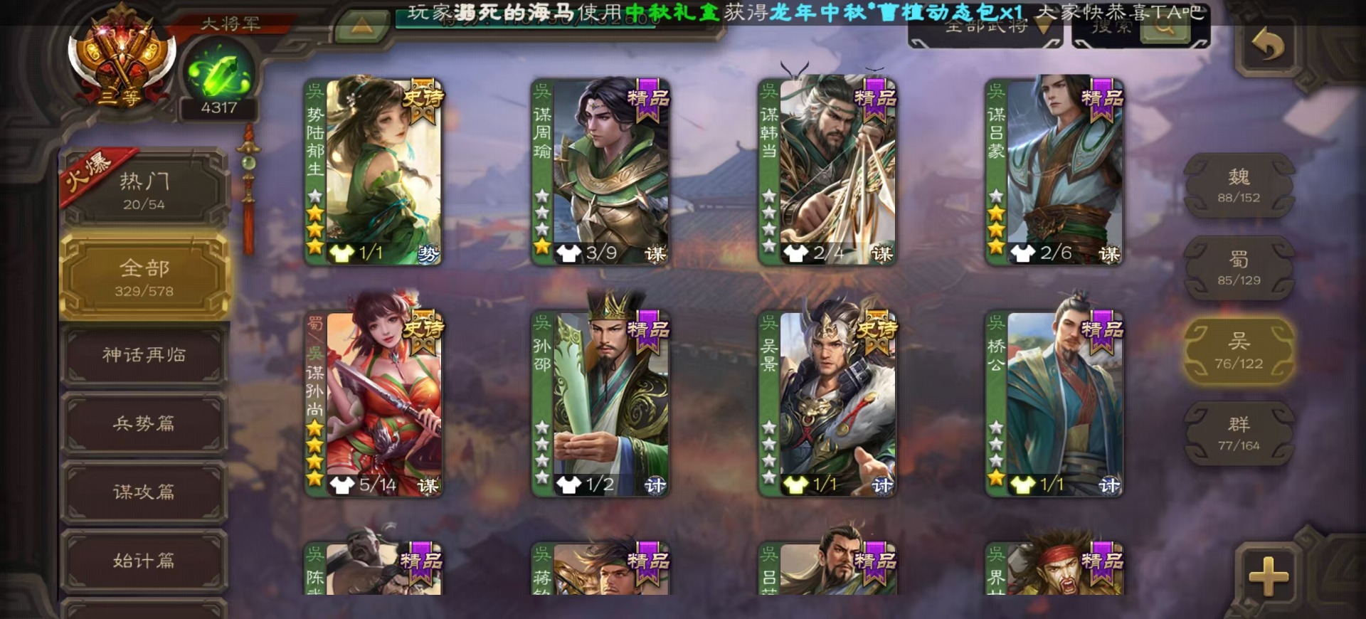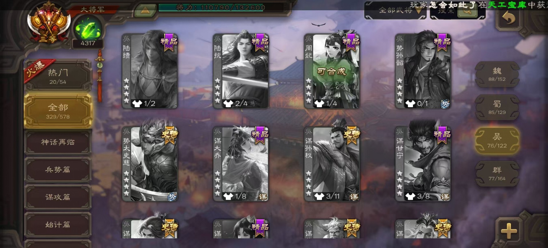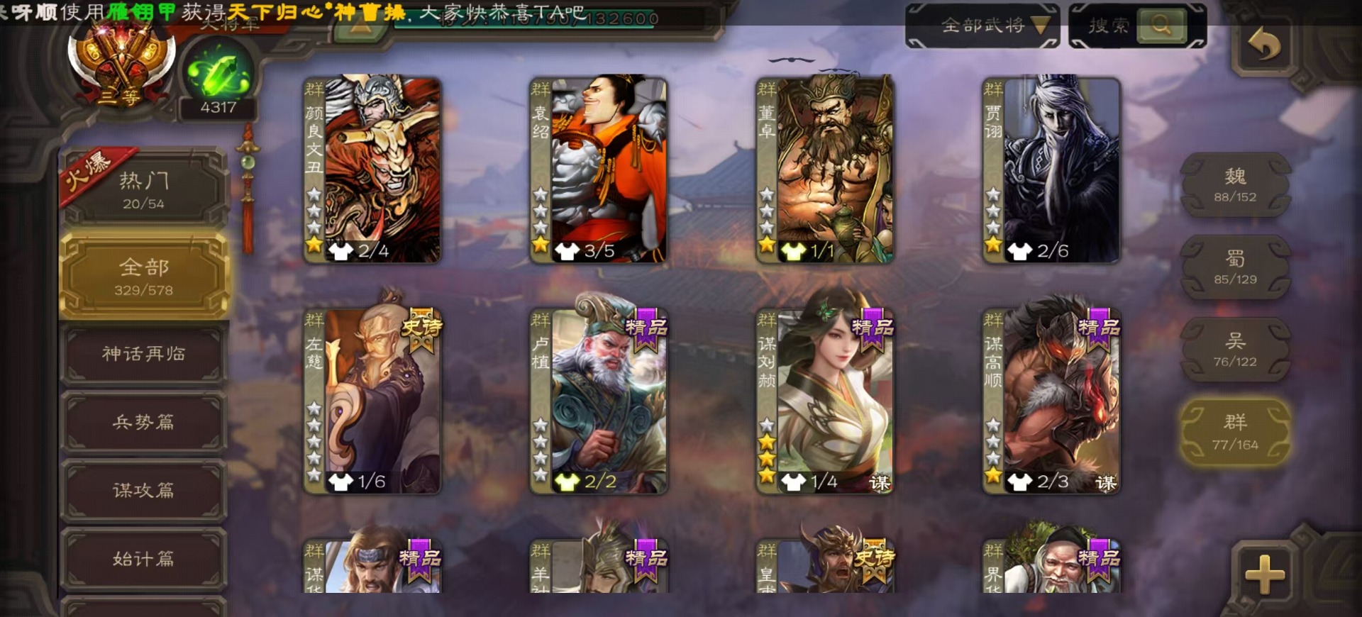 [16295583]vip8 大将军 329武将 40动态皮肤 36史诗武将 4宝珠 【神将】:神吕布神赵云神陆逊神张辽神郭嘉神太史慈 【魏国武将】:星周不疑界钟会程昱陈琳曹婴曹纯戏志才 【蜀国武将】:蜀-谋孙尚香谋赵云谋马超诸葛瞻周群沙摩柯谯周界黄忠花鬘关索董允 【吴国武将】:势陆郁生吴-谋孙尚香吴景界徐盛 【群国武将】:皇甫嵩左慈张让兀突骨苏飞麹义南华老仙界李儒