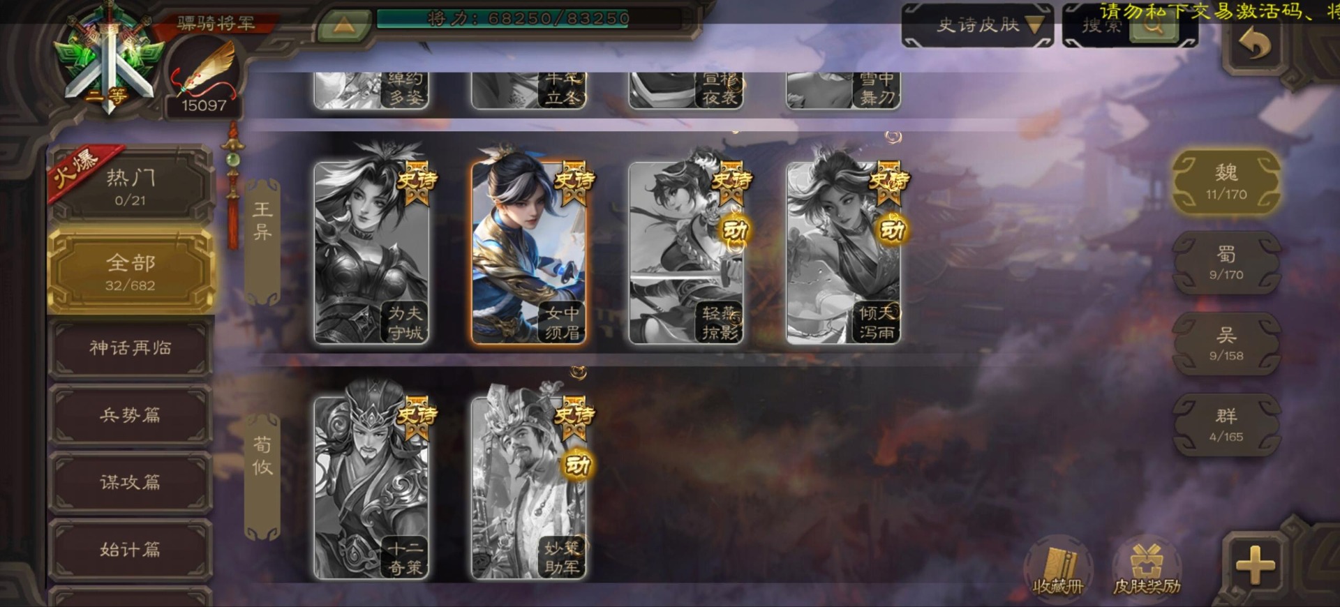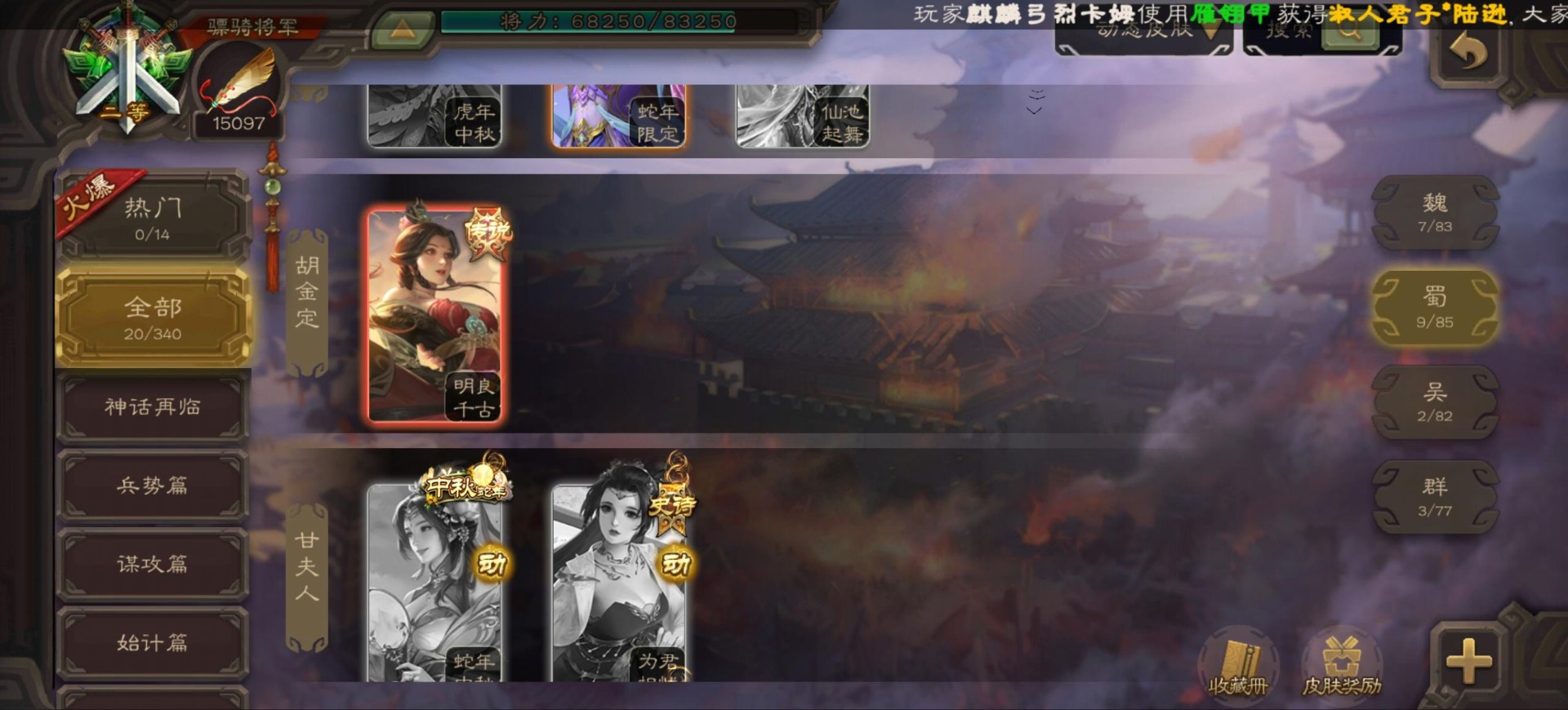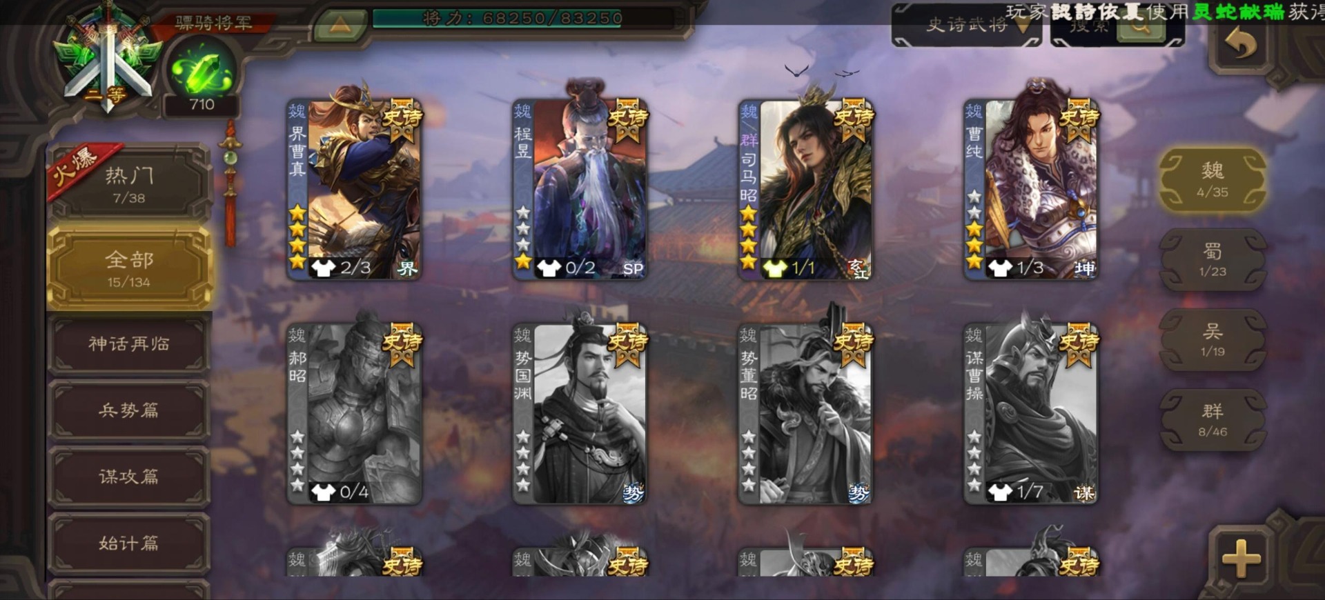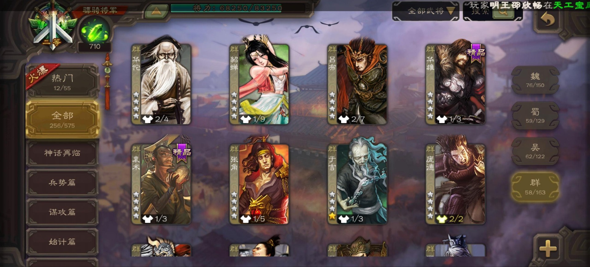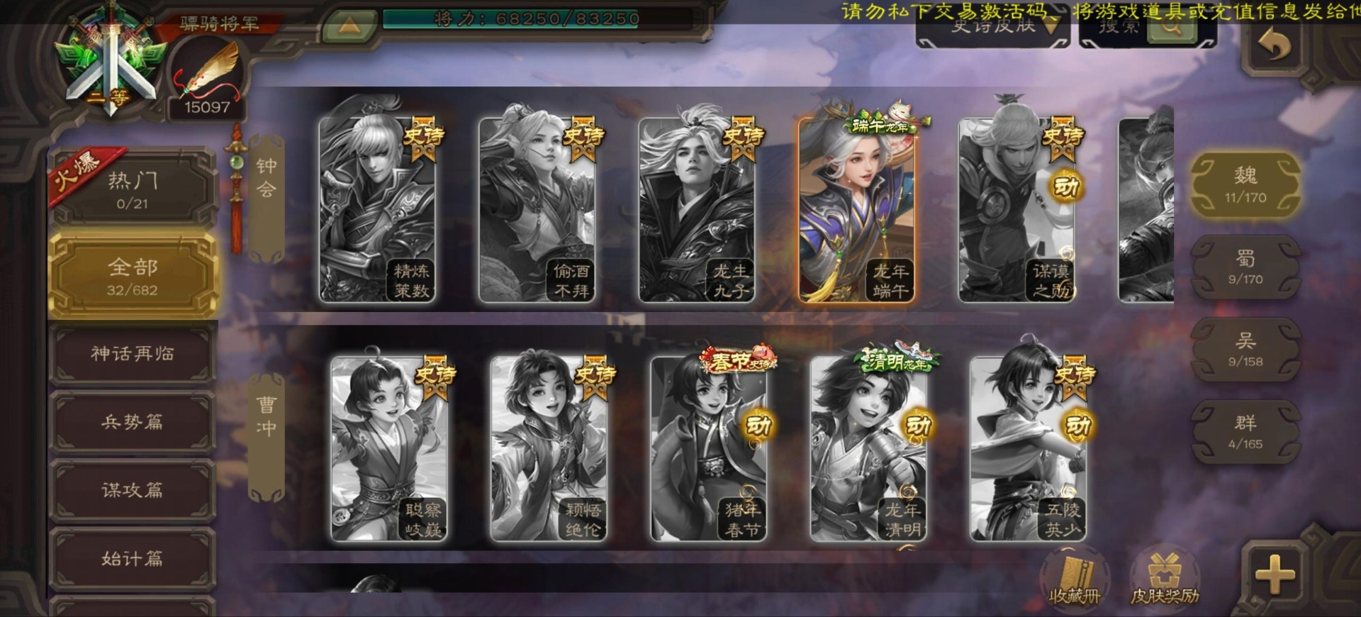 [16296011]vip9 骠骑将军 256武将 20动态皮肤 15史诗武将 【神将】:神郭嘉神太史慈神周瑜 【魏国武将】:界曹真程昱曹纯 【蜀国武将】:张星彩 【群国武将】:群-司马昭张让许攸