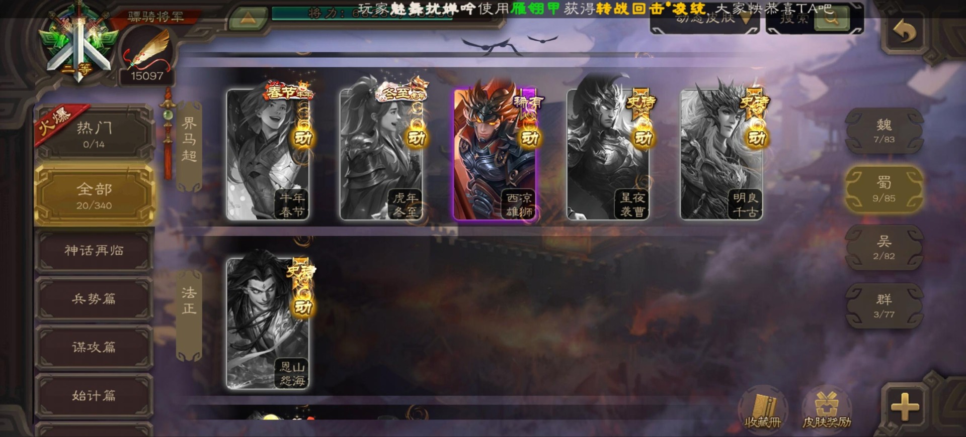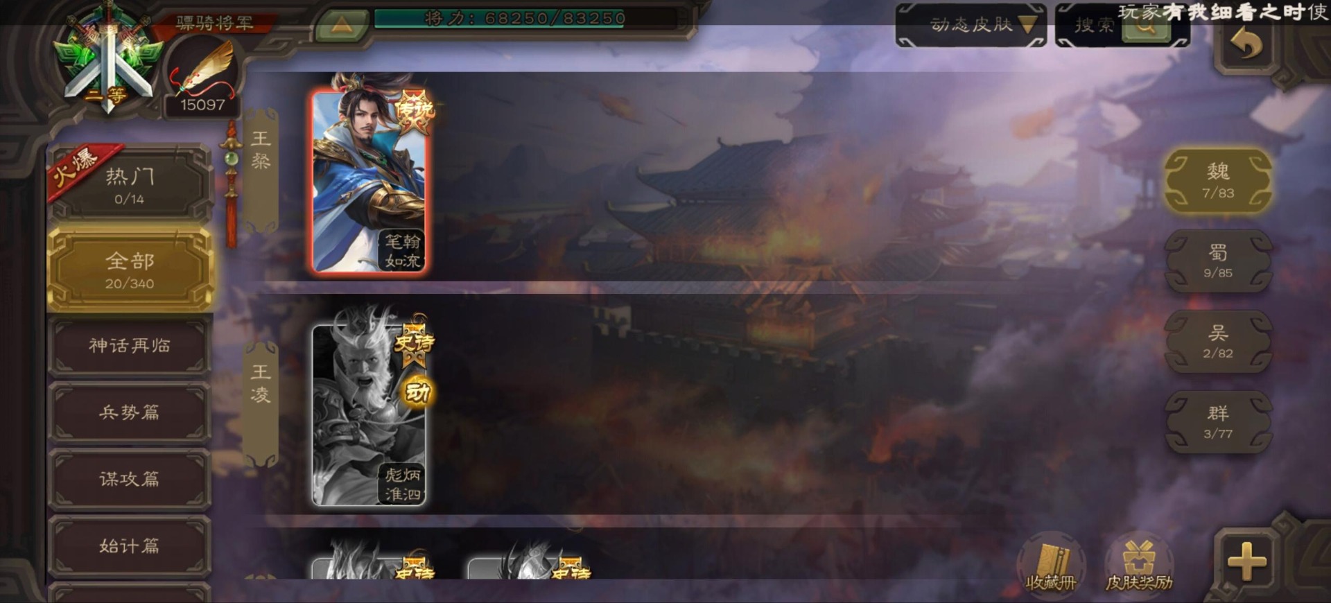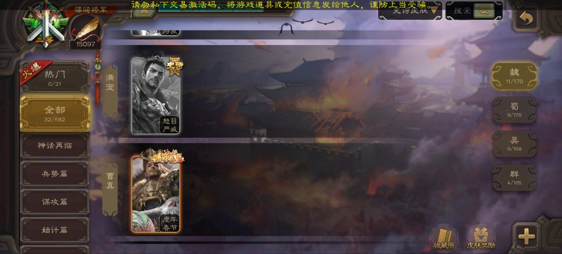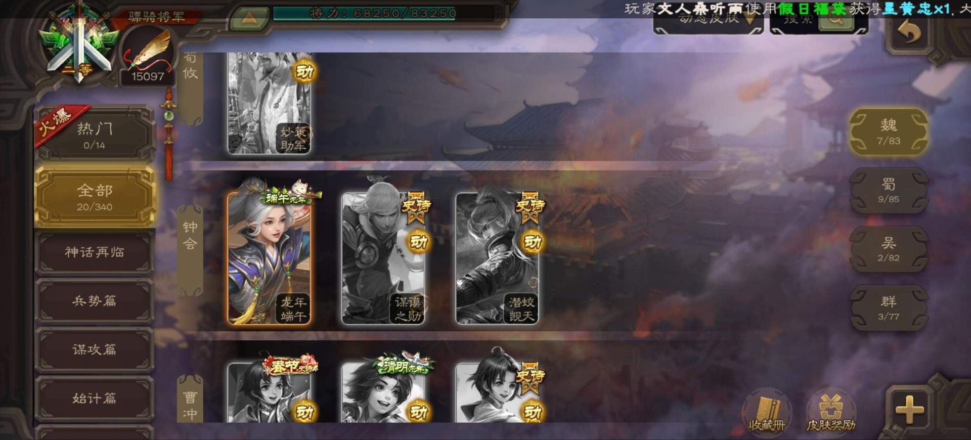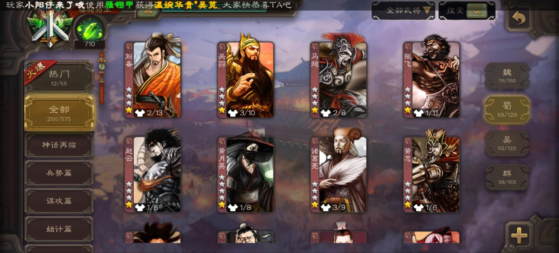 [16296011]vip9 骠骑将军 256武将 20动态皮肤 15史诗武将 【神将】:神郭嘉神太史慈神周瑜 【魏国武将】:界曹真程昱曹纯 【蜀国武将】:张星彩 【群国武将】:群-司马昭张让许攸
