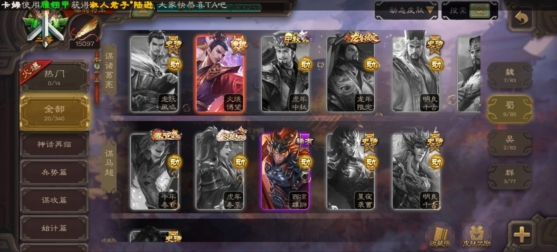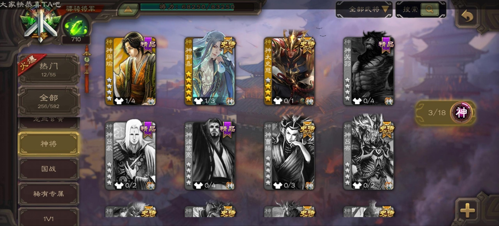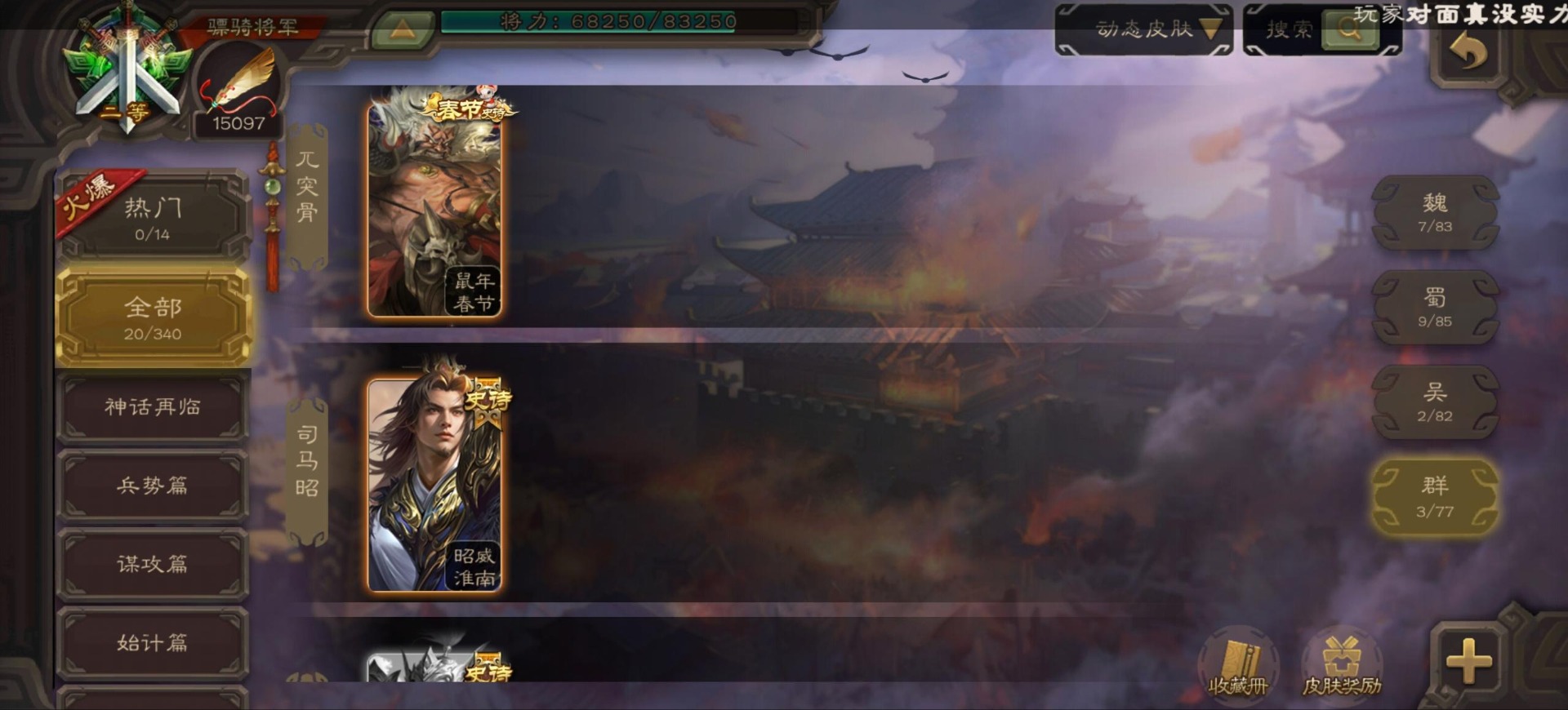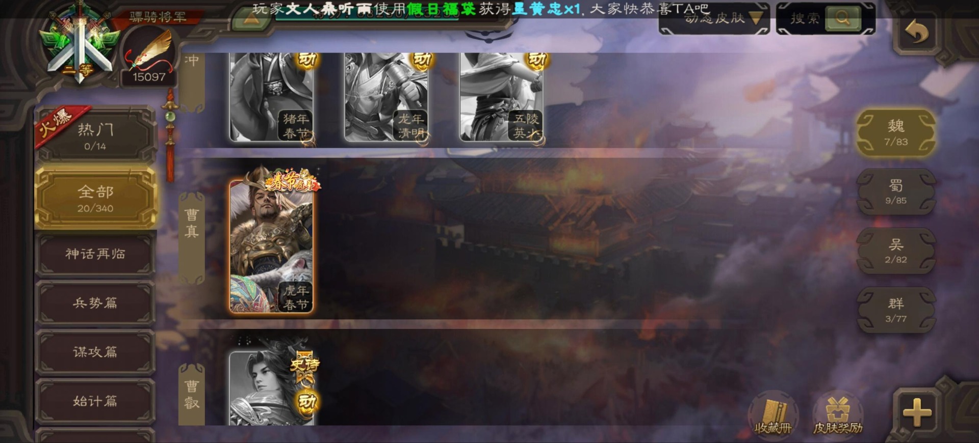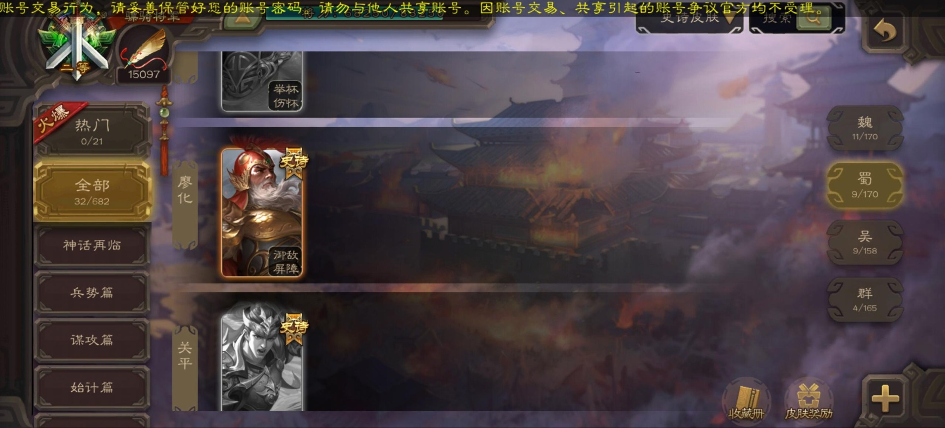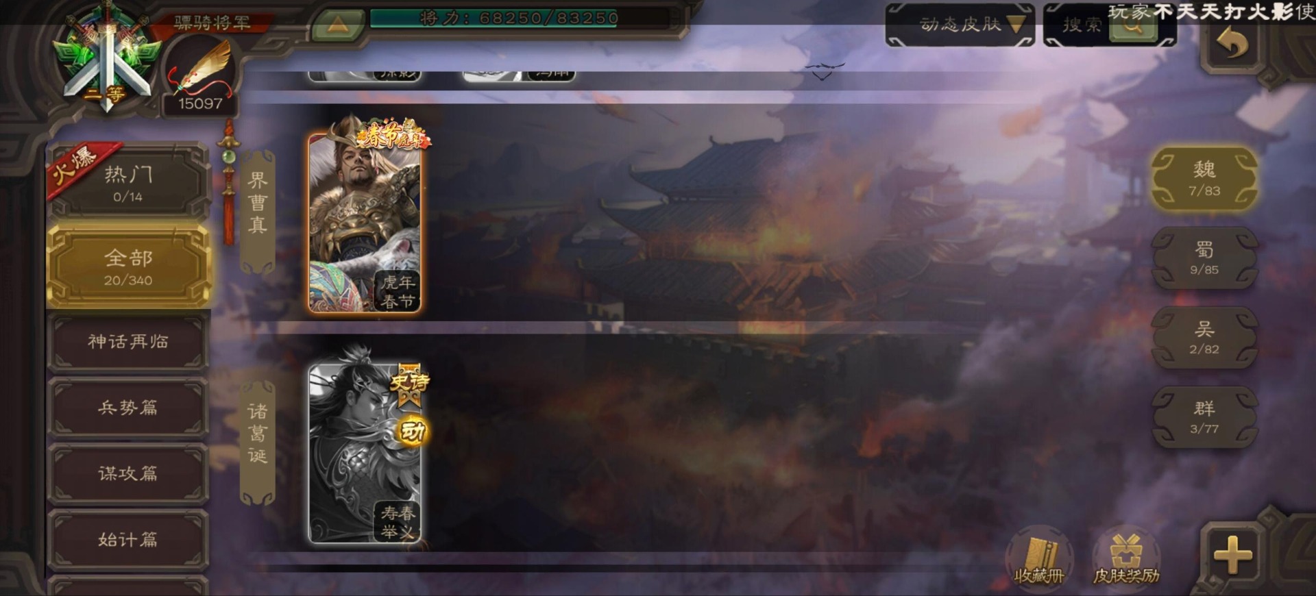[16296011]vip9 骠骑将军 256武将 20动态皮肤 15史诗武将 【神将】:神郭嘉神太史慈神周瑜 【魏国武将】:界曹真程昱曹纯 【蜀国武将】:张星彩 【群国武将】:群-司马昭张让许攸