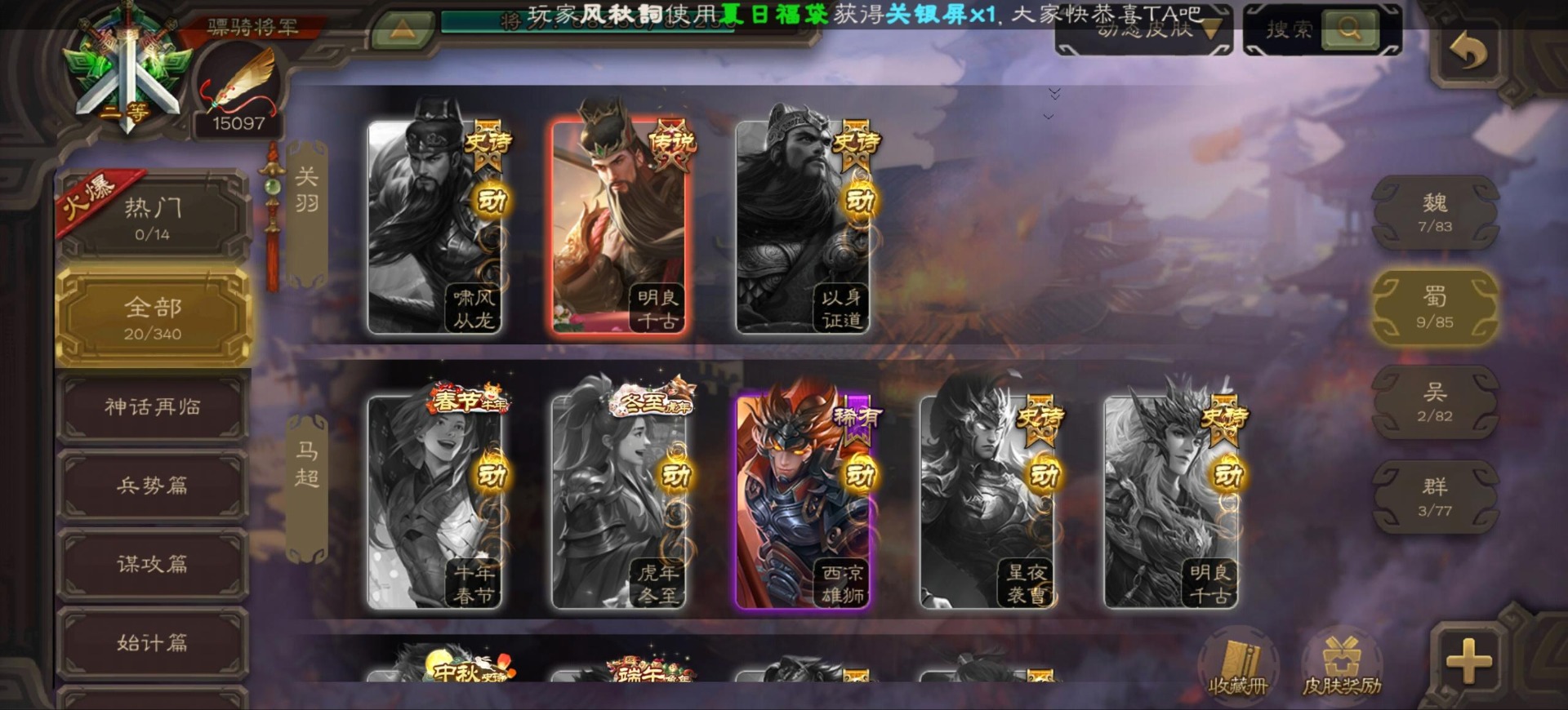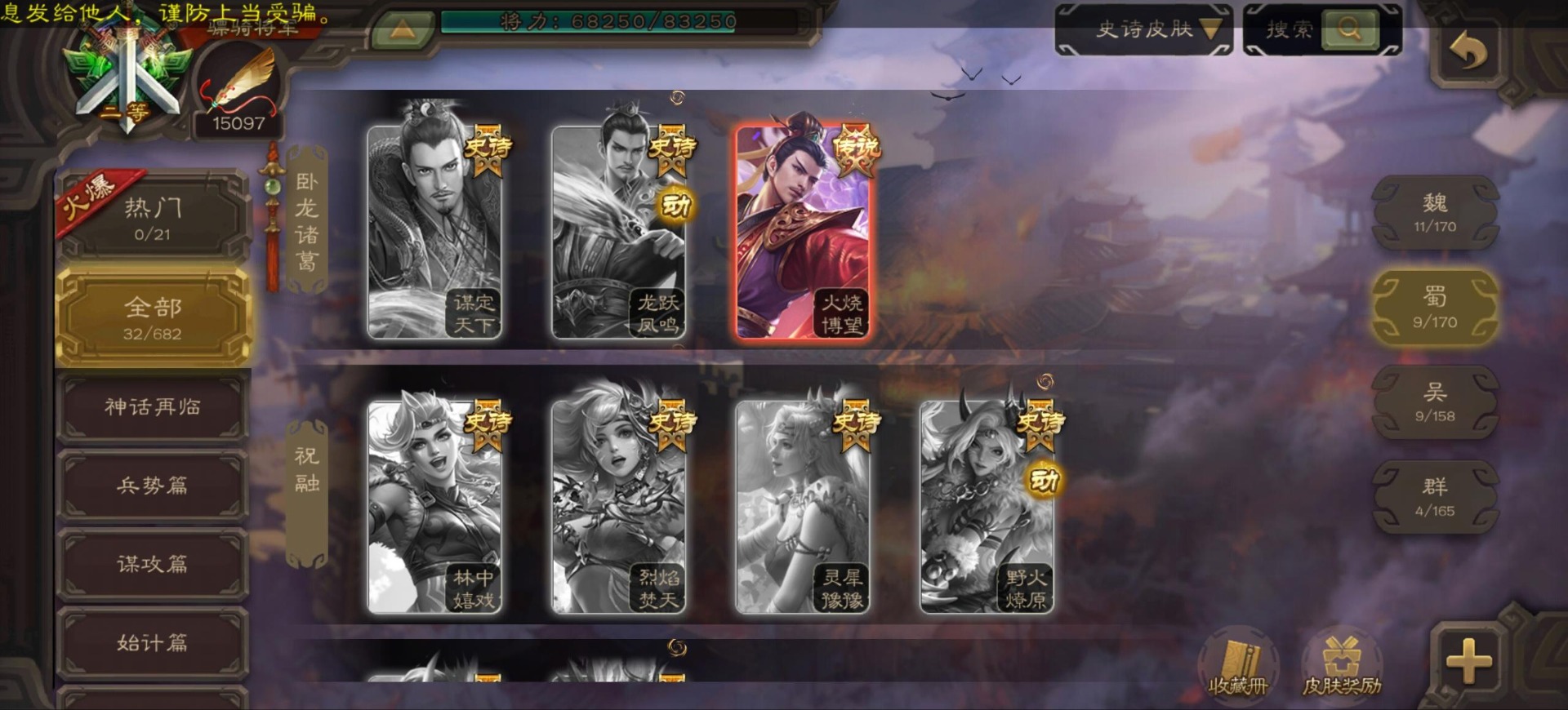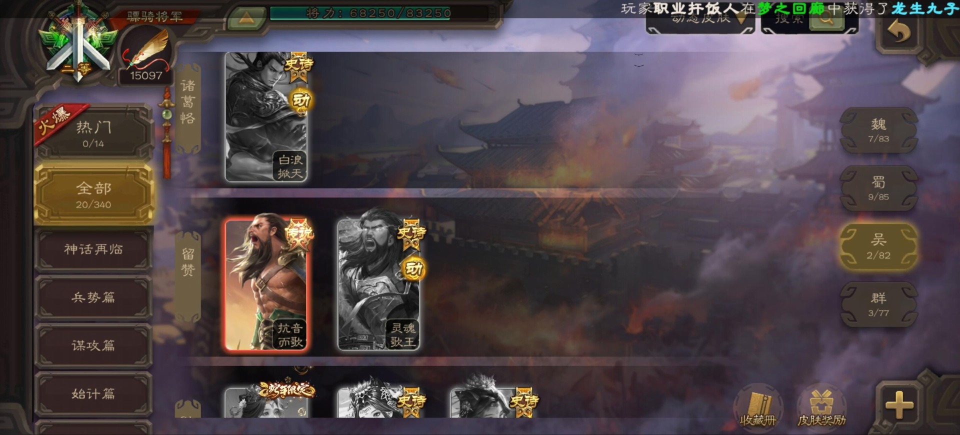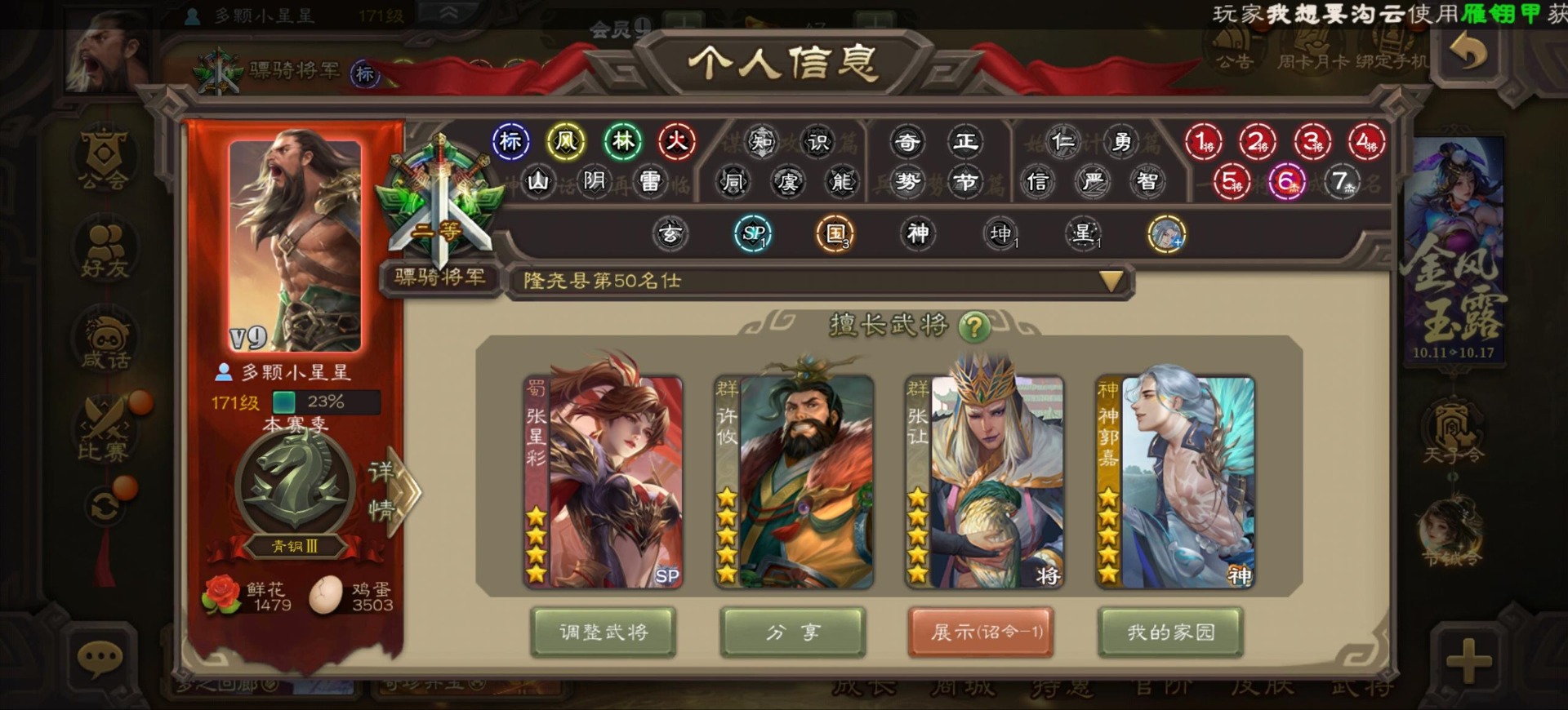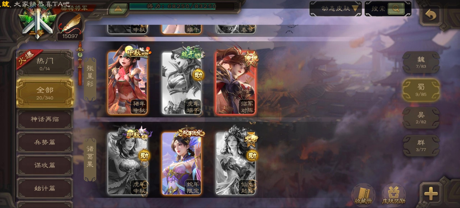[16296011]vip9 骠骑将军 256武将 20动态皮肤 15史诗武将 【神将】:神郭嘉神太史慈神周瑜 【魏国武将】:界曹真程昱曹纯 【蜀国武将】:张星彩 【群国武将】:群-司马昭张让许攸