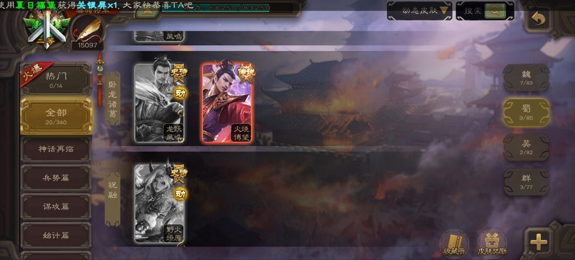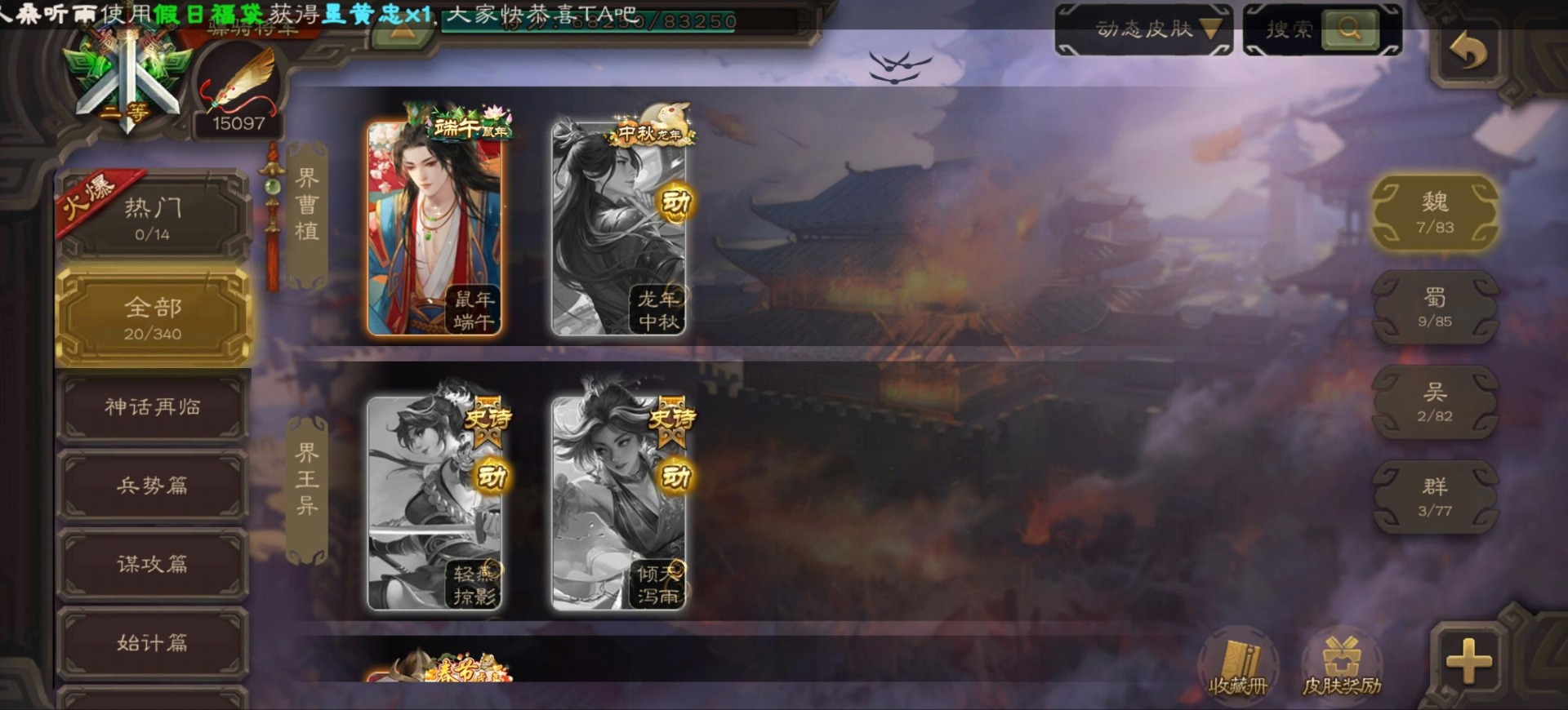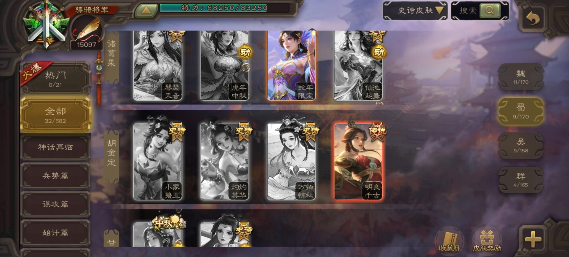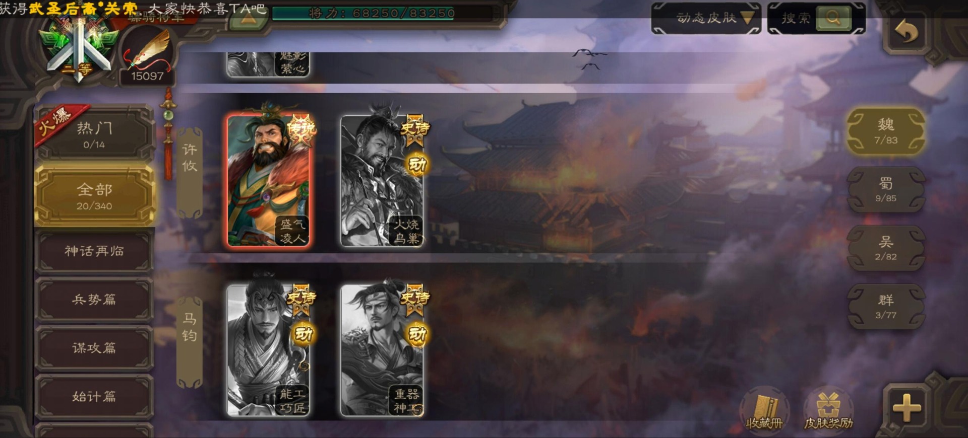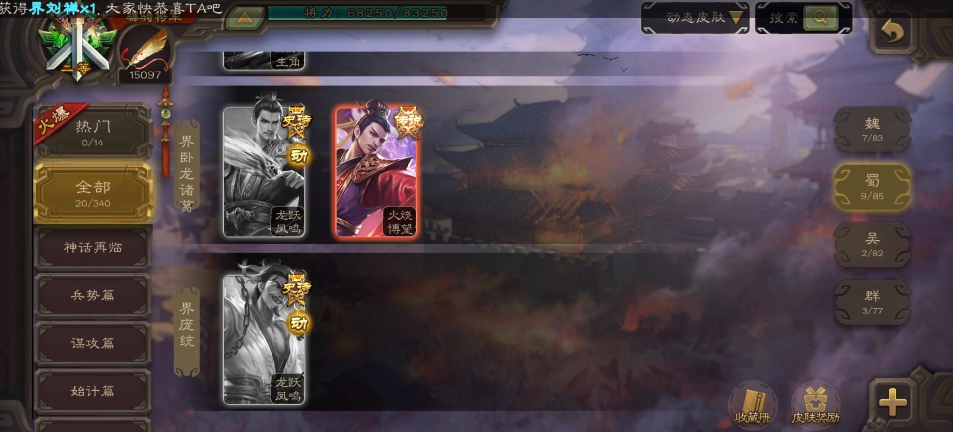 [16296011]vip9 骠骑将军 256武将 20动态皮肤 15史诗武将 【神将】:神郭嘉神太史慈神周瑜 【魏国武将】:界曹真程昱曹纯 【蜀国武将】:张星彩 【群国武将】:群-司马昭张让许攸