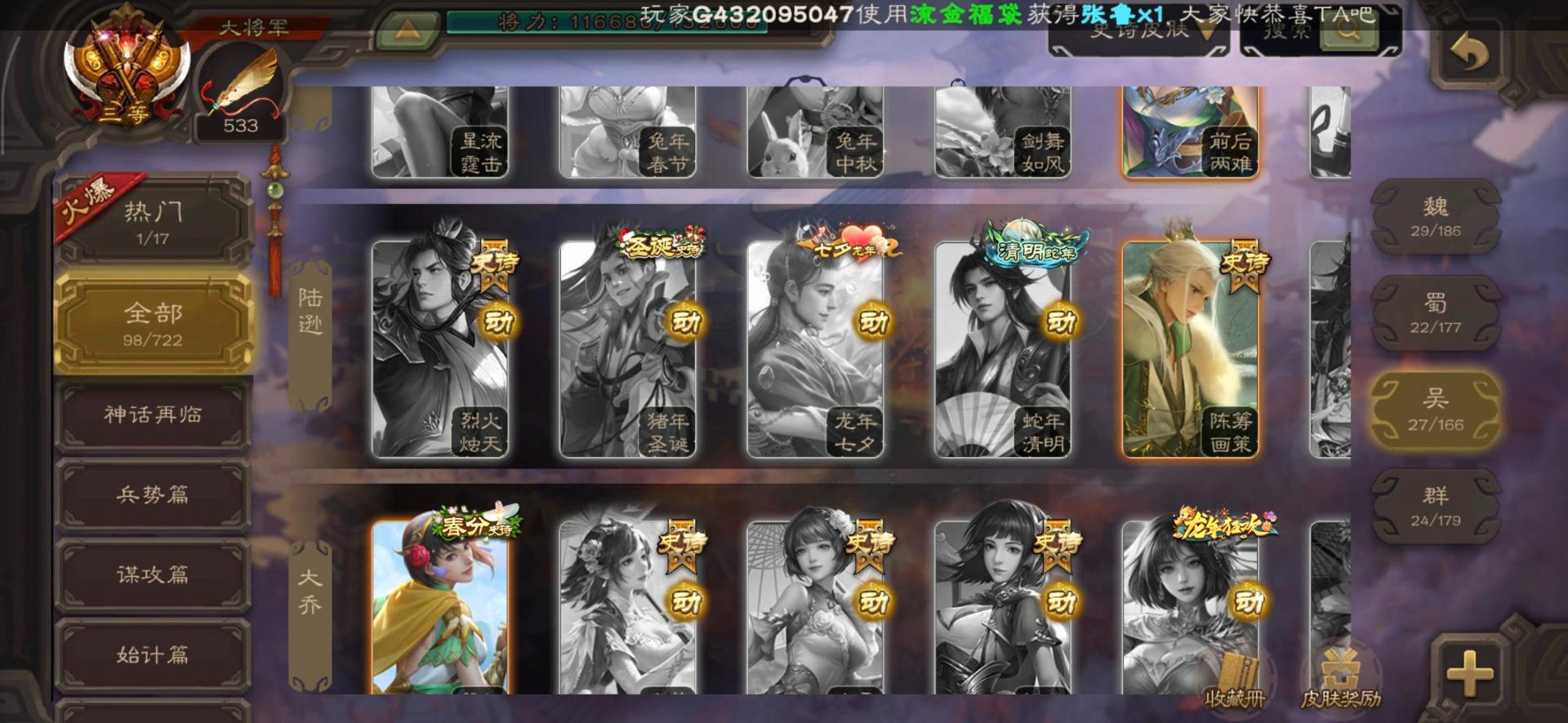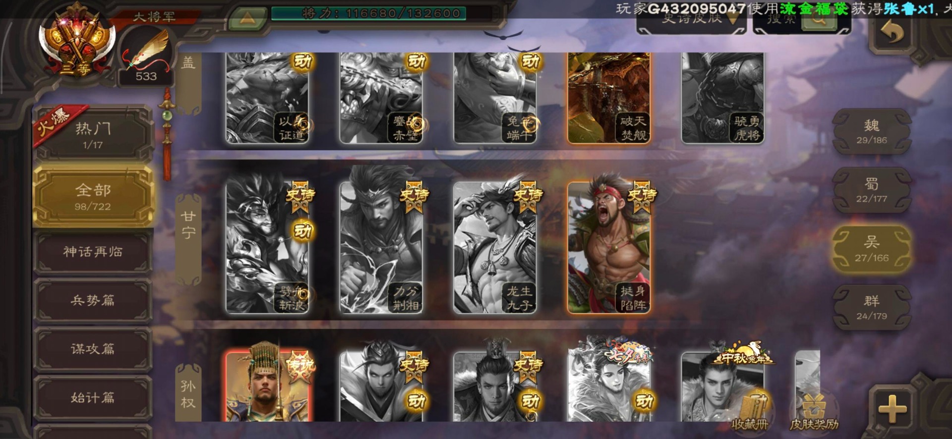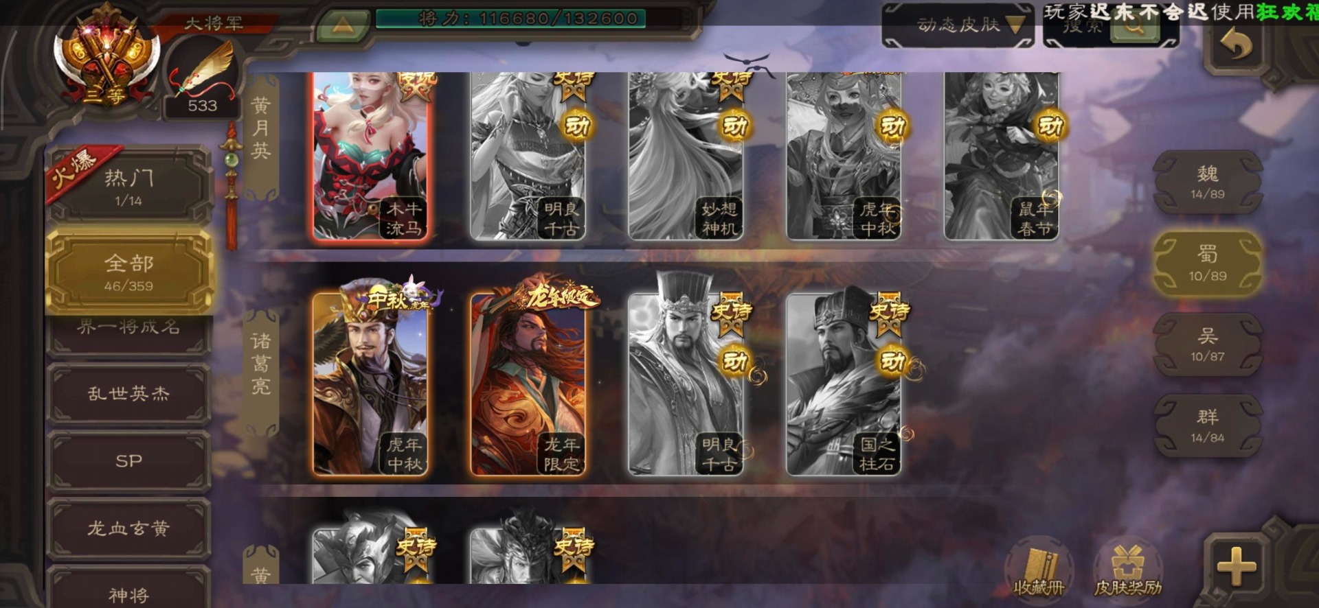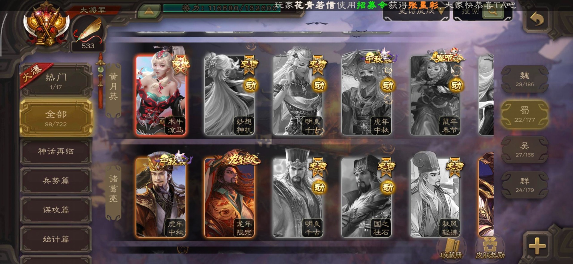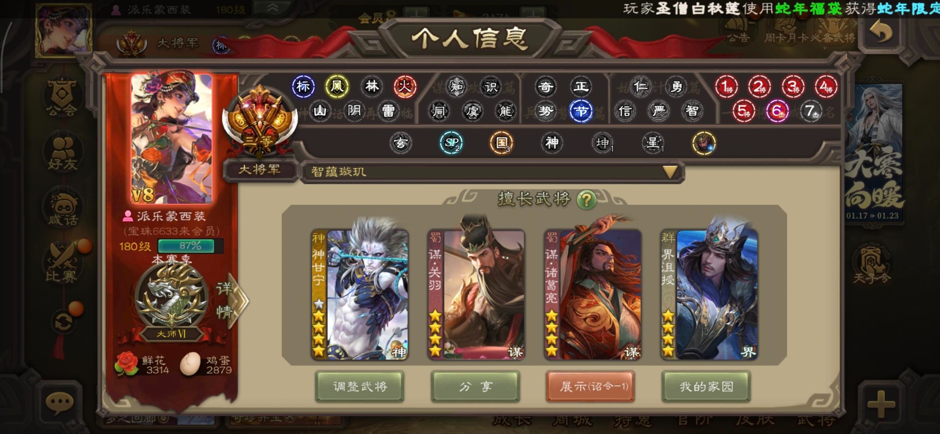 [16303485]vip8 大将军 350武将 46动态皮肤 40史诗武将 41宝珠 【魏国武将】势·钟会清河公主势辛宪英星周不疑王元姬程昱陈琳曹婴曹纯戏志才 【蜀国武将】谋诸葛亮谋赵云谋马超诸葛瞻张星彩沙摩柯谯周花鬘董允谋关羽 【吴国武将】势太史慈势陆郁生界徐盛 【群国武将】群-司马昭界沮授左慈张让星甘宁兀突骨麹义南华老仙沮授界左慈界李儒谋张角公孙瓒