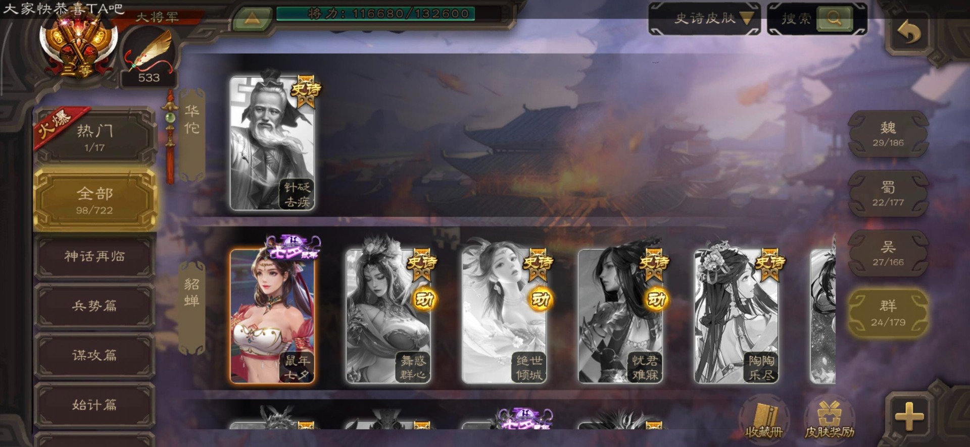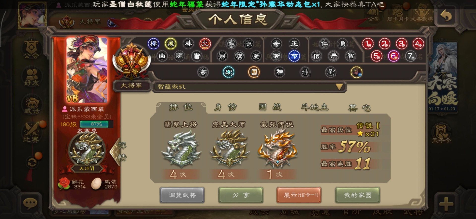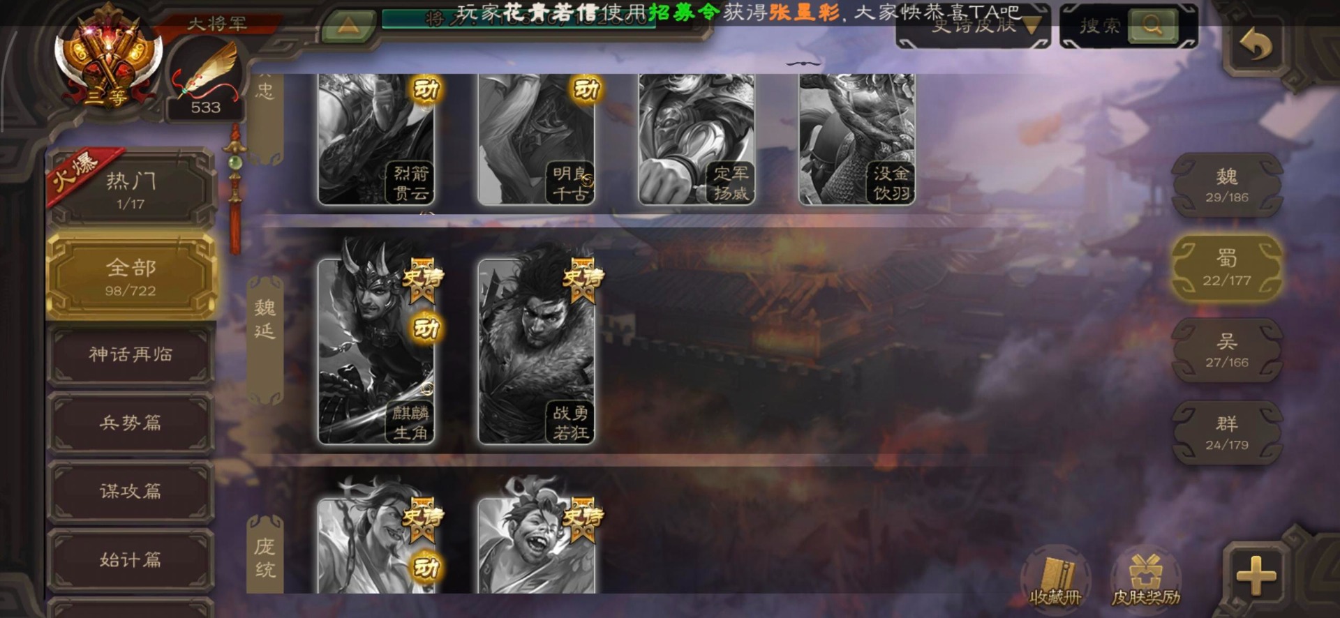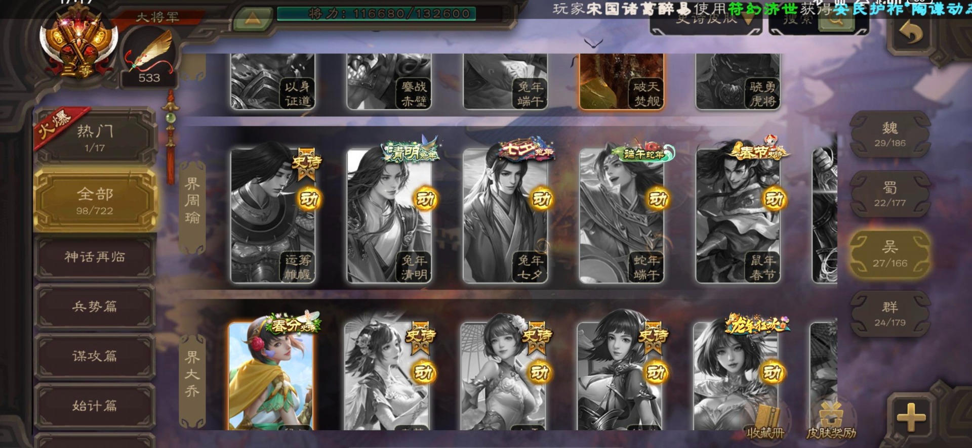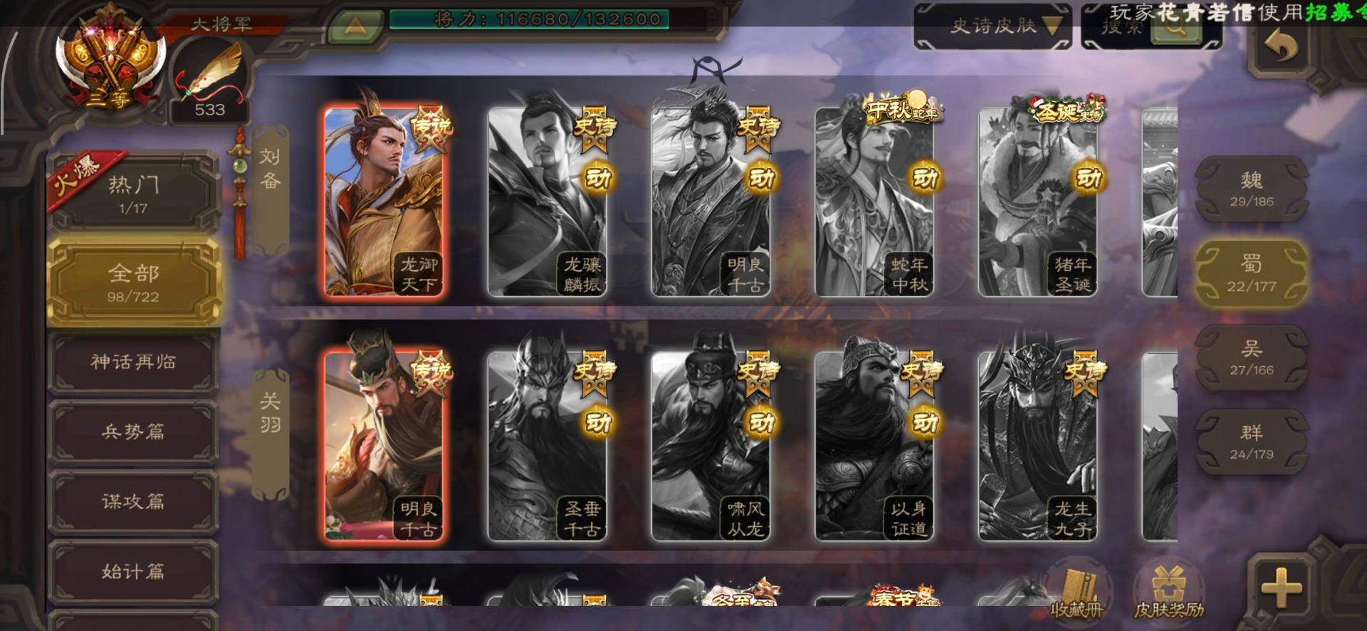 [16303485]vip8 大将军 350武将 46动态皮肤 40史诗武将 41宝珠 【魏国武将】势·钟会清河公主势辛宪英星周不疑王元姬程昱陈琳曹婴曹纯戏志才 【蜀国武将】谋诸葛亮谋赵云谋马超诸葛瞻张星彩沙摩柯谯周花鬘董允谋关羽 【吴国武将】势太史慈势陆郁生界徐盛 【群国武将】群-司马昭界沮授左慈张让星甘宁兀突骨麹义南华老仙沮授界左慈界李儒谋张角公孙瓒