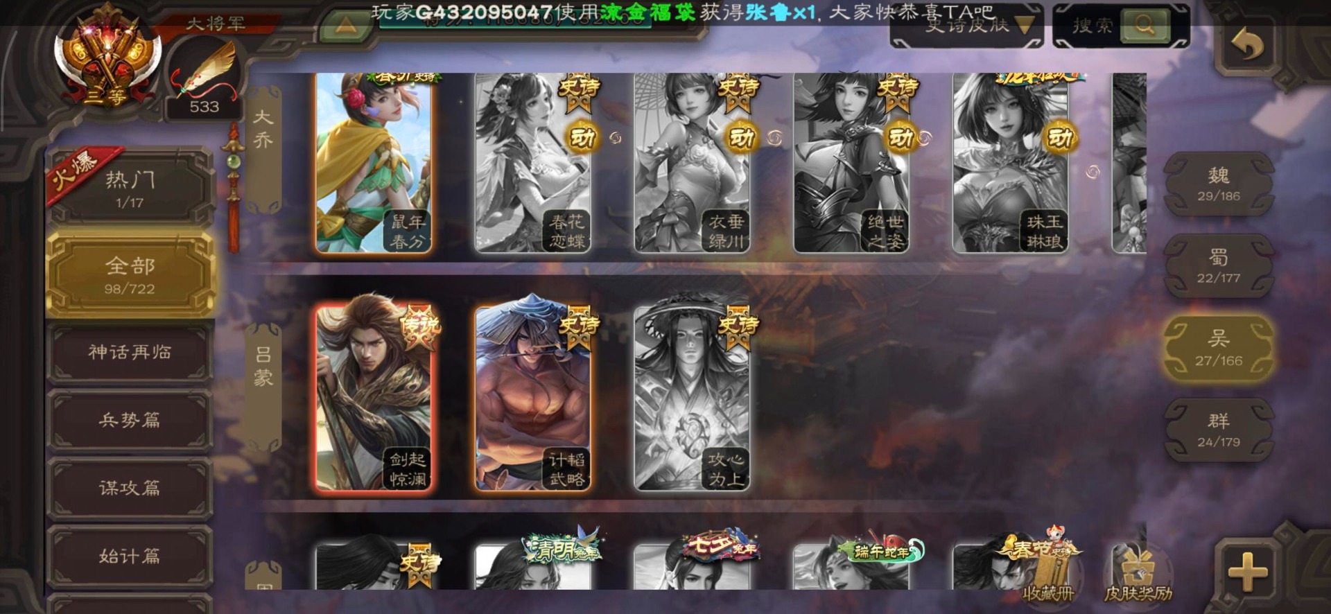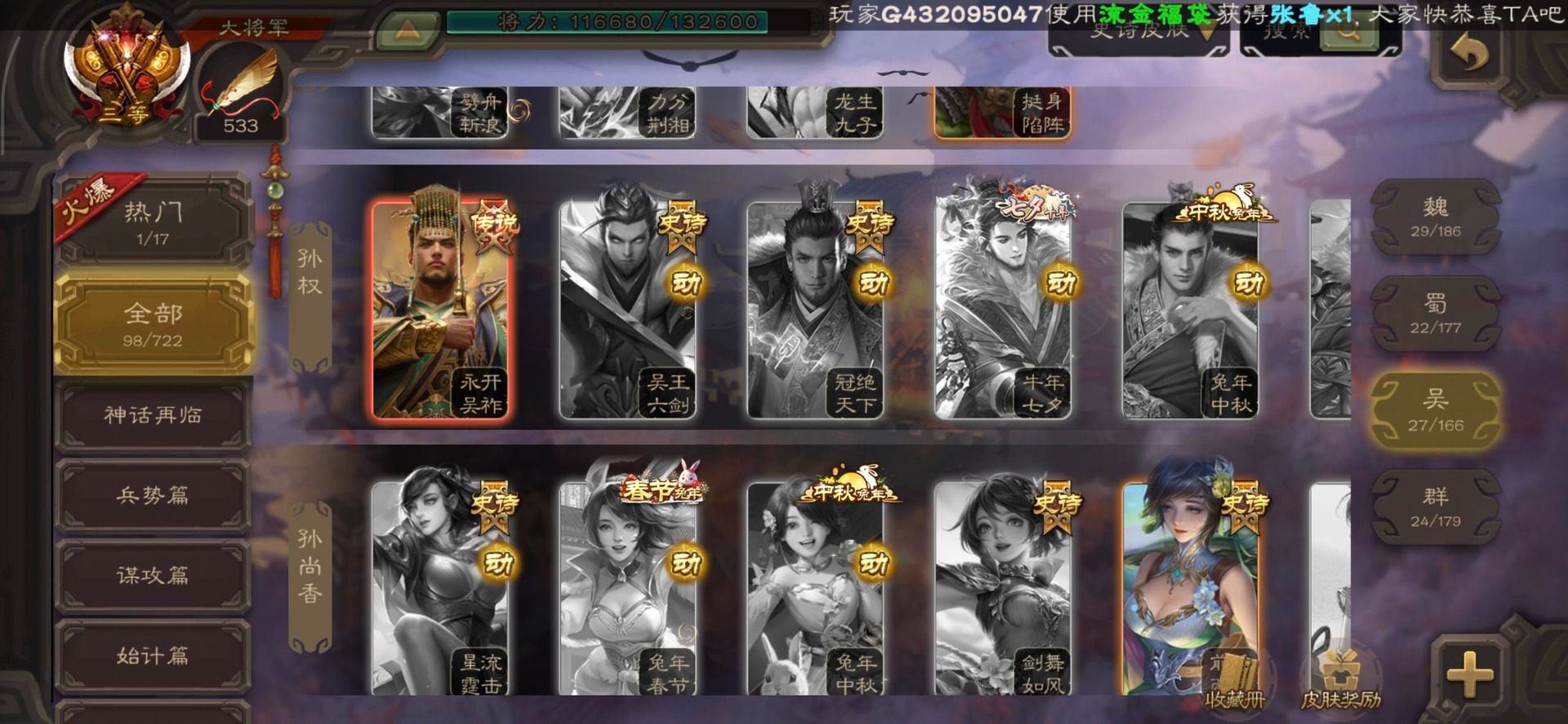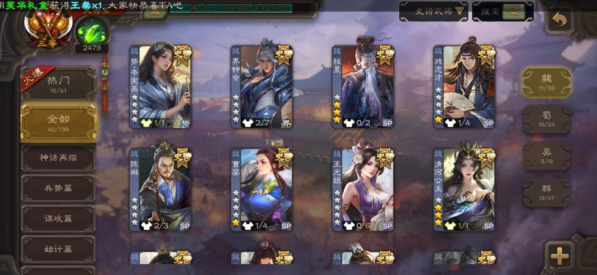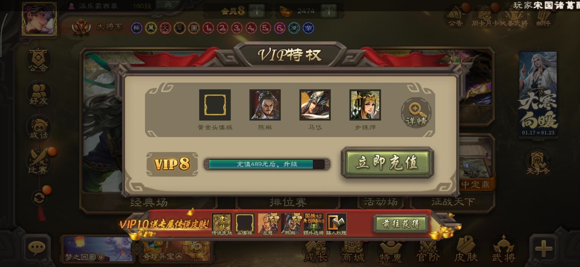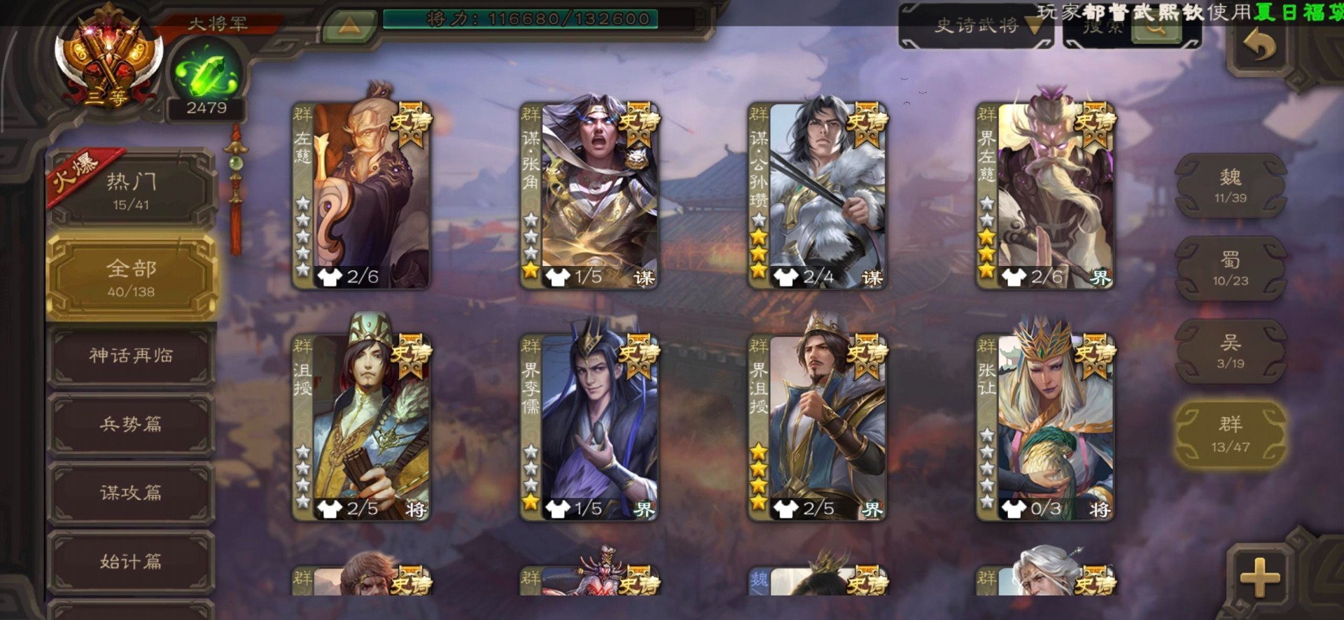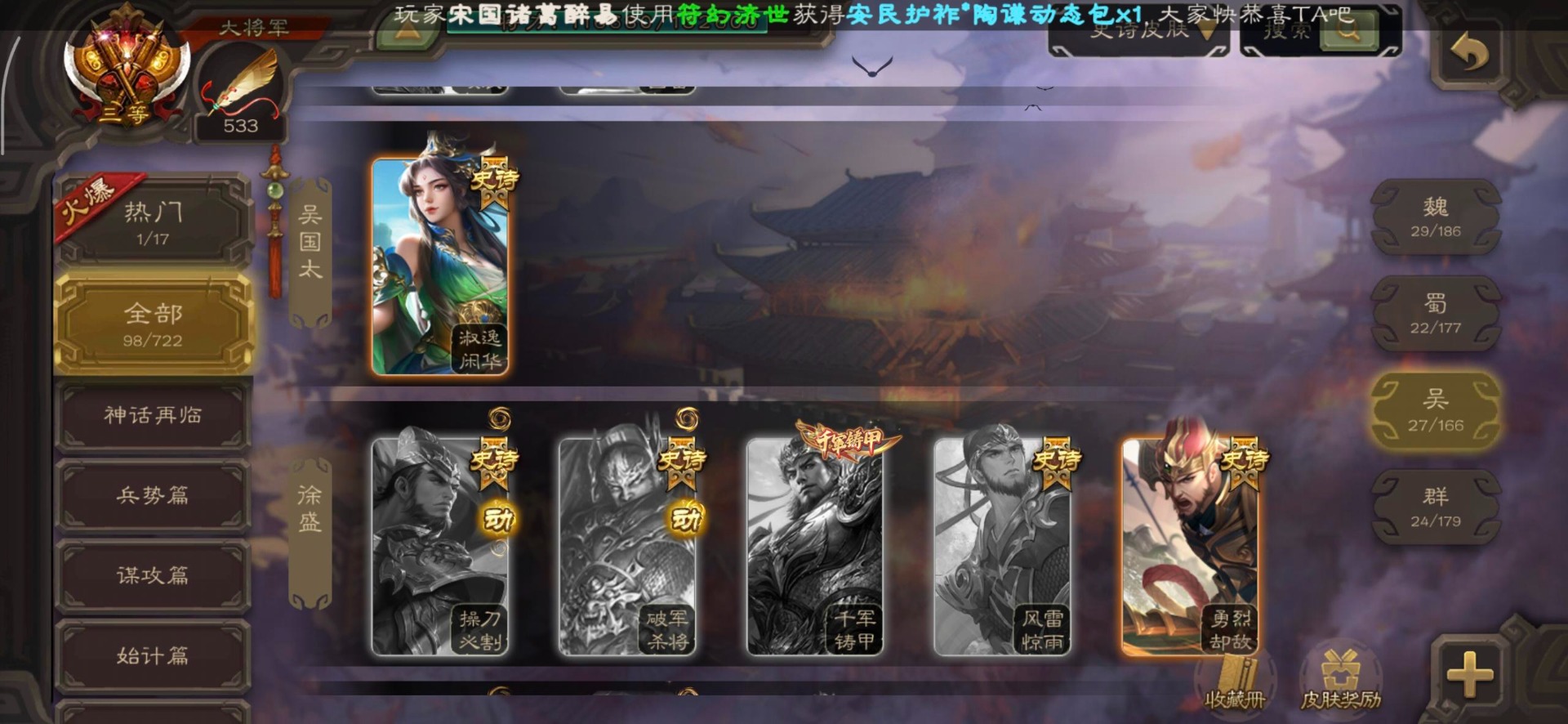 [16303485]vip8 大将军 350武将 46动态皮肤 40史诗武将 41宝珠 【魏国武将】势·钟会清河公主势辛宪英星周不疑王元姬程昱陈琳曹婴曹纯戏志才 【蜀国武将】谋诸葛亮谋赵云谋马超诸葛瞻张星彩沙摩柯谯周花鬘董允谋关羽 【吴国武将】势太史慈势陆郁生界徐盛 【群国武将】群-司马昭界沮授左慈张让星甘宁兀突骨麹义南华老仙沮授界左慈界李儒谋张角公孙瓒