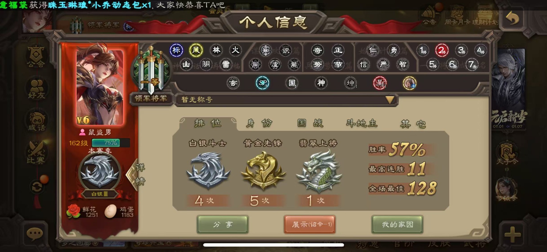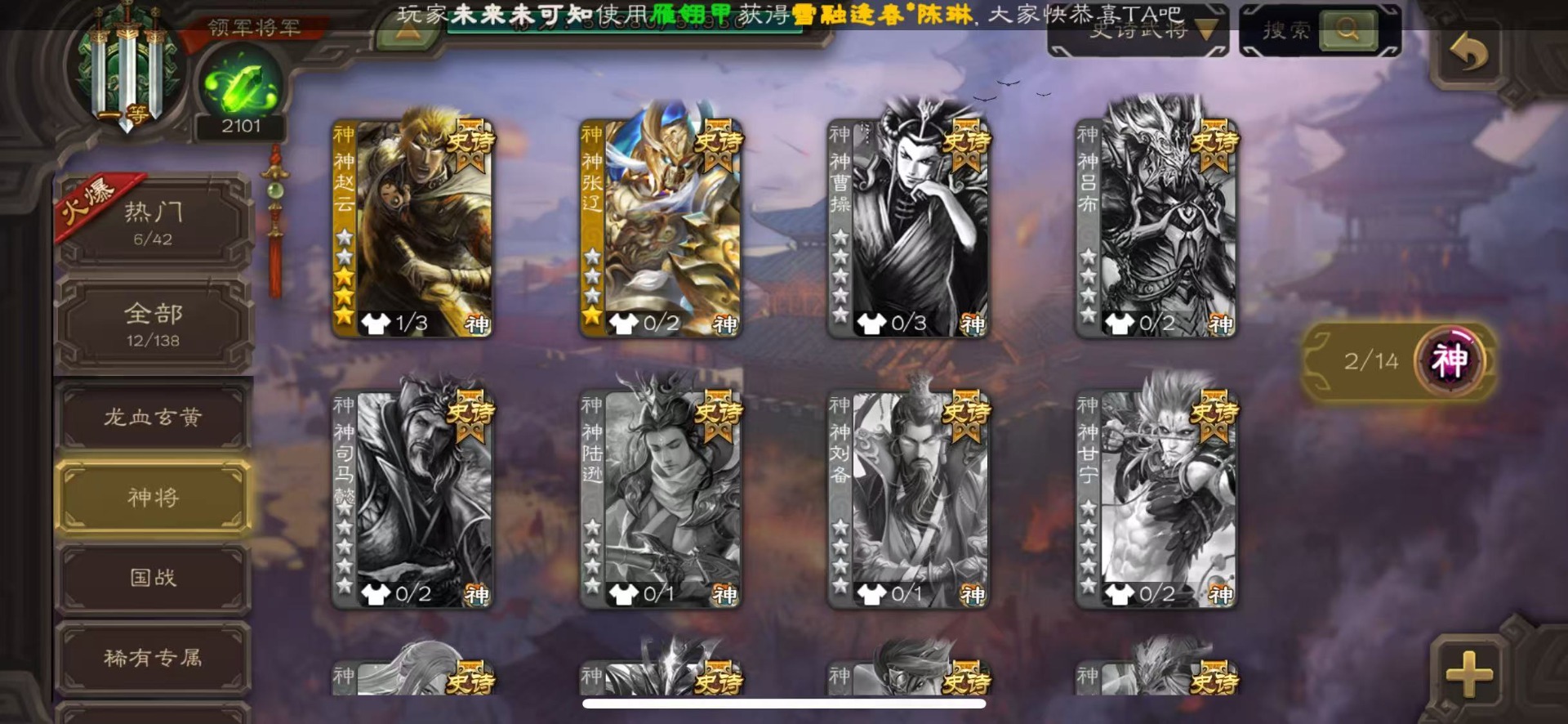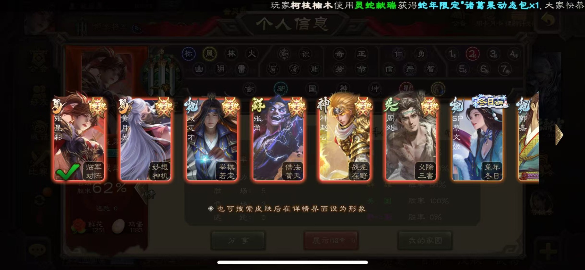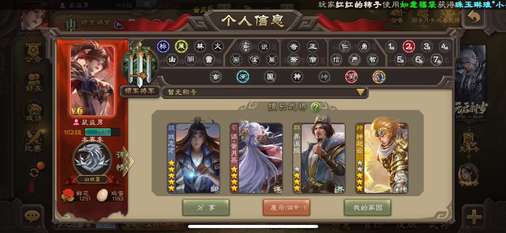 [16324316]vip6 领军将军 228武将 7动态皮肤 12史诗武将 44宝珠 【神将】神赵云神张辽 【魏国武将】程昱曹纯戏志才 【蜀国武将】谋赵云界黄忠花鬘 【吴国武将】骆统 【群国武将】界沮授左慈星甘宁