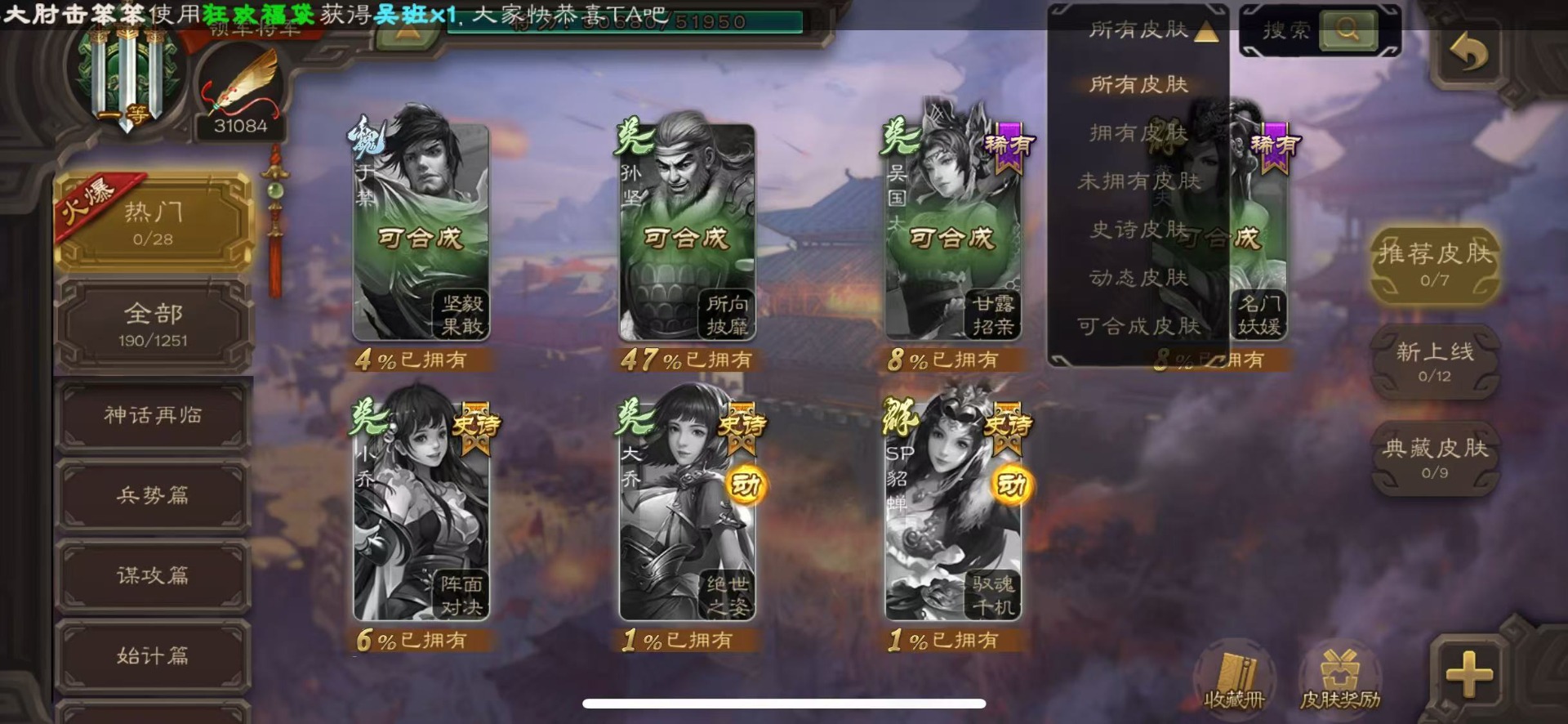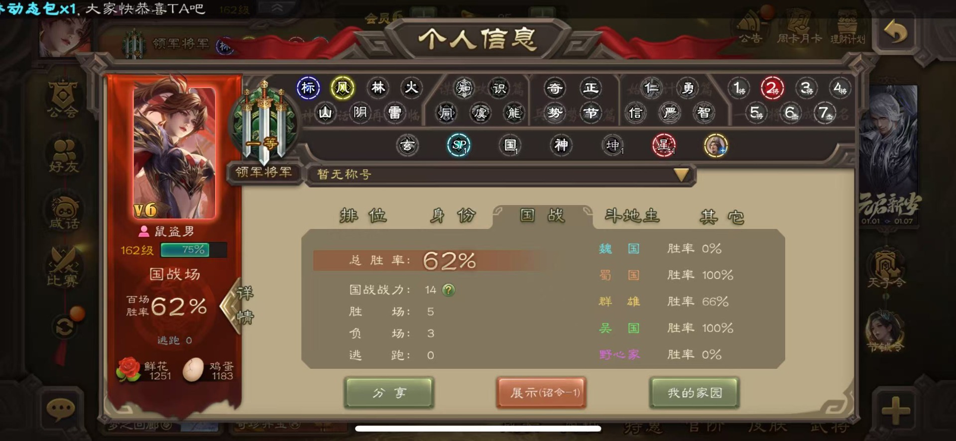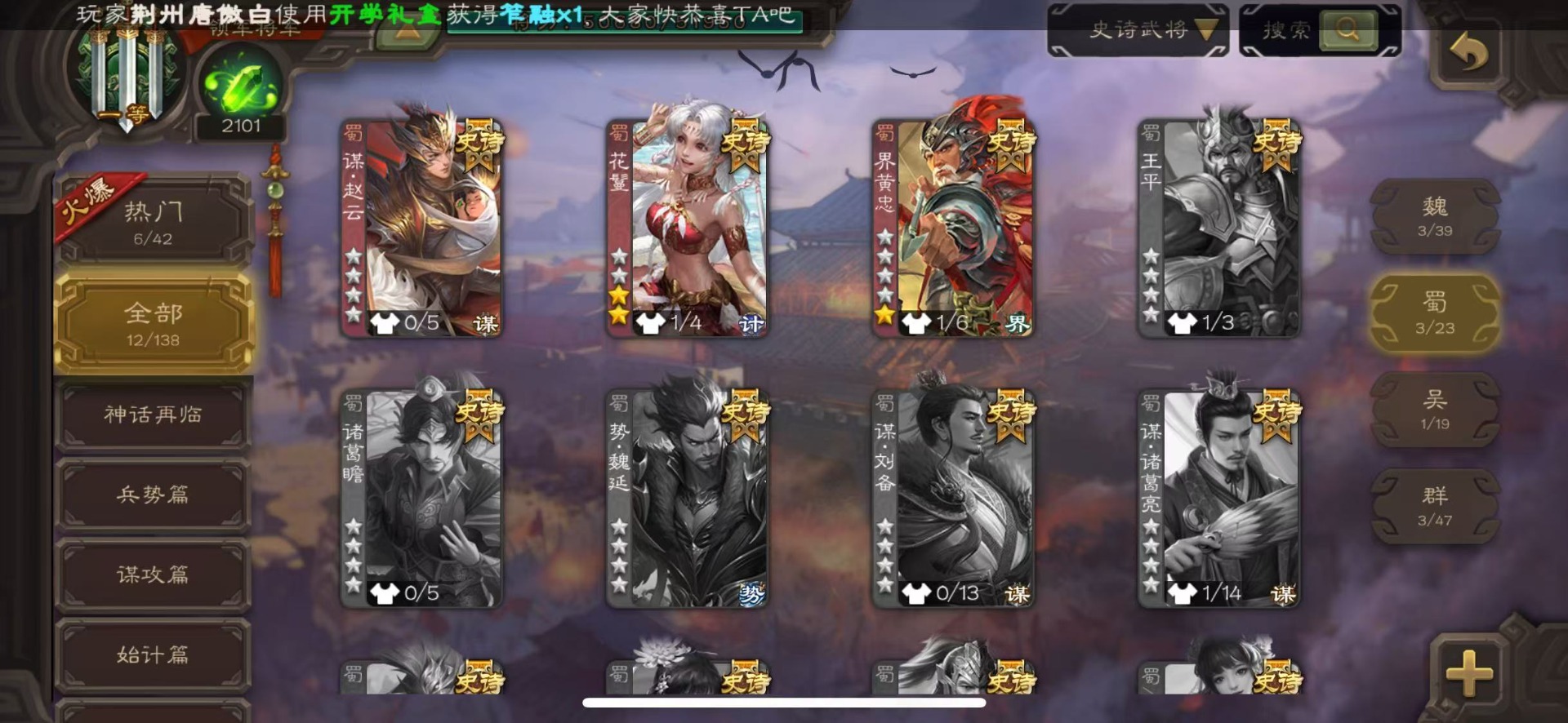 [16324316]vip6 领军将军 228武将 7动态皮肤 12史诗武将 44宝珠 【神将】神赵云神张辽 【魏国武将】程昱曹纯戏志才 【蜀国武将】谋赵云界黄忠花鬘 【吴国武将】骆统 【群国武将】界沮授左慈星甘宁